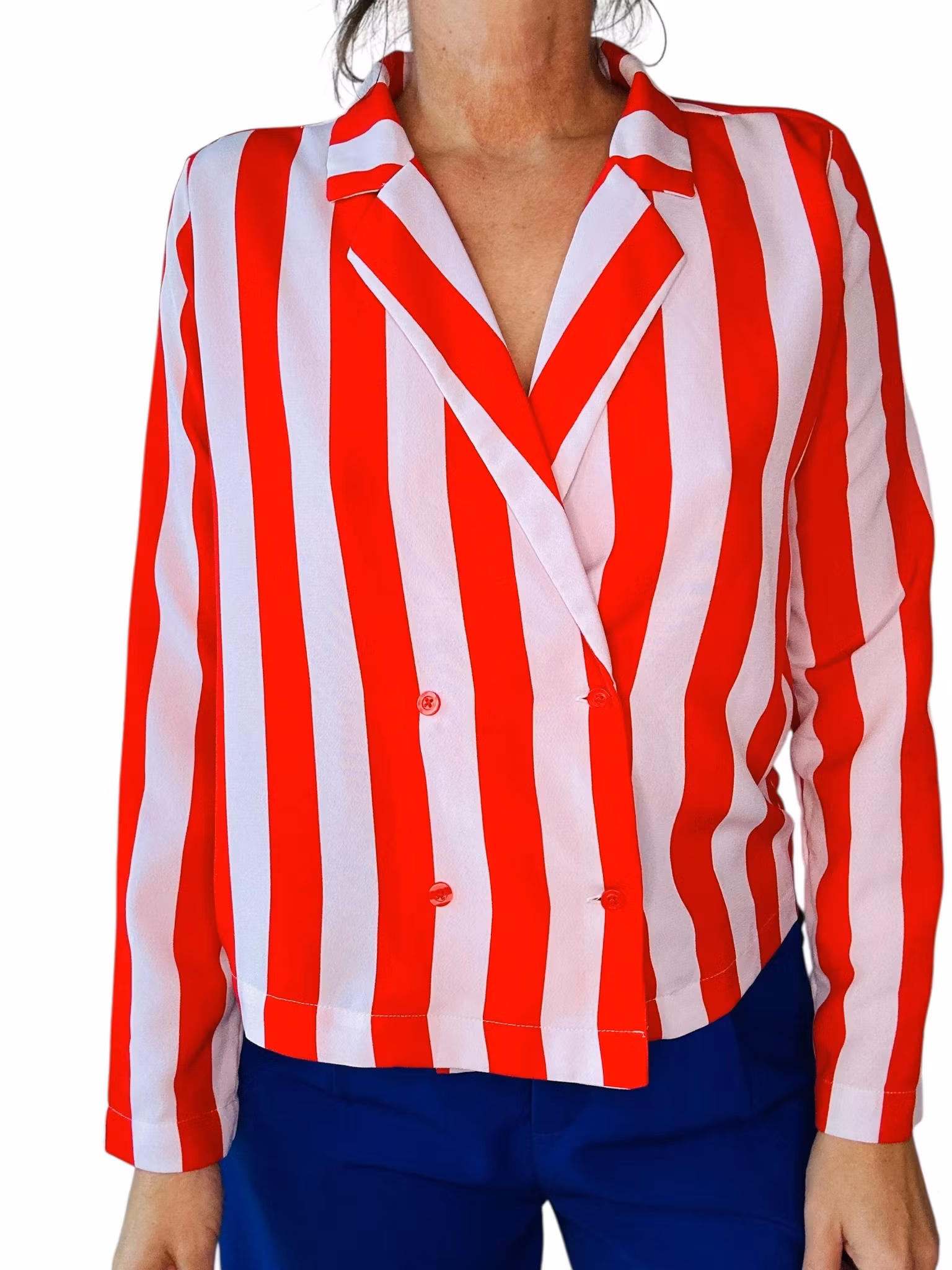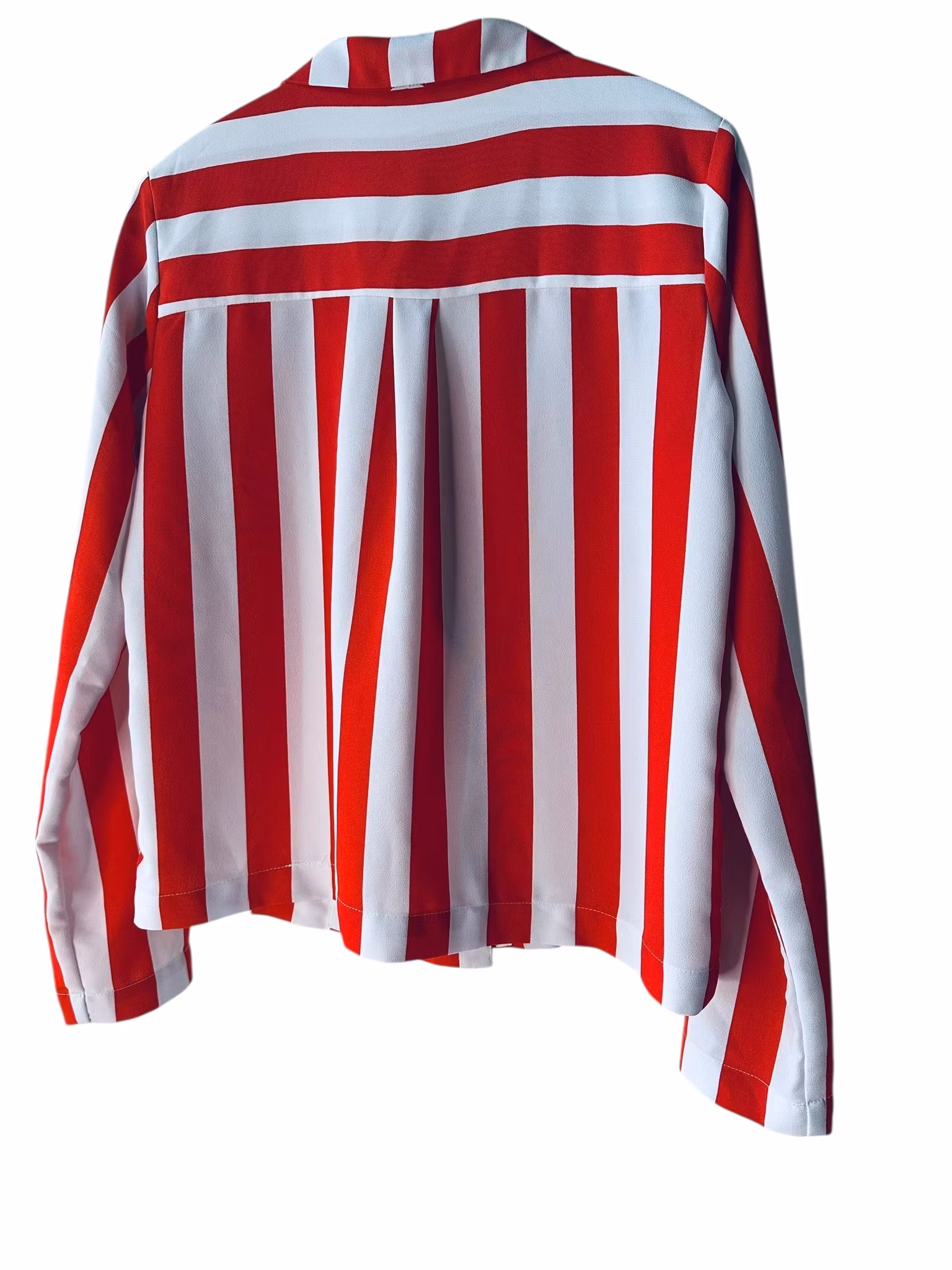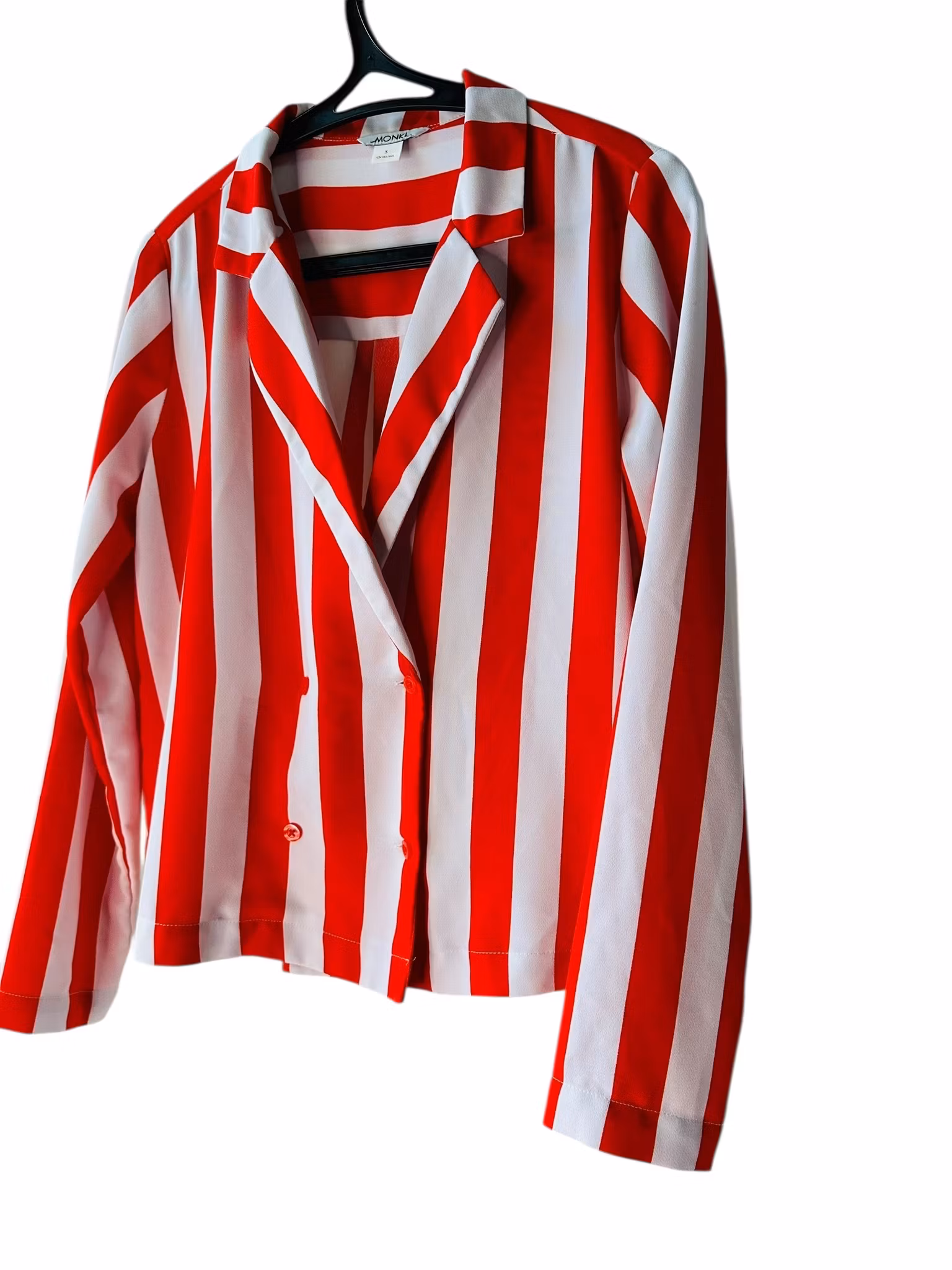 Beskrivning: Den här härliga kavajblusen från Monki är värdig vilken cirkusdirektör som helst, en estetik vi tycker är urkul! Kort och croppad modell i tunt material och breda röda och vita ränder! What's not to like?