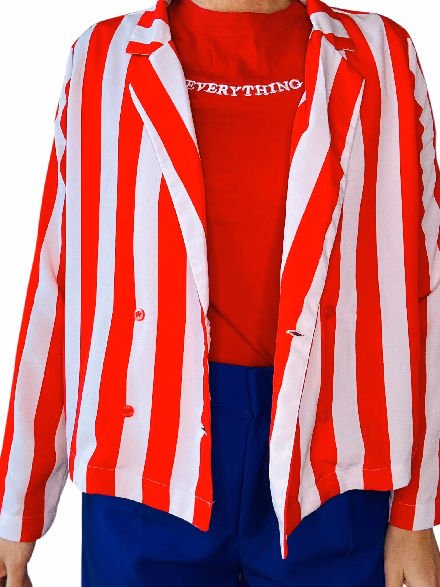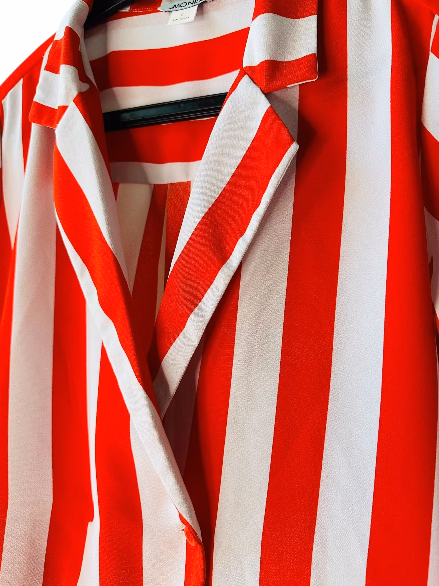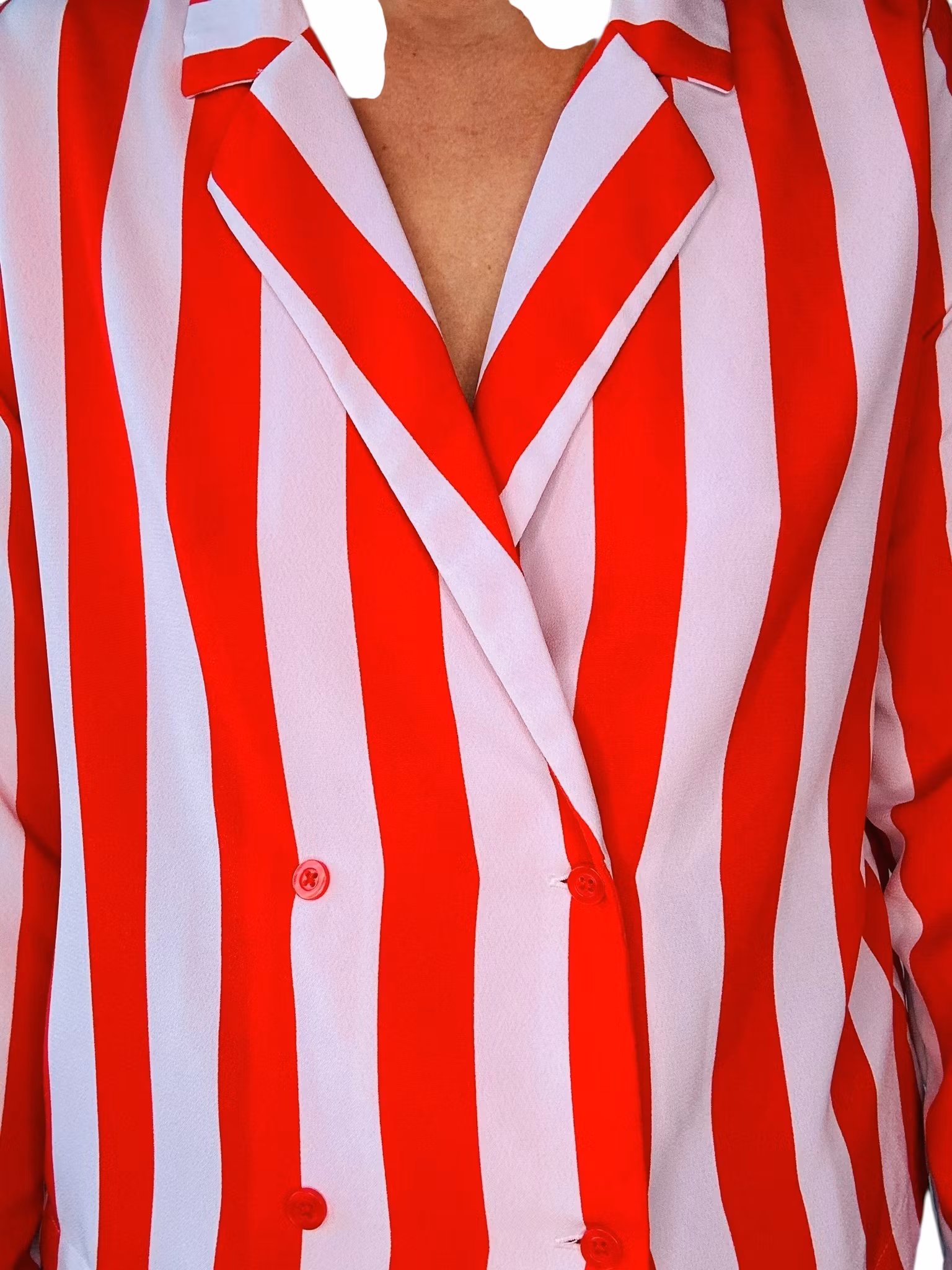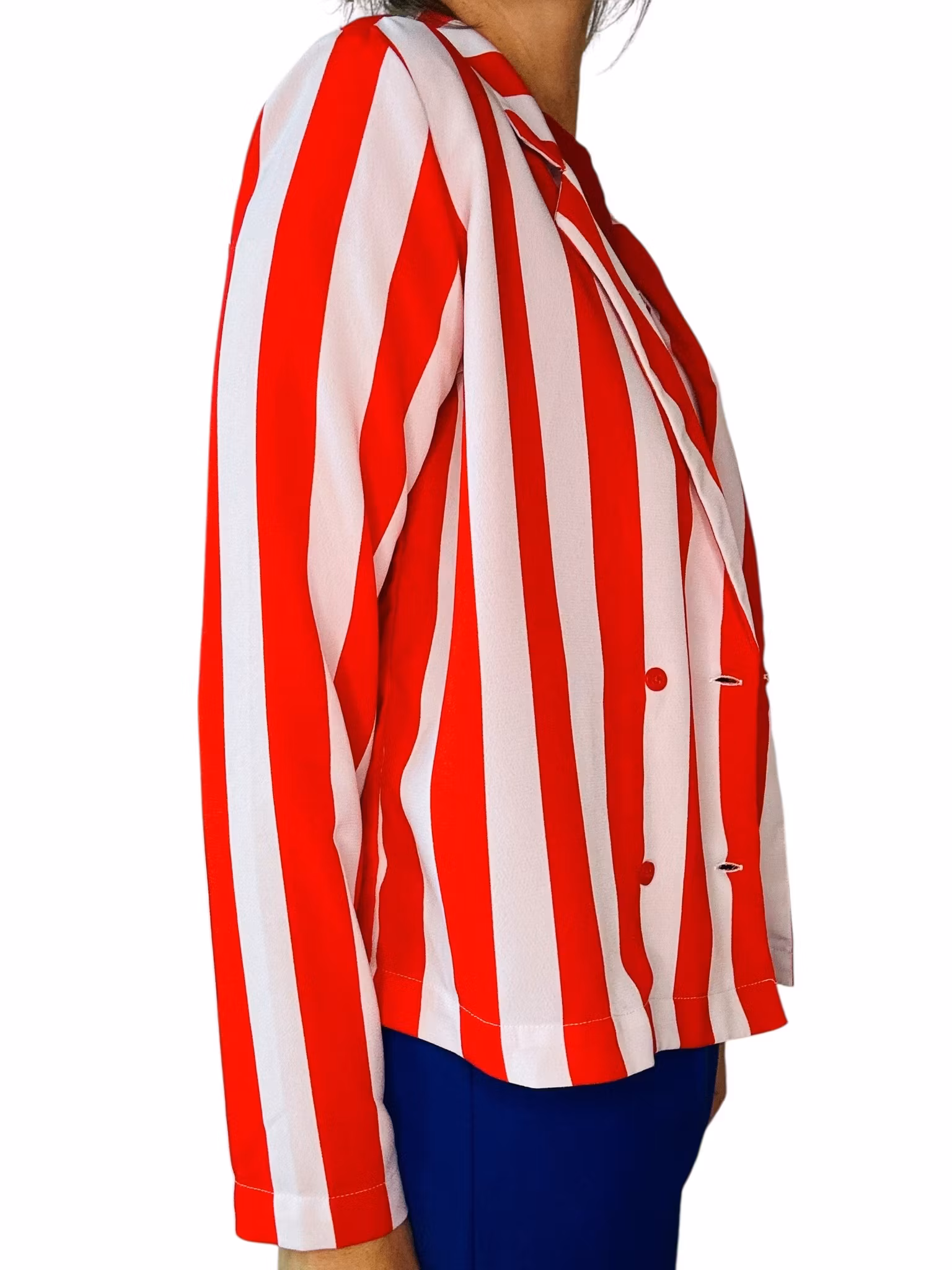 Beskrivning: Den här härliga kavajblusen från Monki är värdig vilken cirkusdirektör som helst, en estetik vi tycker är urkul! Kort och croppad modell i tunt material och breda röda och vita ränder! What's not to like?