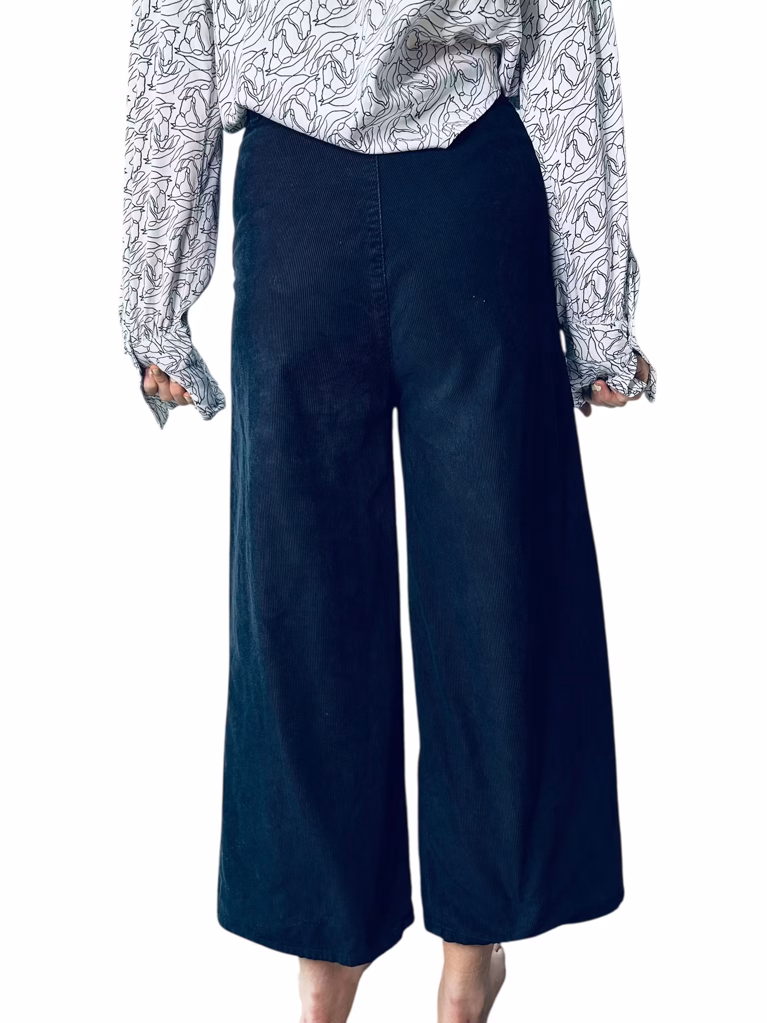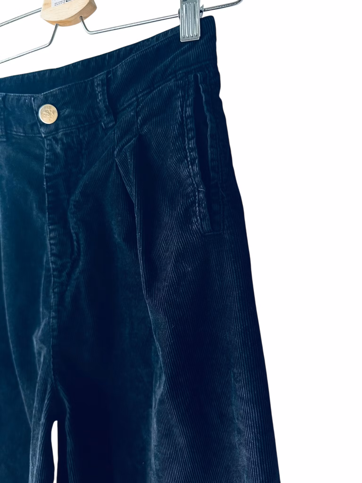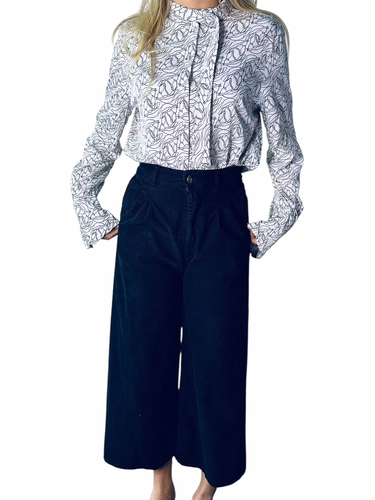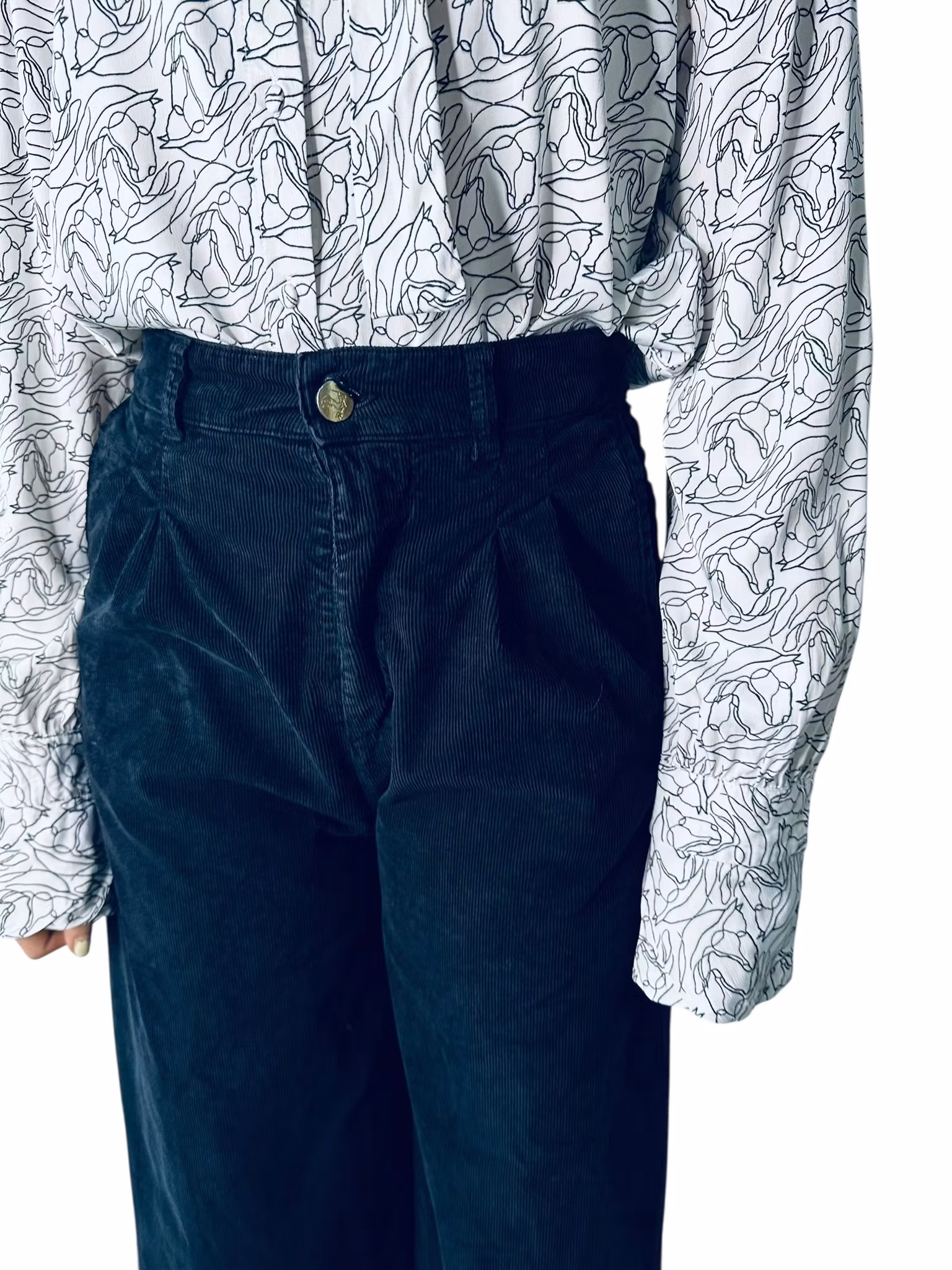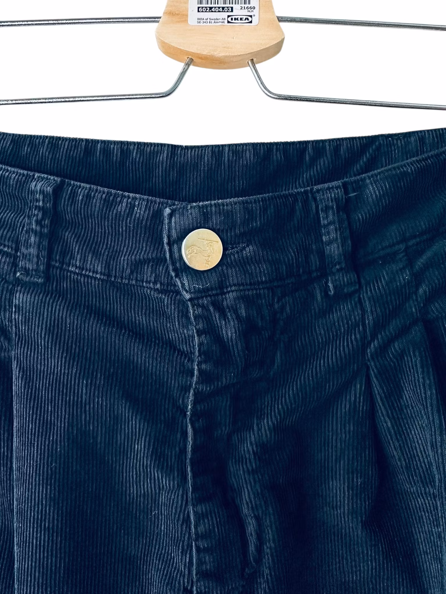 Beskrivning: Rodebjers klassiska bralla Mina med hög midja, veckad front och utställda lite kortare ben. Här i den ovanliga och populära varianten i manchester.