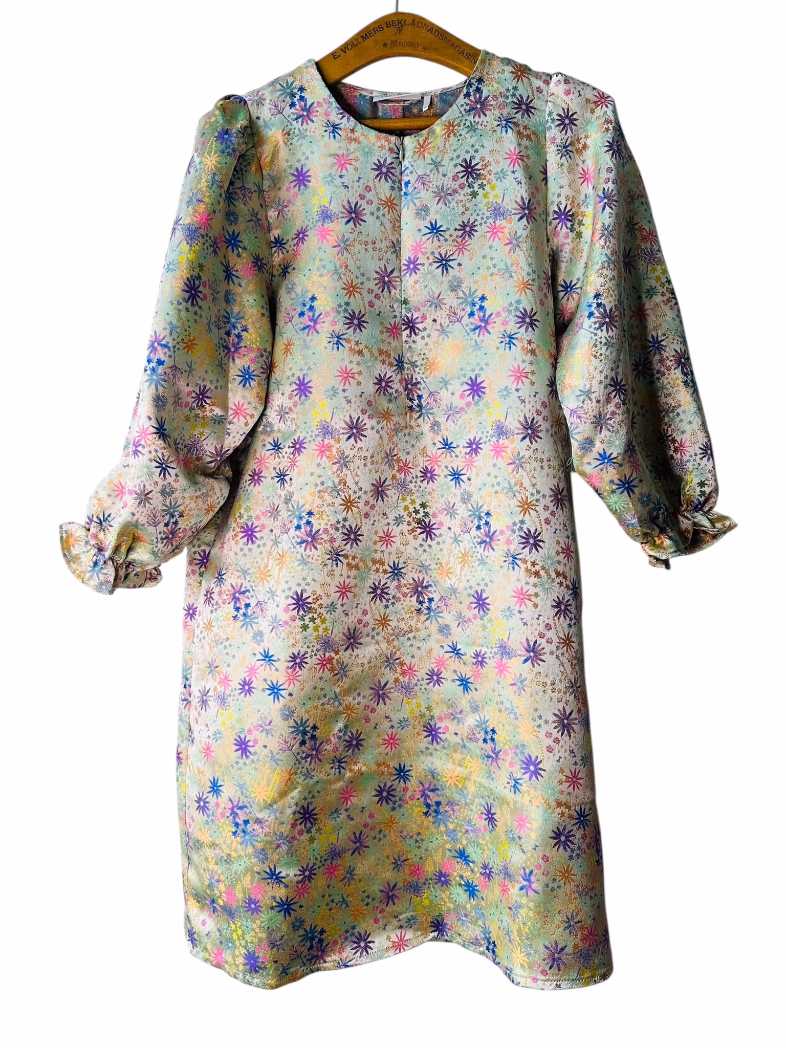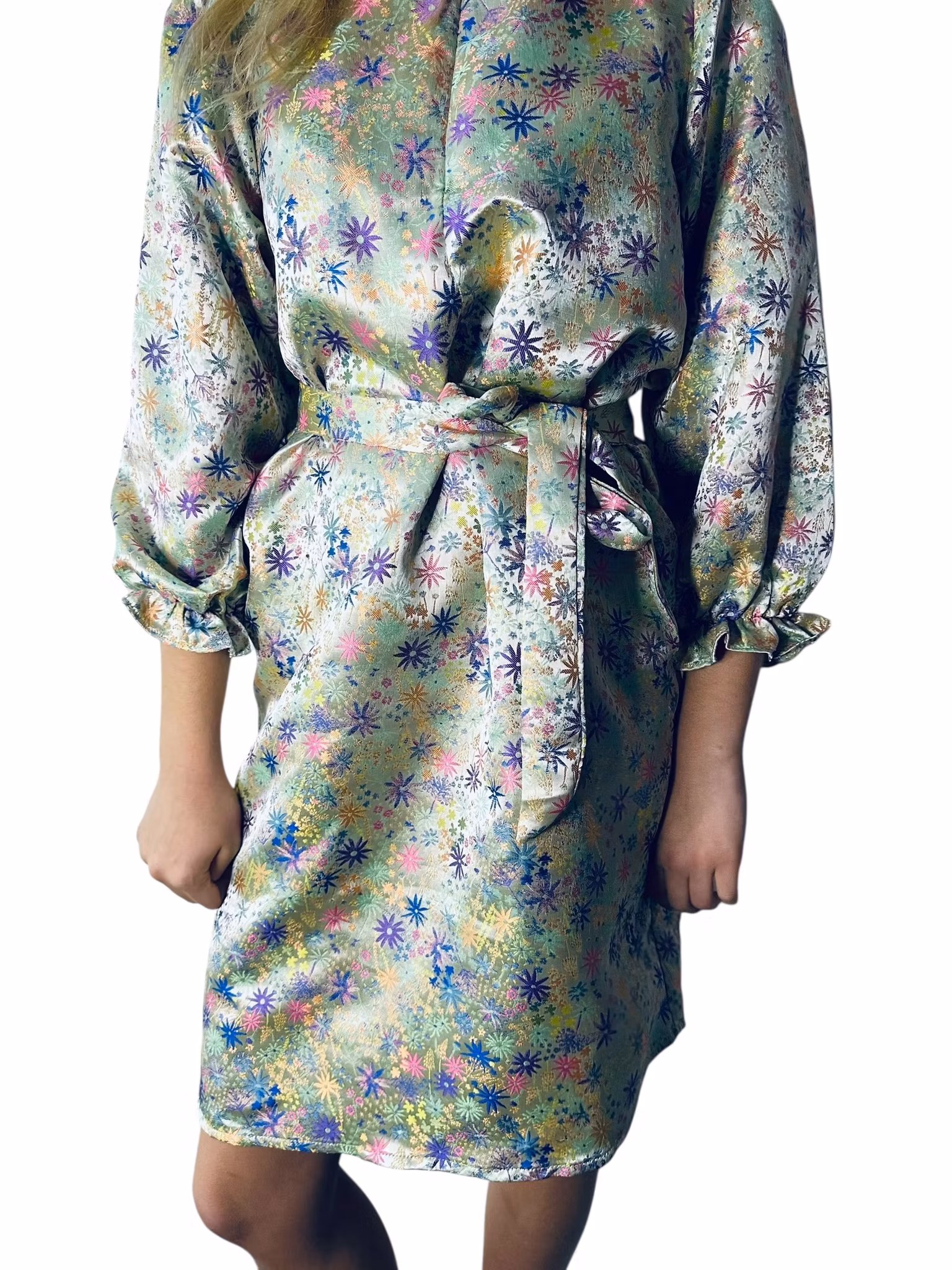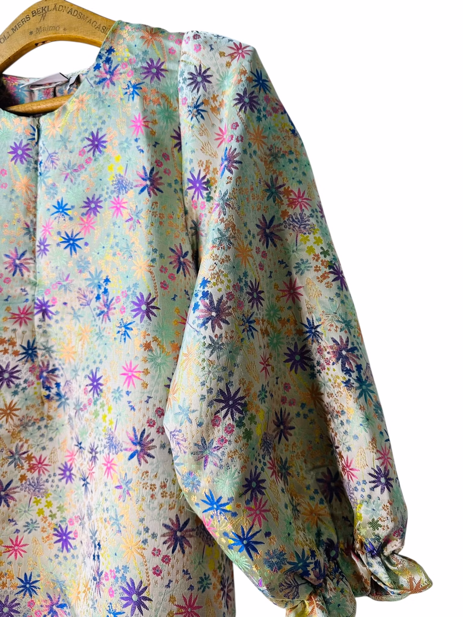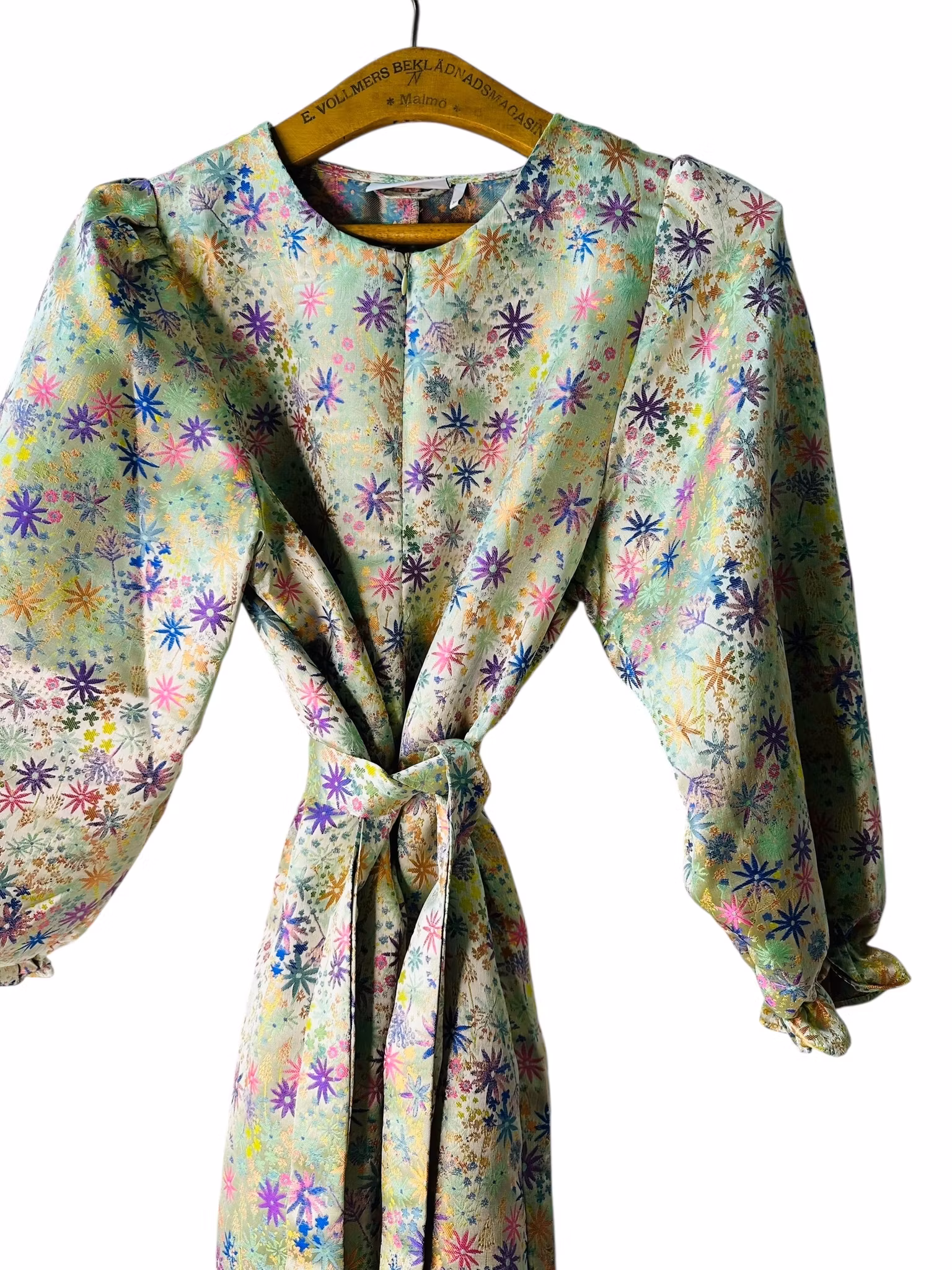 Beskrivning: Skimrande, småblommig klänning i härliga färger från danska Moves. Puffig ärm, rak form och en liten dragkedja i halsen. Det finns ett tillhörande bälte att ha i midjan om en vill. Fin också med en meshtröja under.