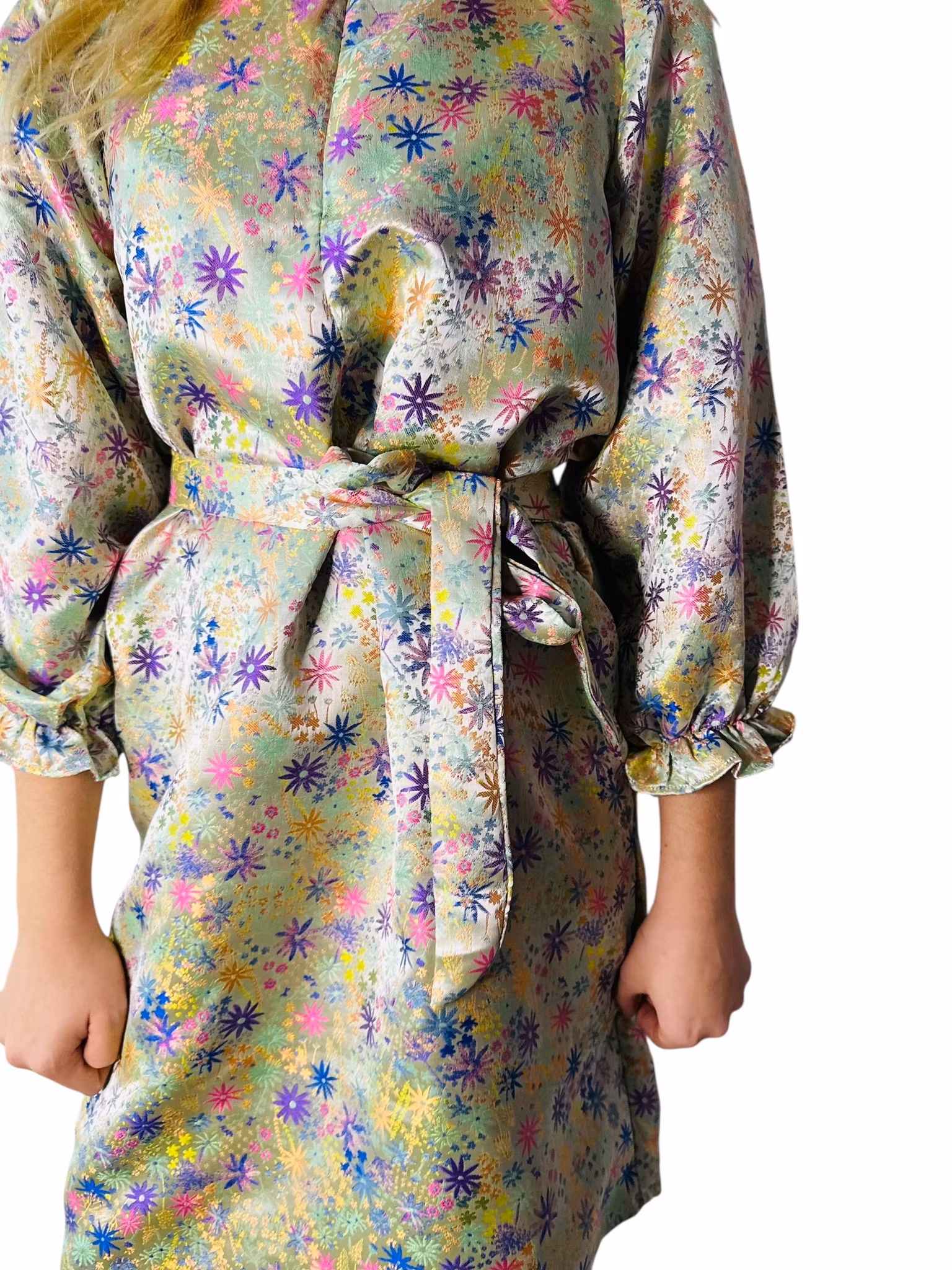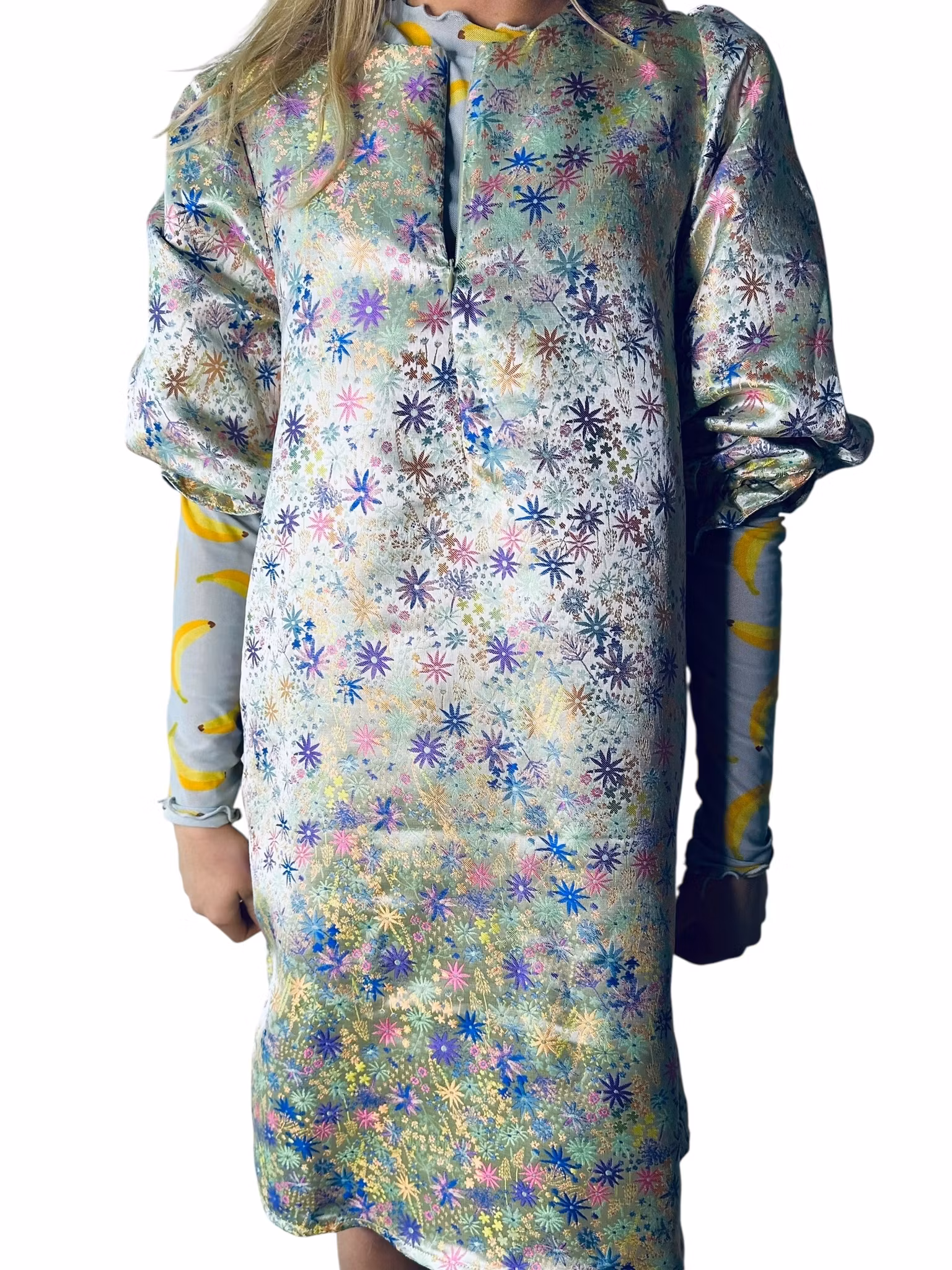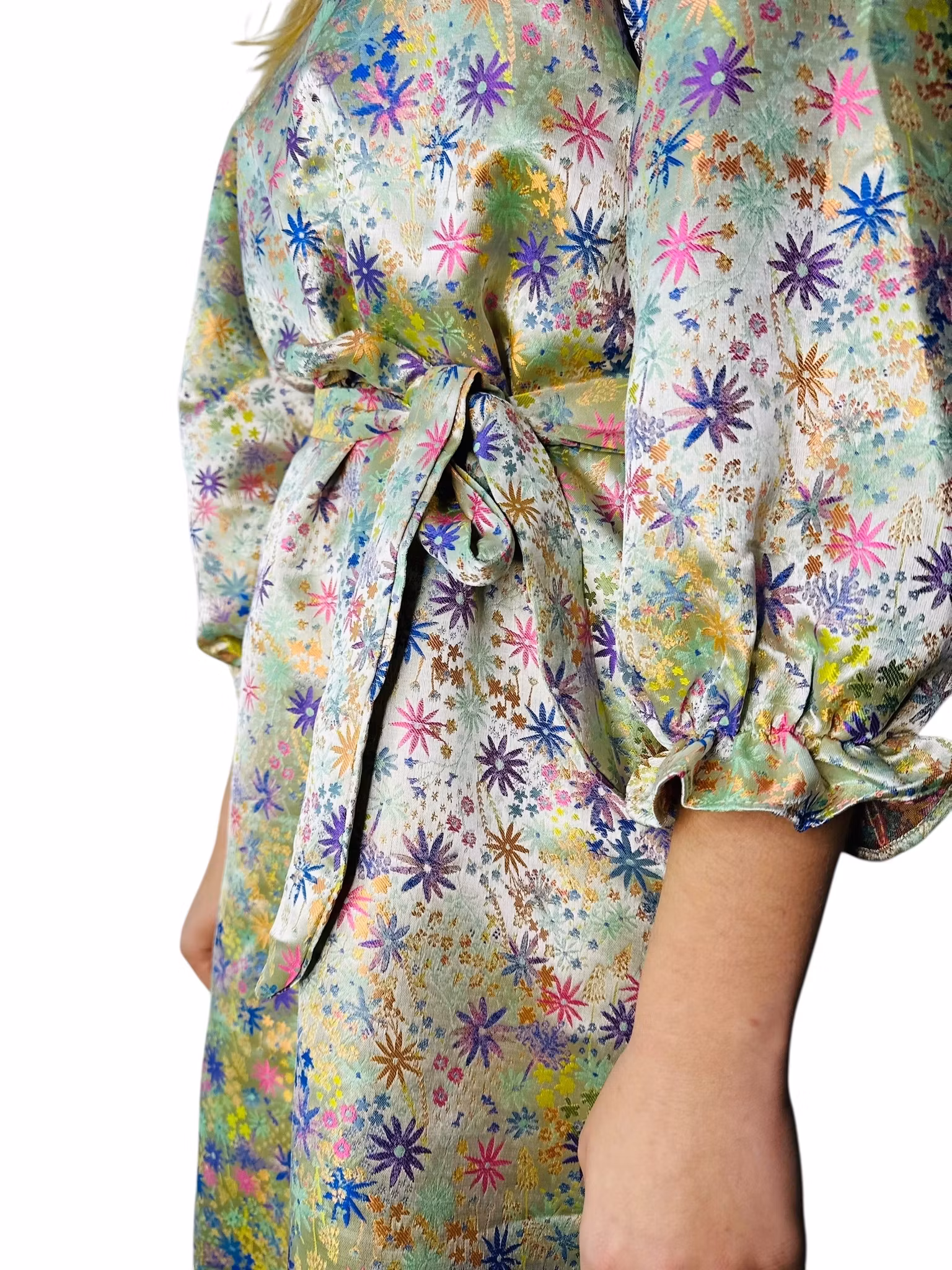 Beskrivning: Skimrande, småblommig klänning i härliga färger från danska Moves. Puffig ärm, rak form och en liten dragkedja i halsen. Det finns ett tillhörande bälte att ha i midjan om en vill. Fin också med en meshtröja under.