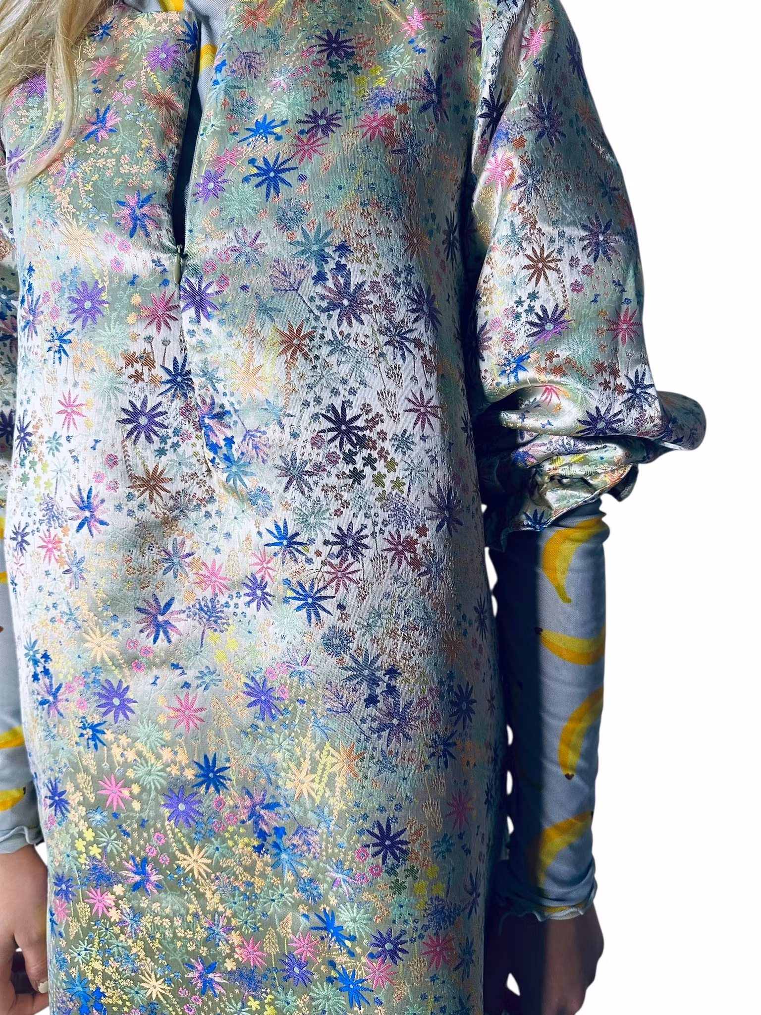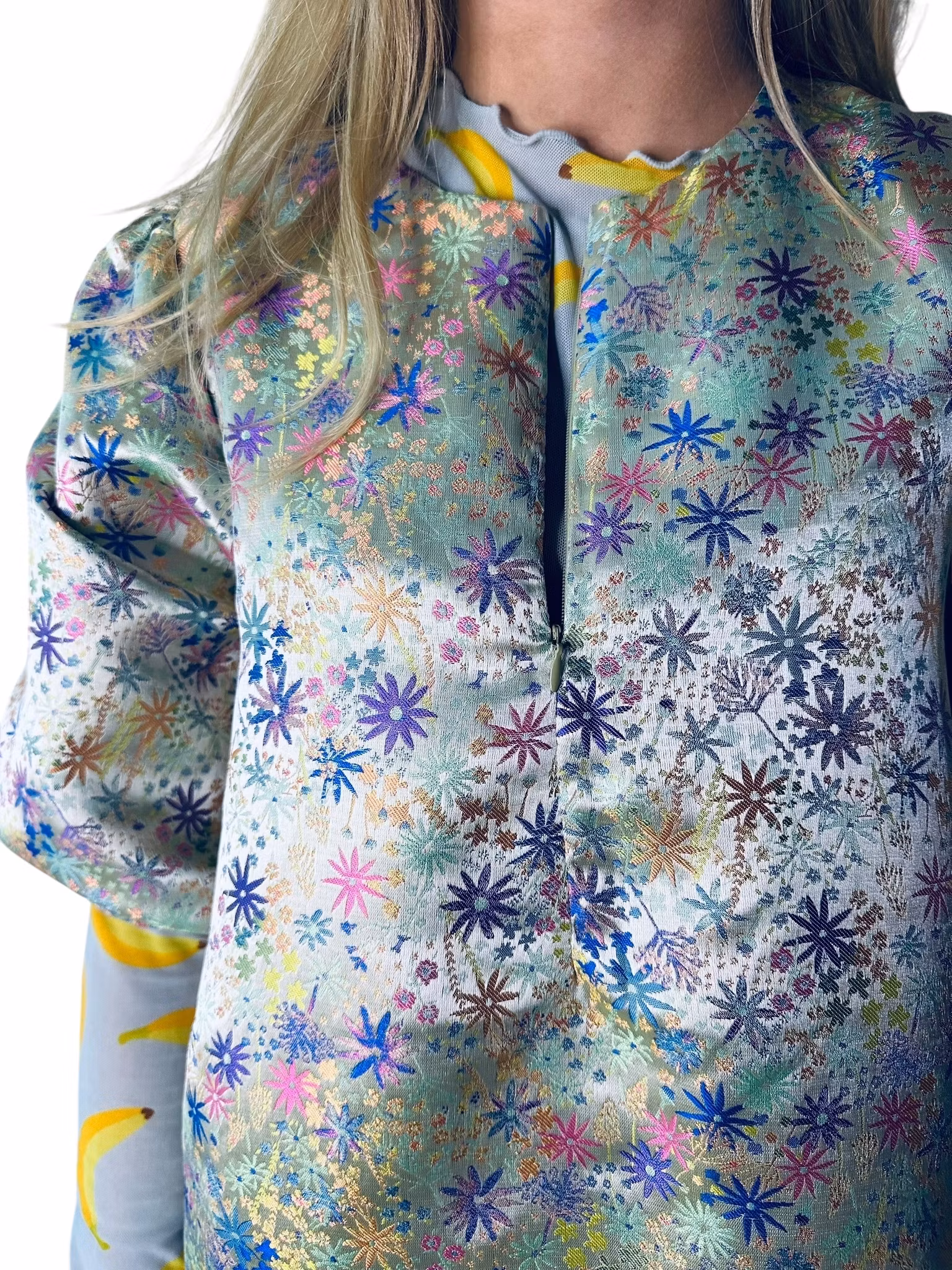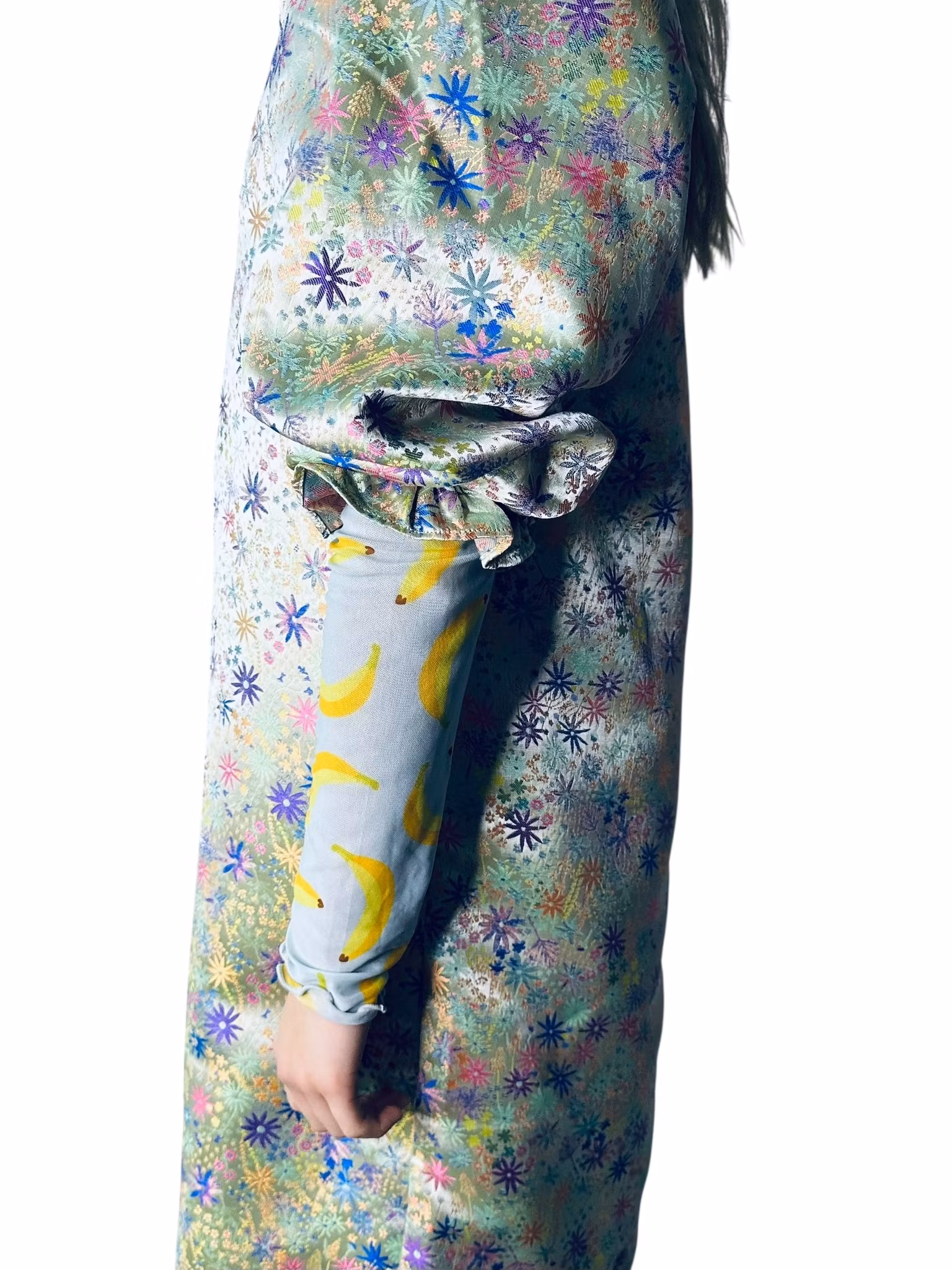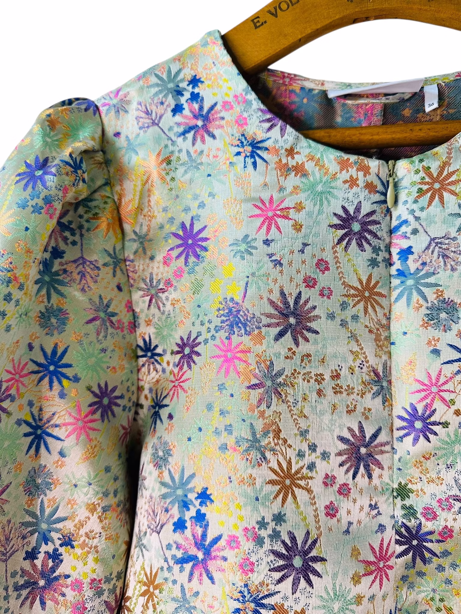Beskrivning: Skimrande, småblommig klänning i härliga färger från danska Moves. Puffig ärm, rak form och en liten dragkedja i halsen. Det finns ett tillhörande bälte att ha i midjan om en vill. Fin också med en meshtröja under.