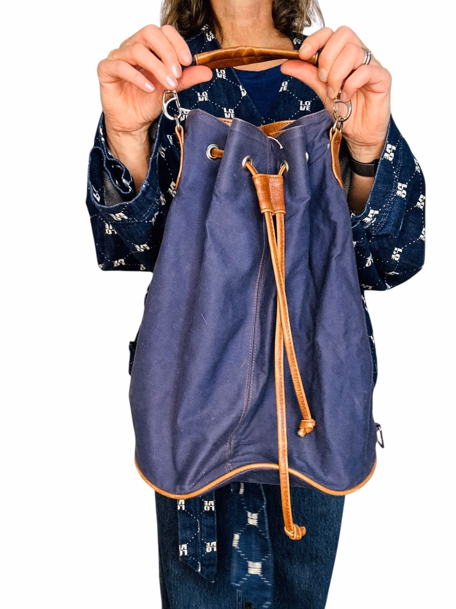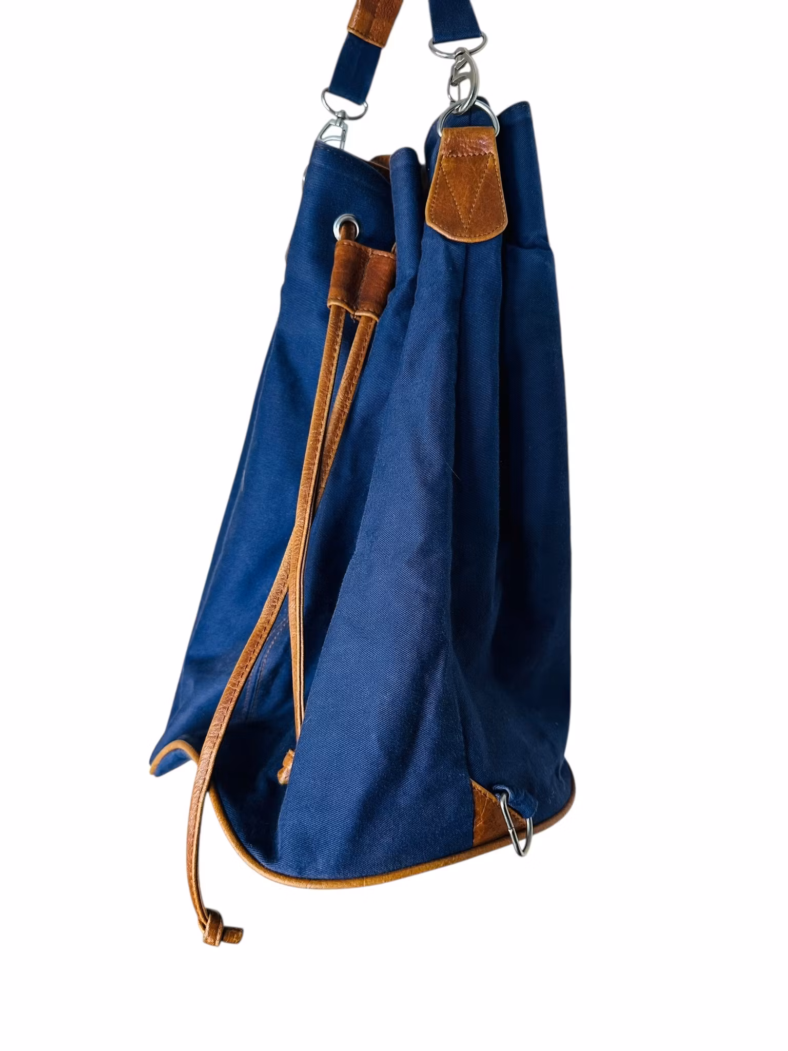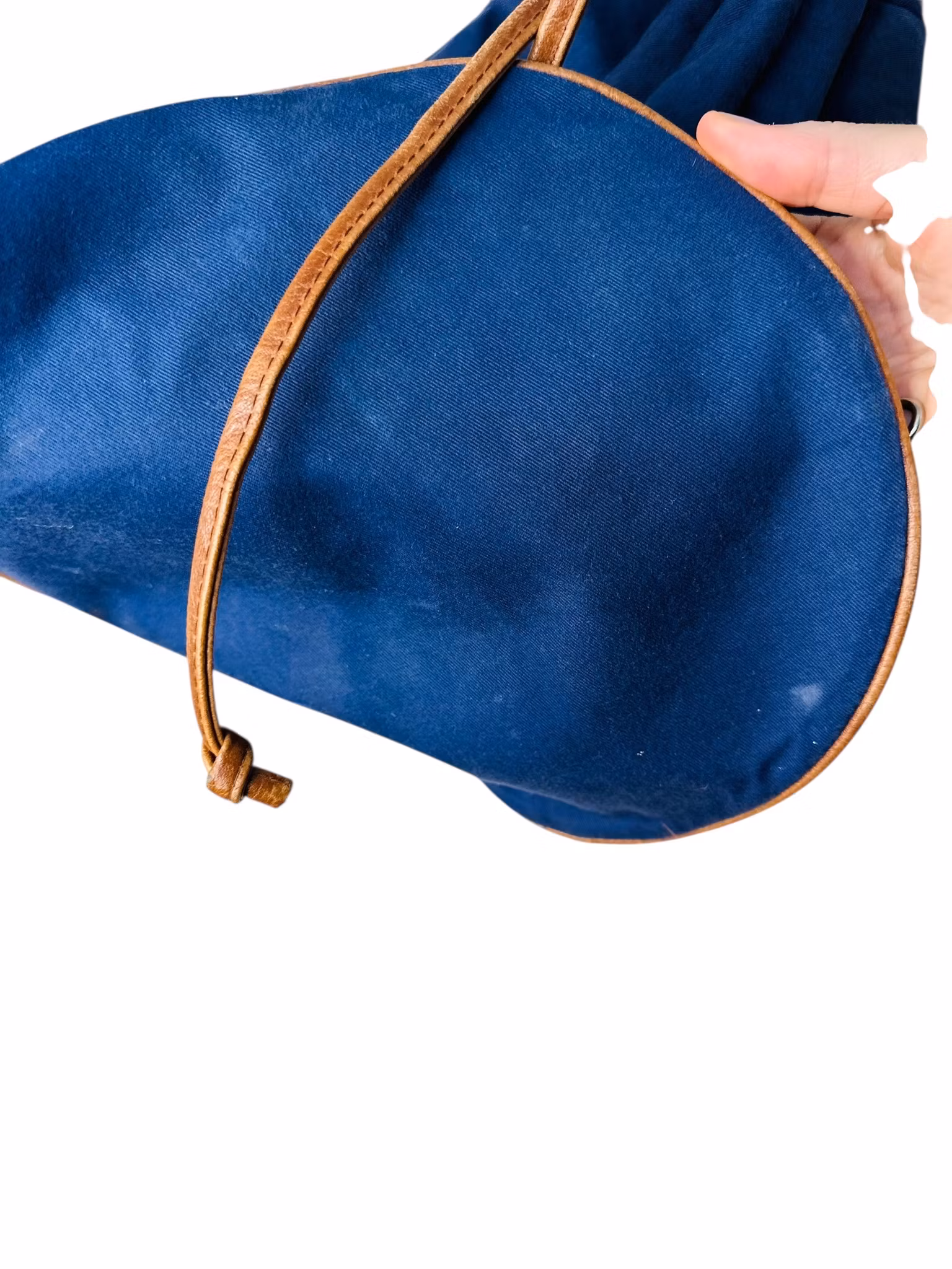 Beskrivning: En vintage väska i blå canvas med bruna läderdetaljer. Bucketform med liten ficka inuti.