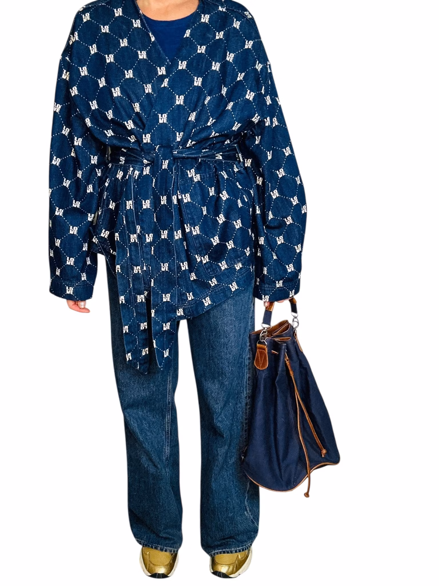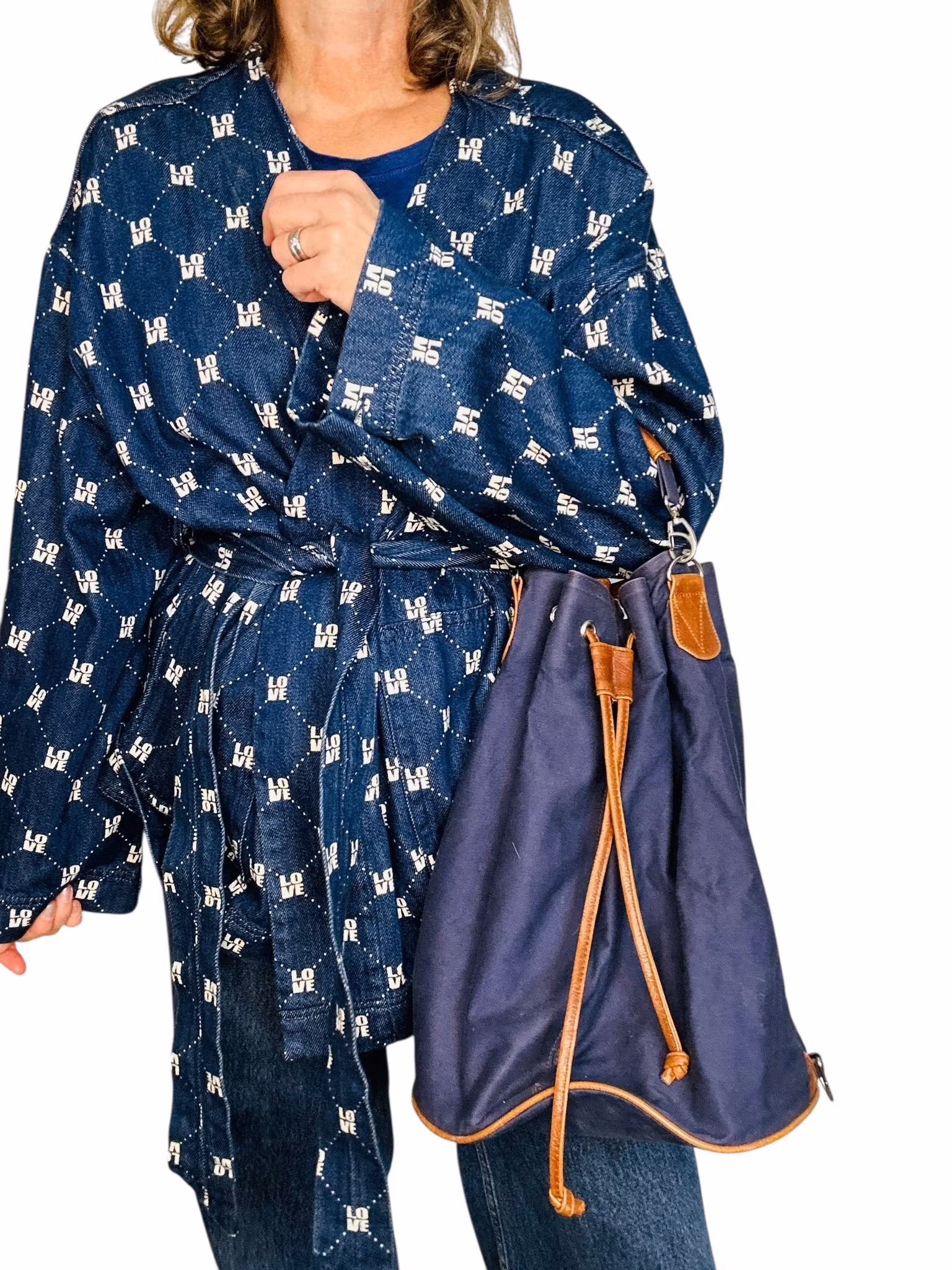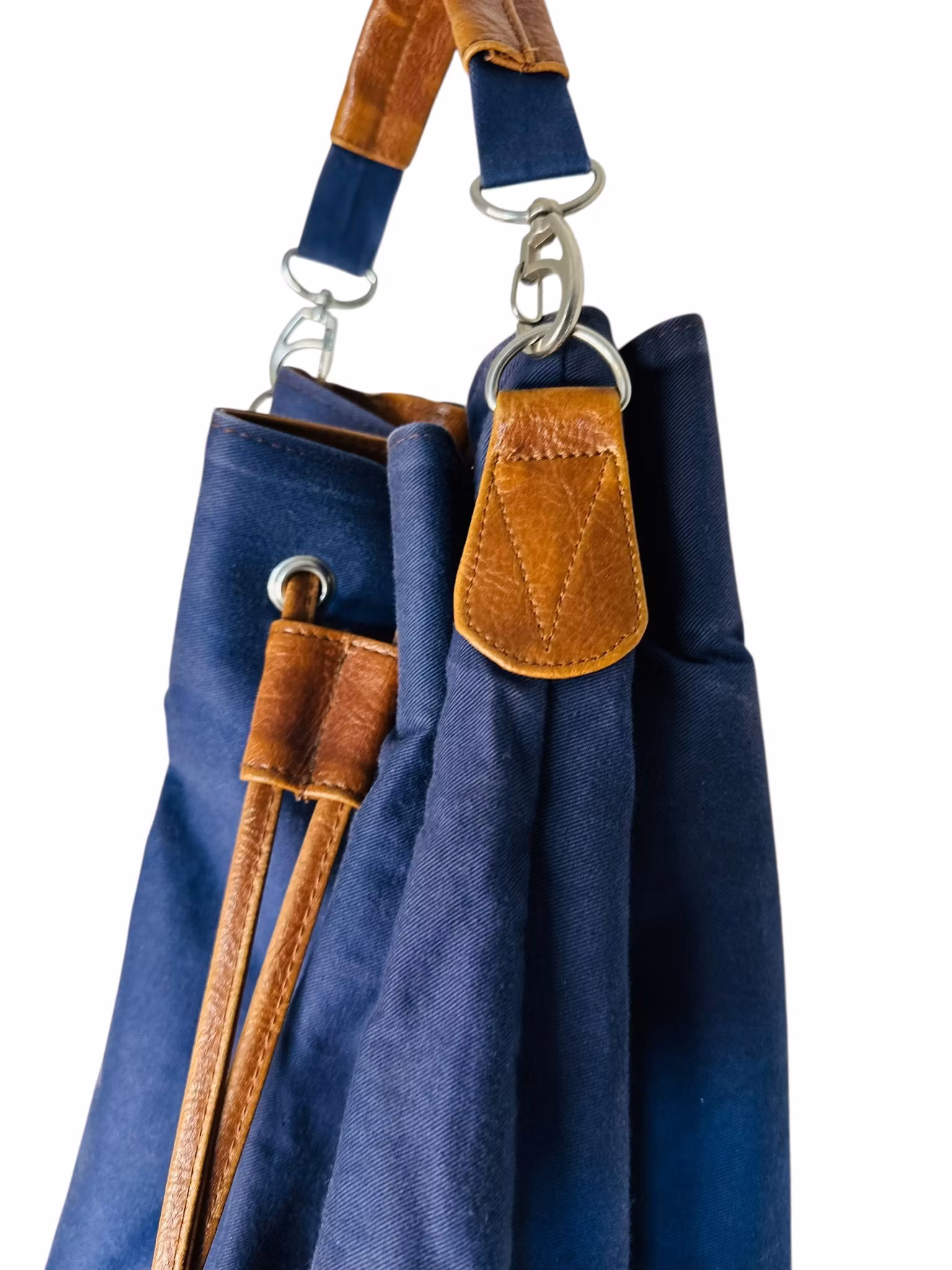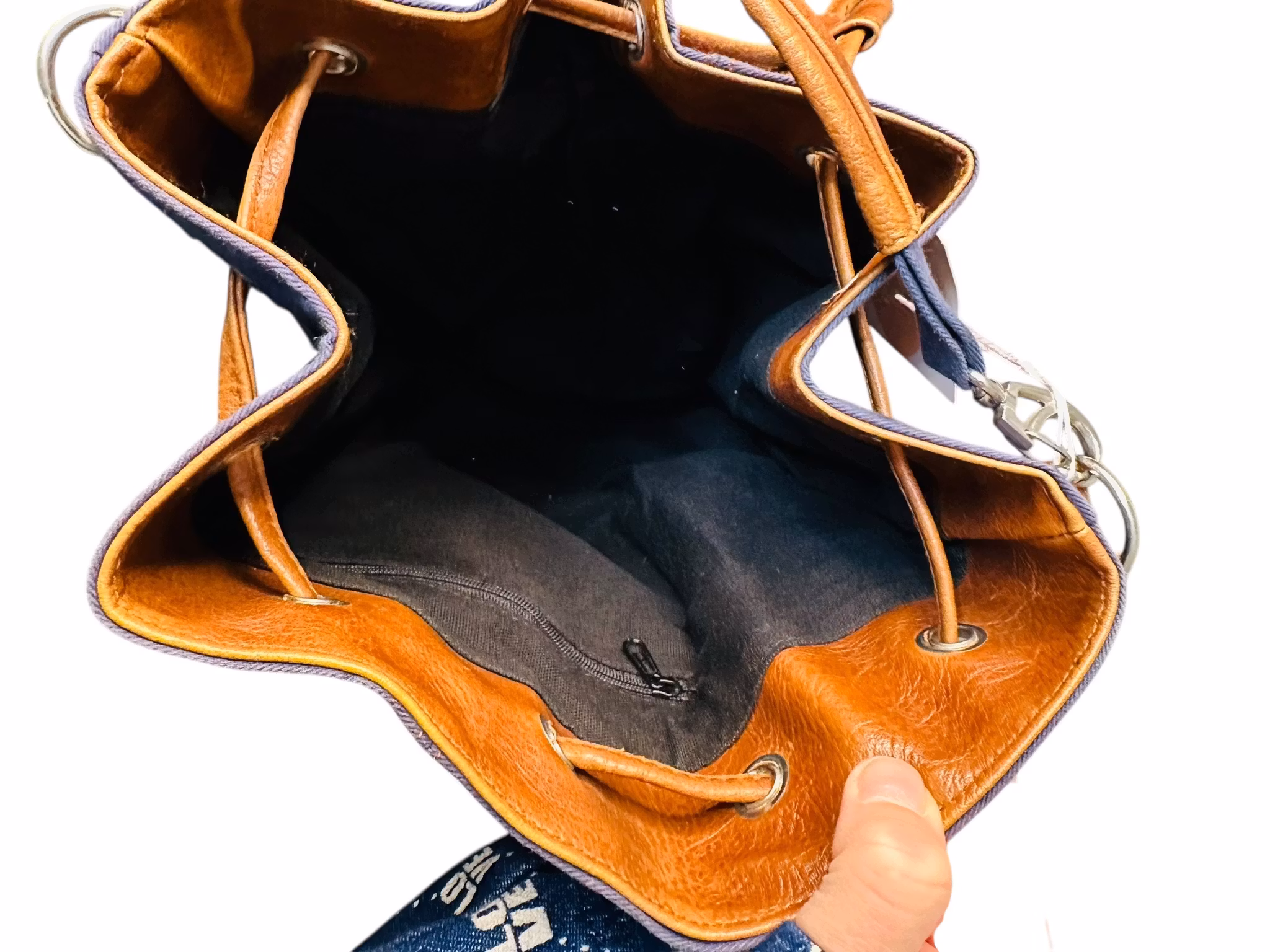 Beskrivning: En vintage väska i blå canvas med bruna läderdetaljer. Bucketform med liten ficka inuti.