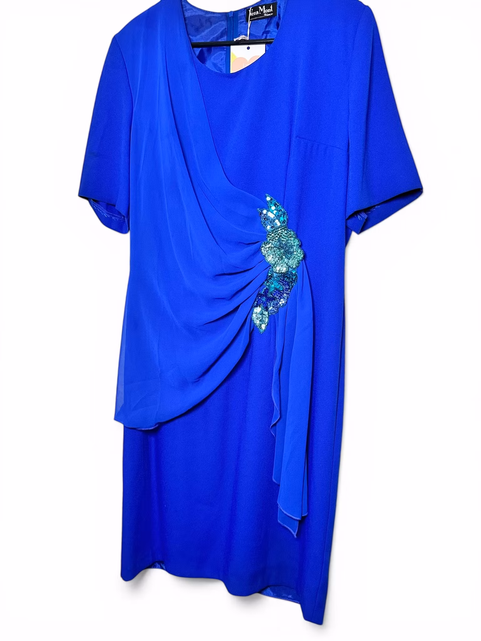 Beskrivning: Vera Mont France står det på lappen här, ett märke känt för sk "evening wear" och denna kornblåa pärla är inget undantag. Enkel i formen men med detaljer som draperad chiffong som markerar midjan och en paljettbeströdd dekoration som håller fast den. Rund hals, kort ärm och dragkedja i ryggen.
