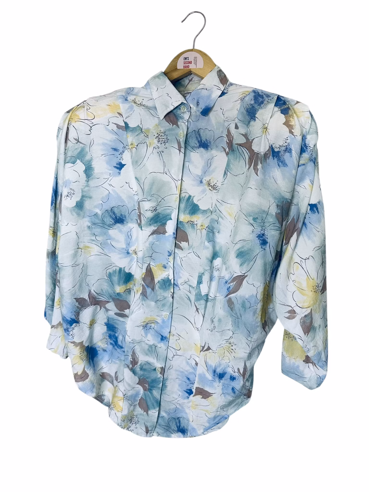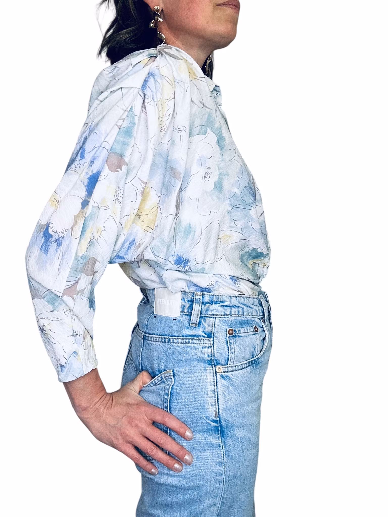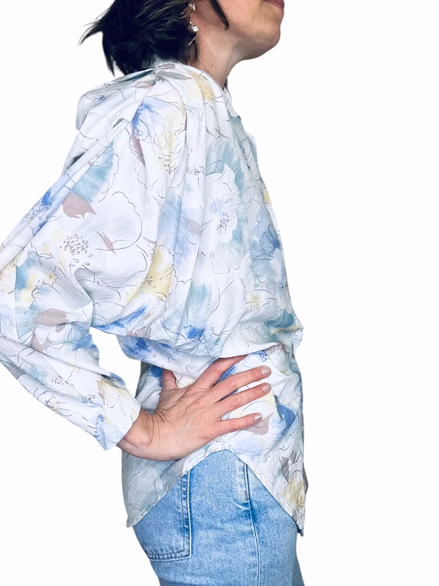 Beskrivning: Blus med rejäla axelvaddar och veck nedanför som förstärker 80-tals-silhuetten ytterligare! Insvängd midja och pingvinärmar utan manschetter och med en liten krage. Från Felice och "made in England".