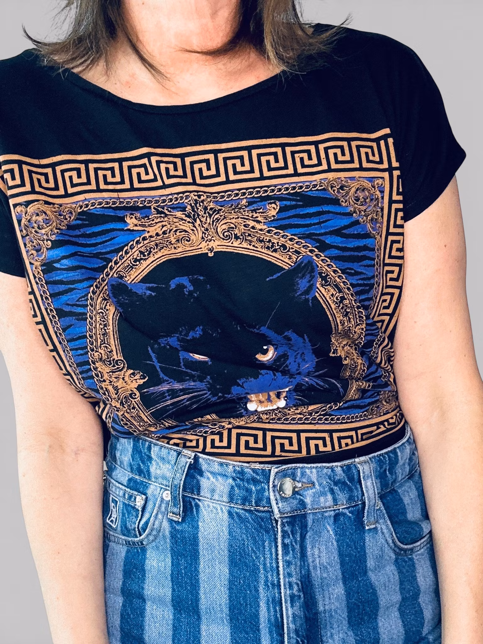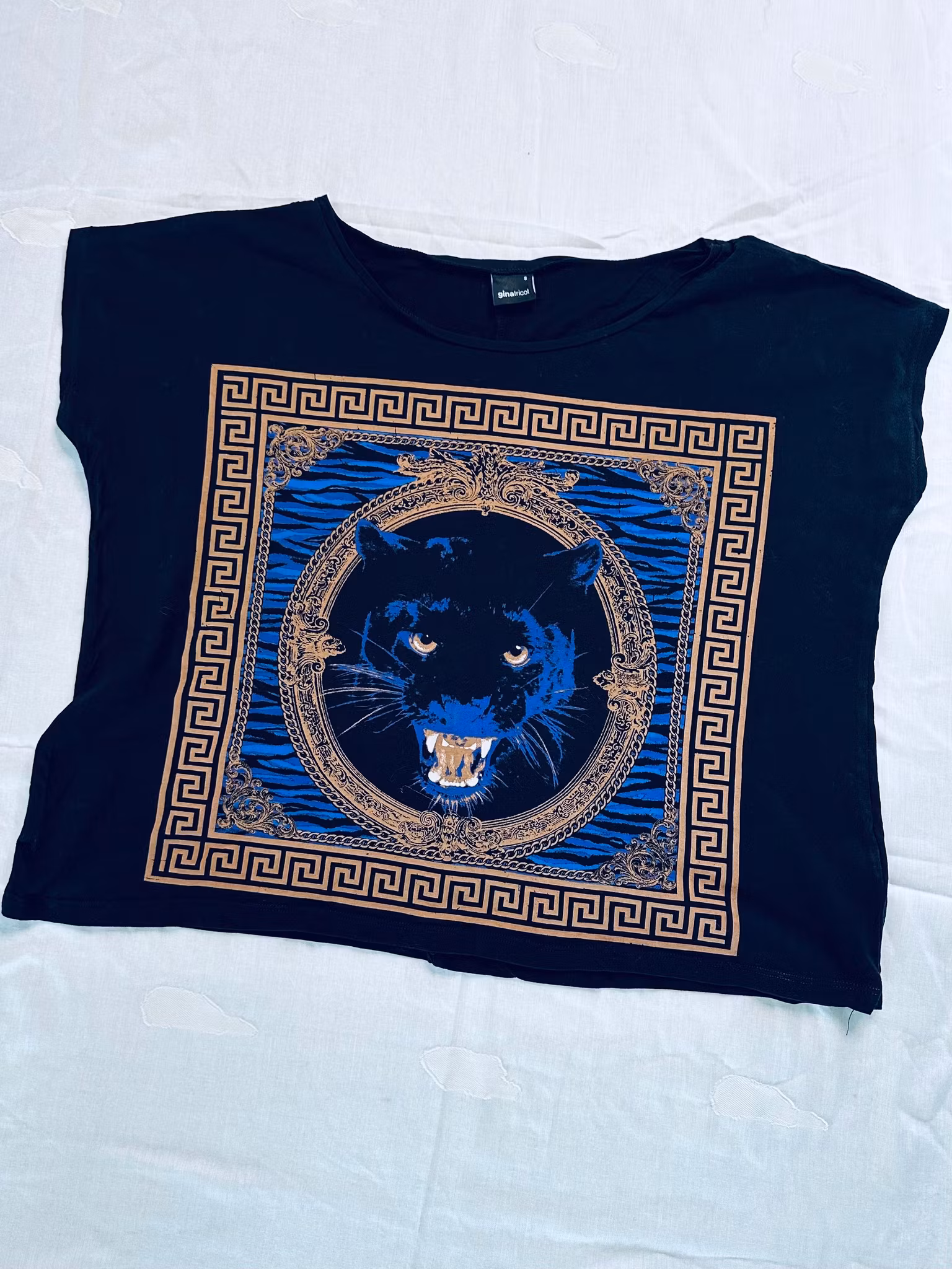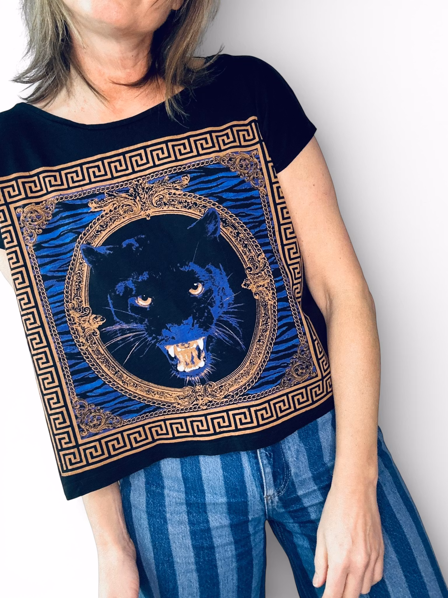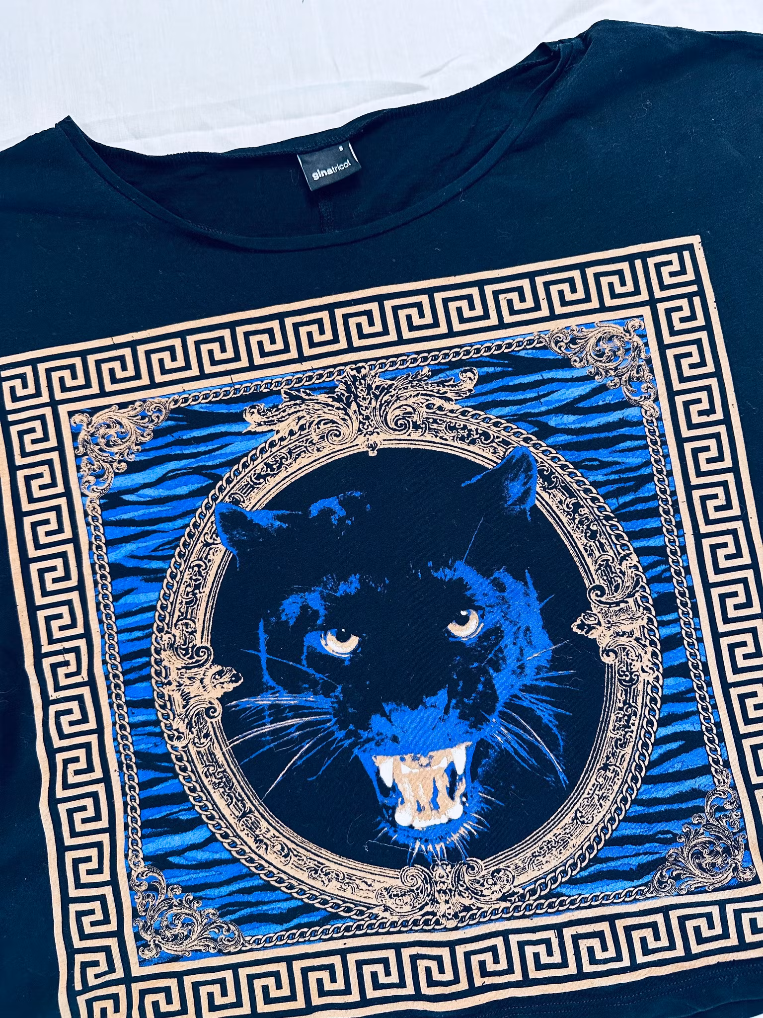 Beskrivning: Svart, boxig t-shirt med en panter på framsidan. Från Gina Tricot.
