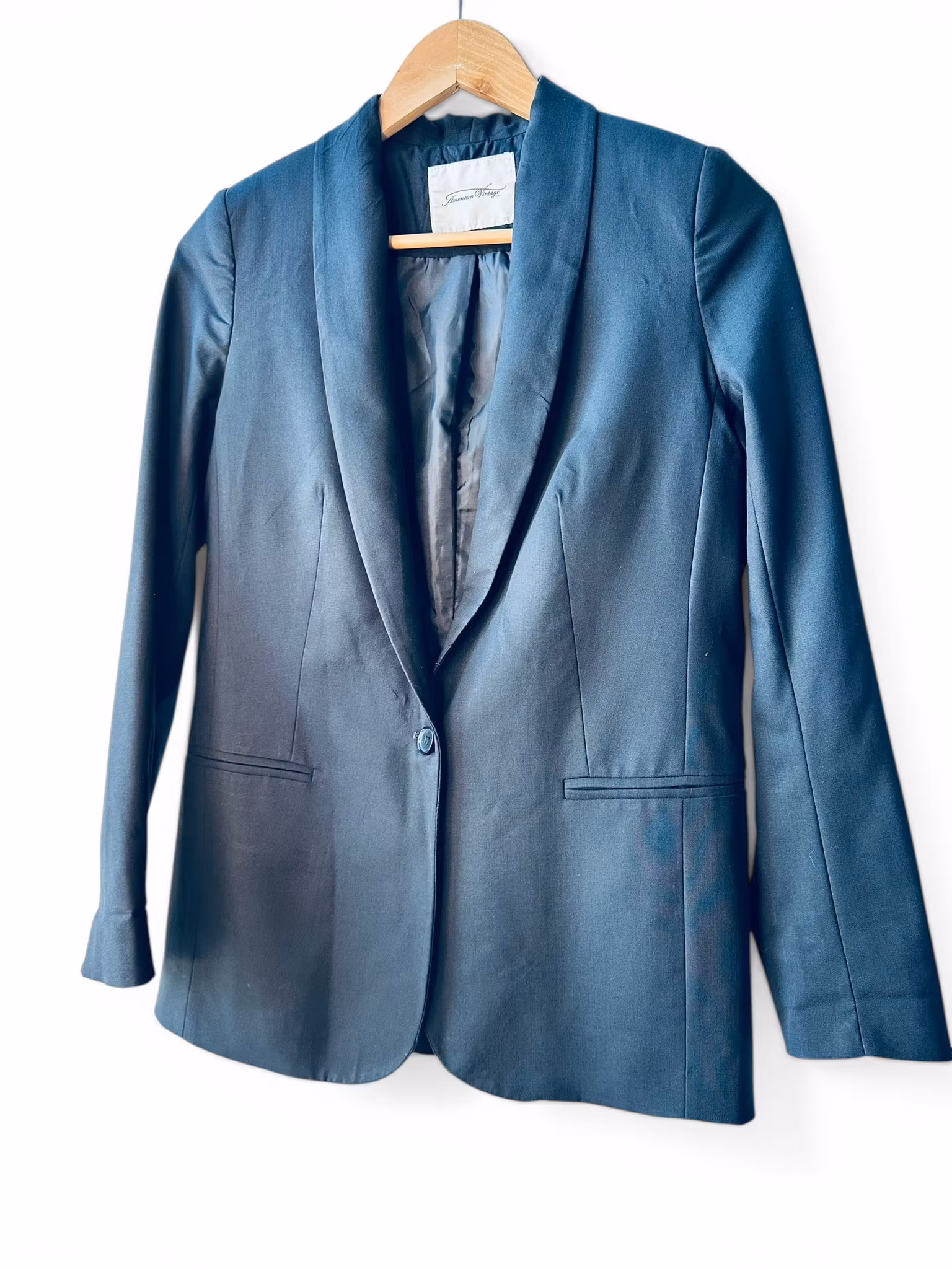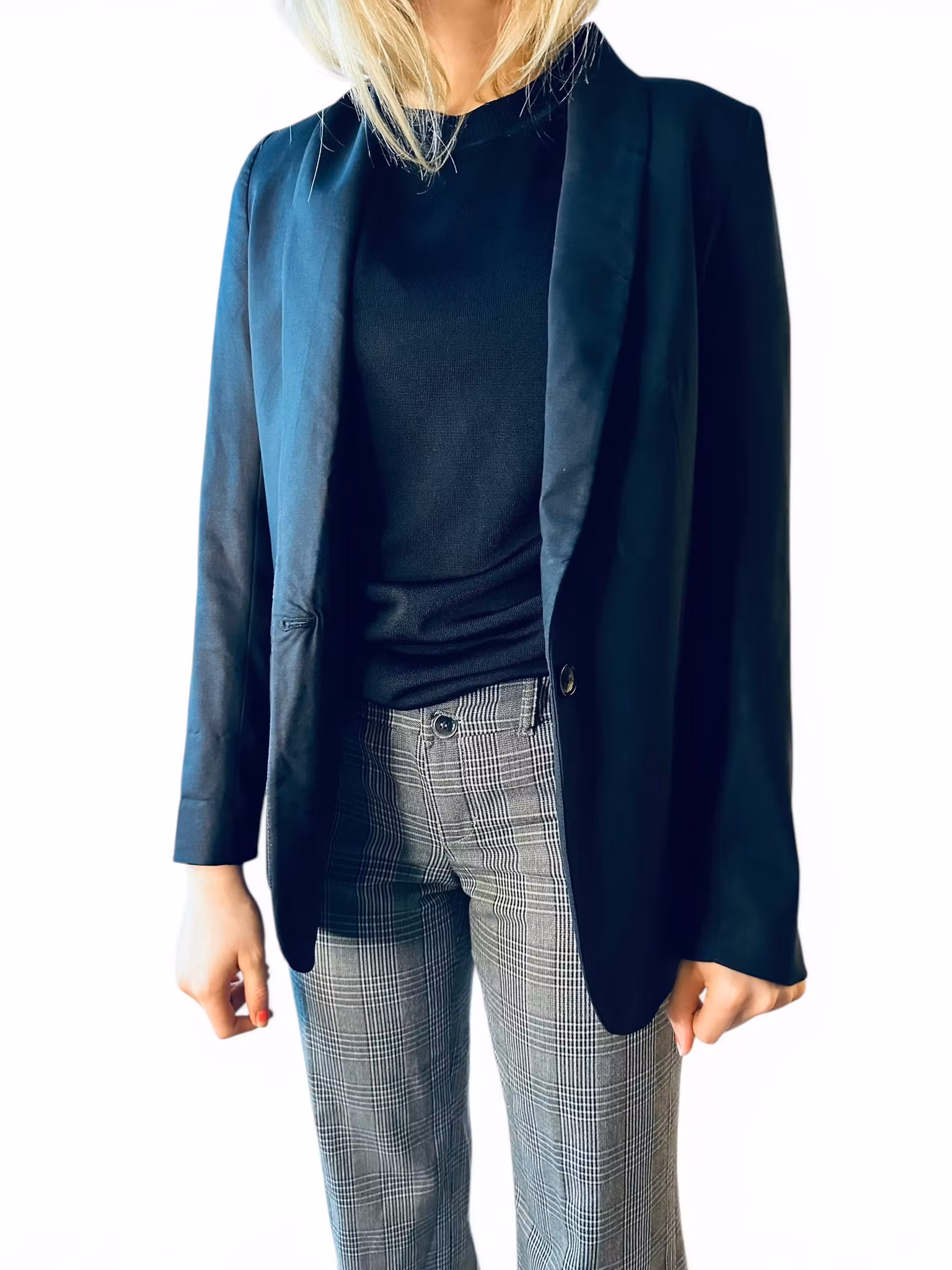 Beskrivning: En stilren blazer i svart med en lätt figurnära passform. Den har en klassisk slagkrage, enkelknäppning och diskreta fickor som ger ett rent och tidlöst uttryck. Materialet – en lyxig ull – ger plagget en mjuk, följsam känsla samtidigt som det behåller en snygg struktur. Nypris ca 3000kr.