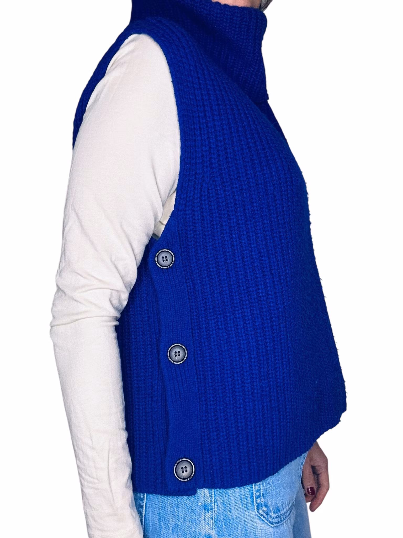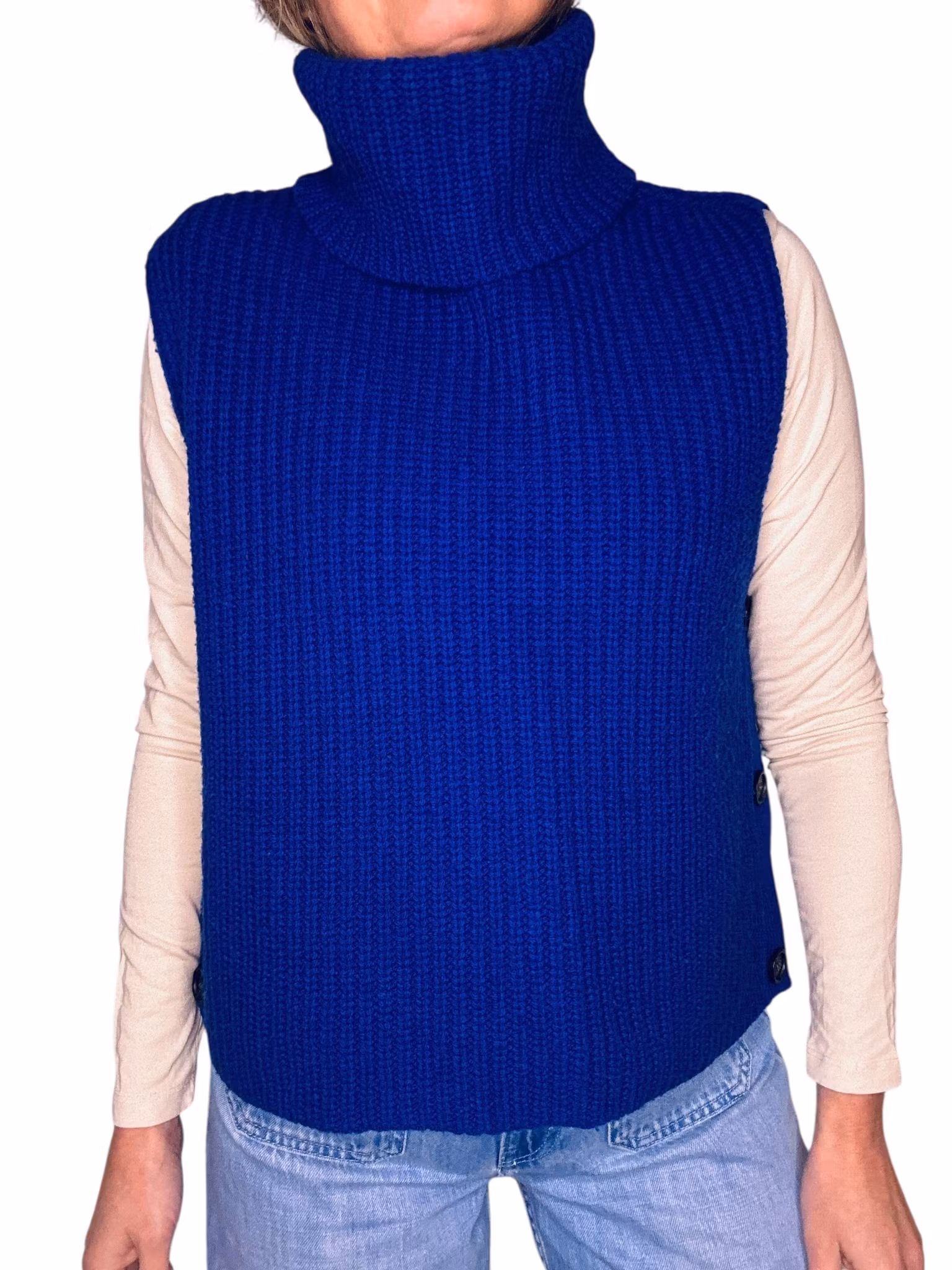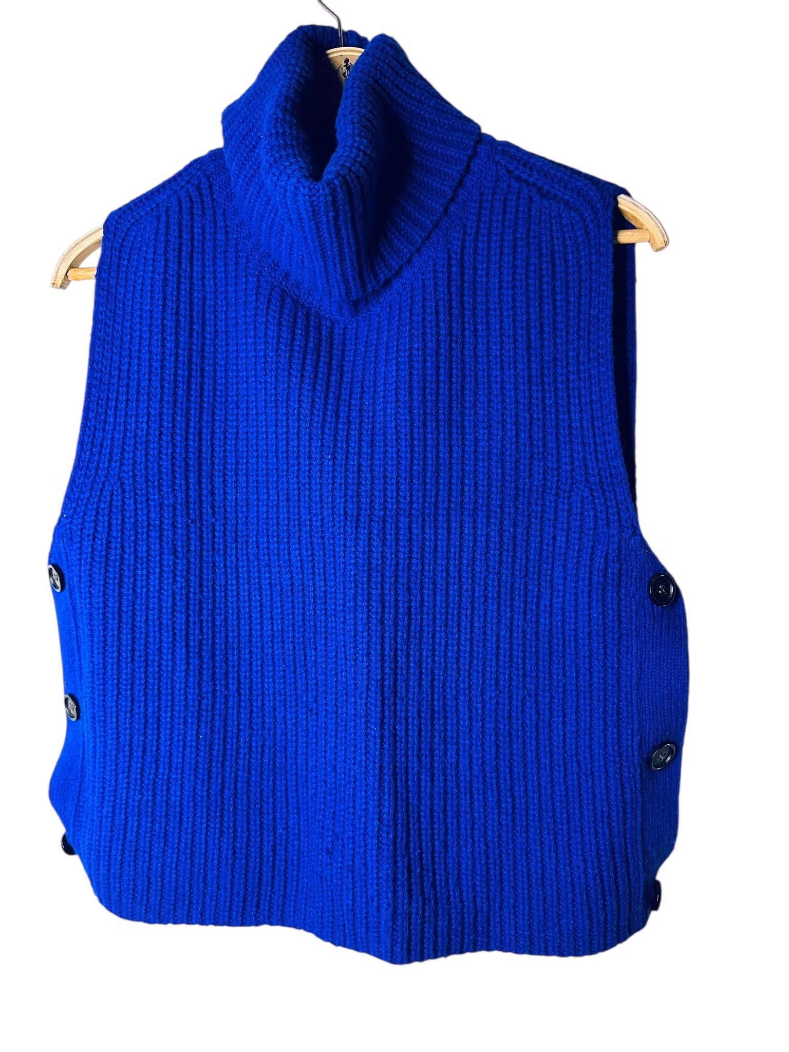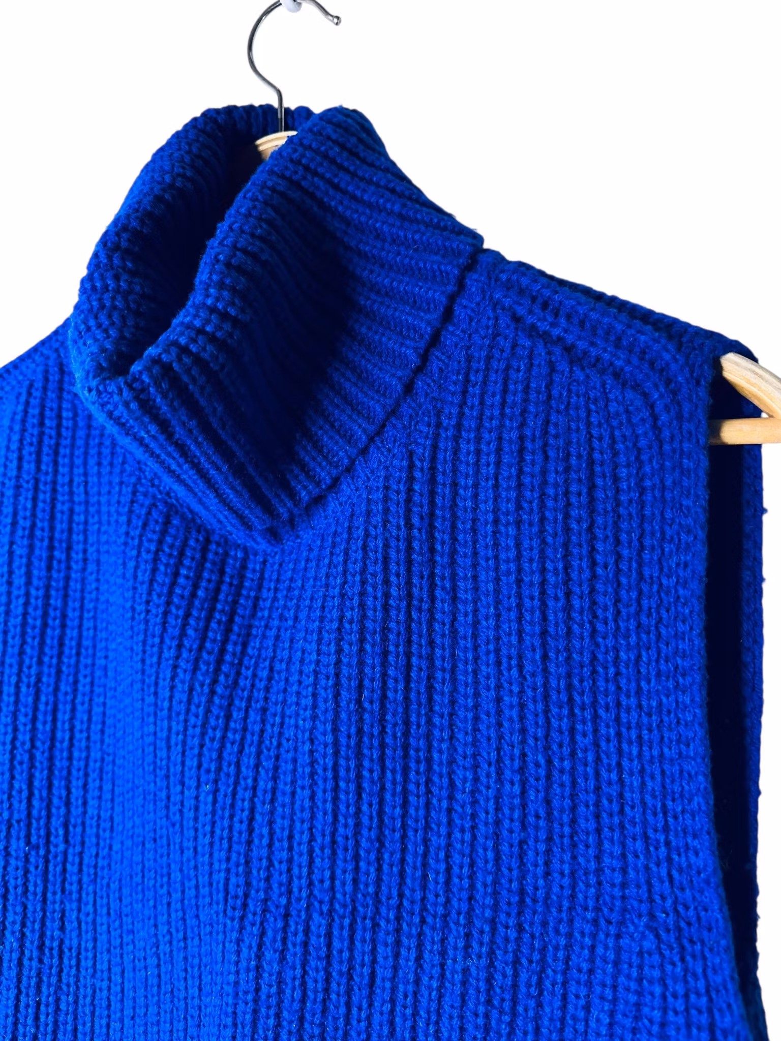 Beskrivning: En tjock, kornblå slipover från Arket. En personlig favorit! Bästa färgen, så gosig krage och supersmidigt med knapparna i sidorna. Det går därför att knäppa av sig den utan att ta av sig jackan om en skulle bli varm. Hur bra? Lite ytnoppig så som ull blir, se bilder.