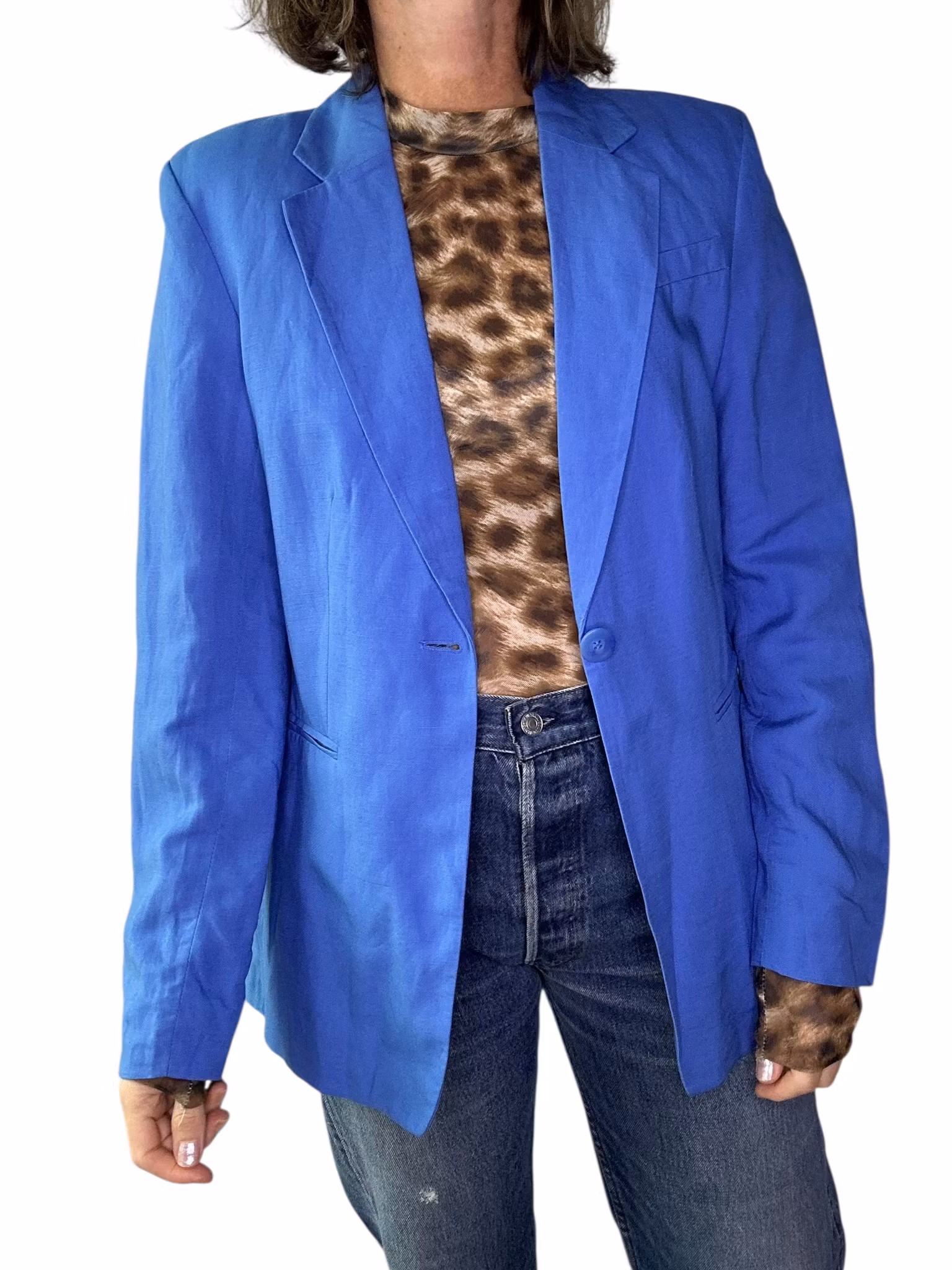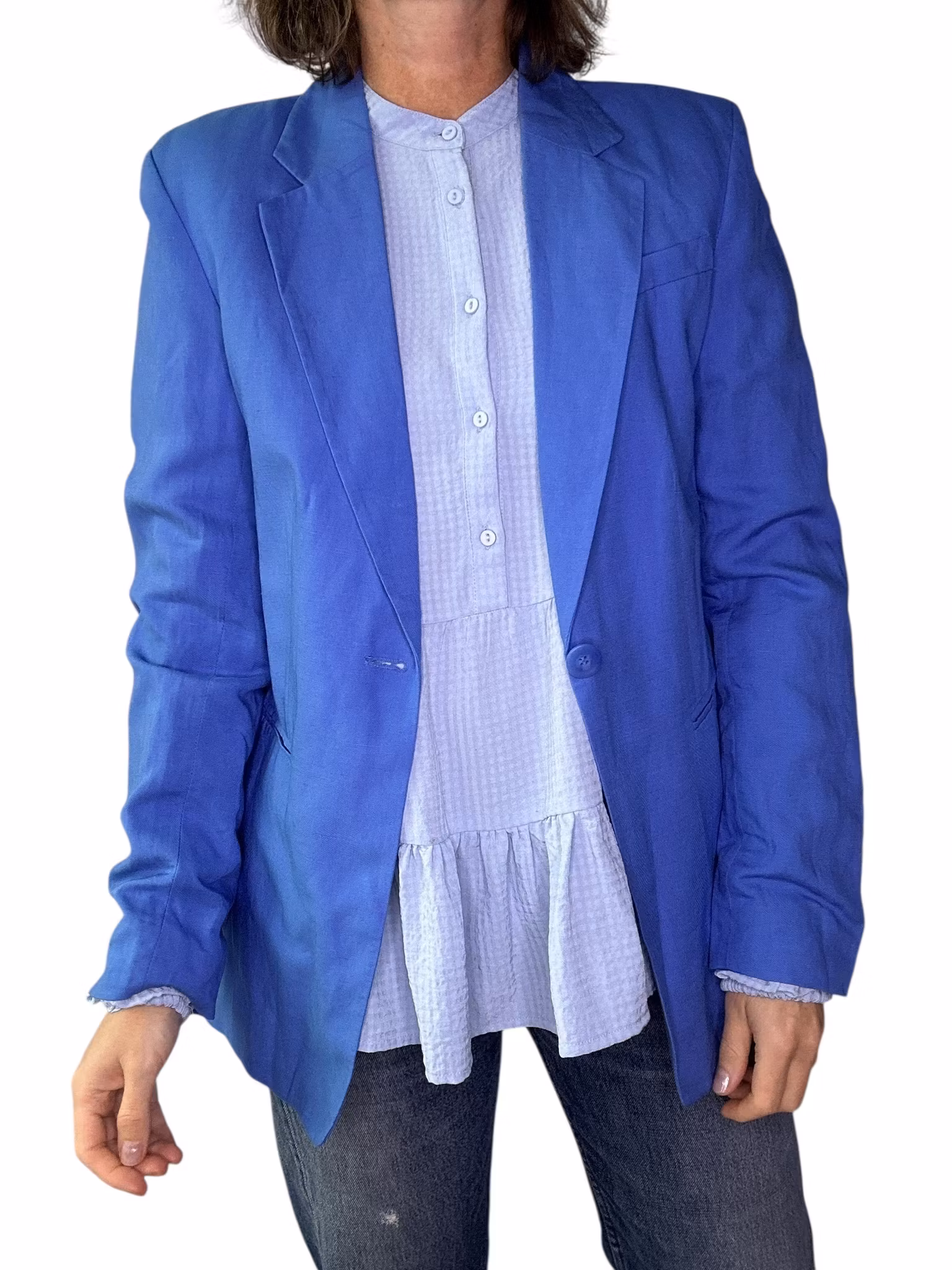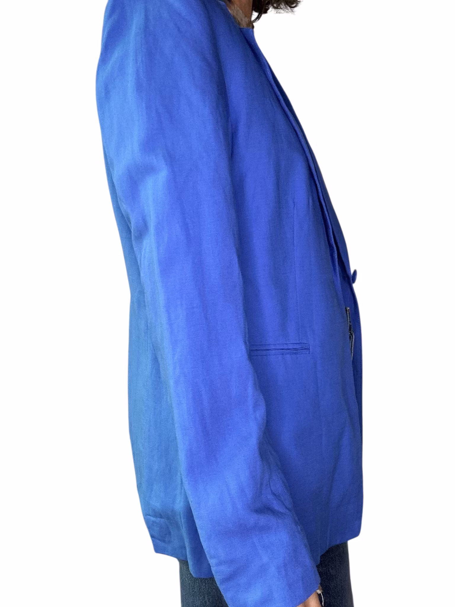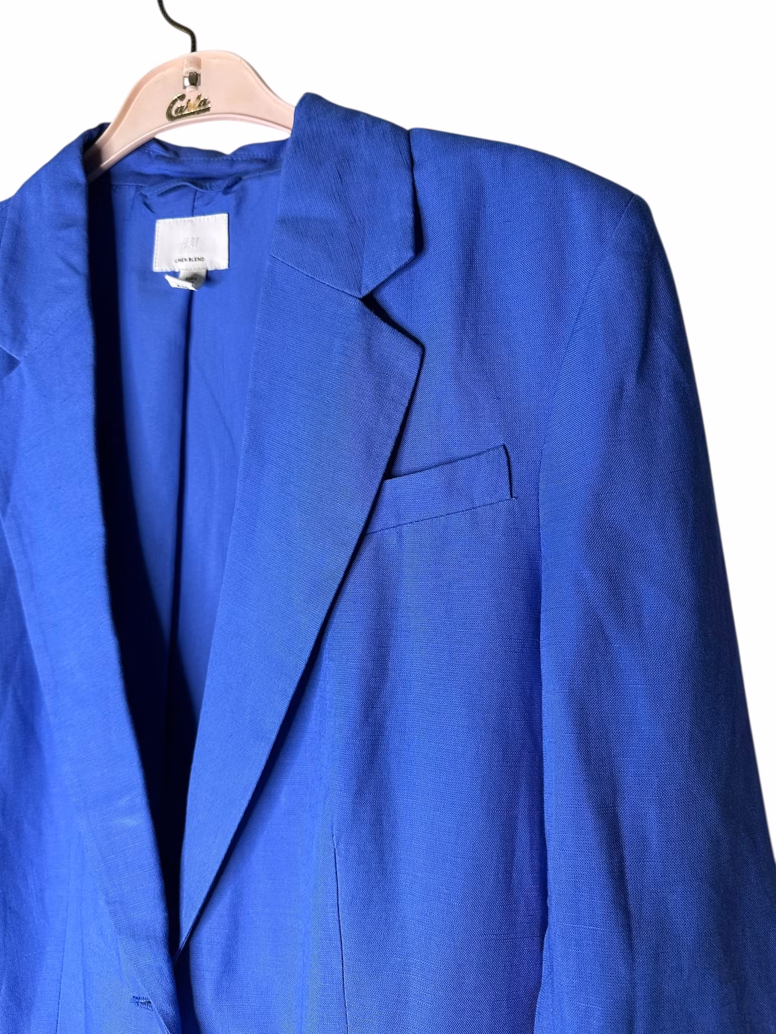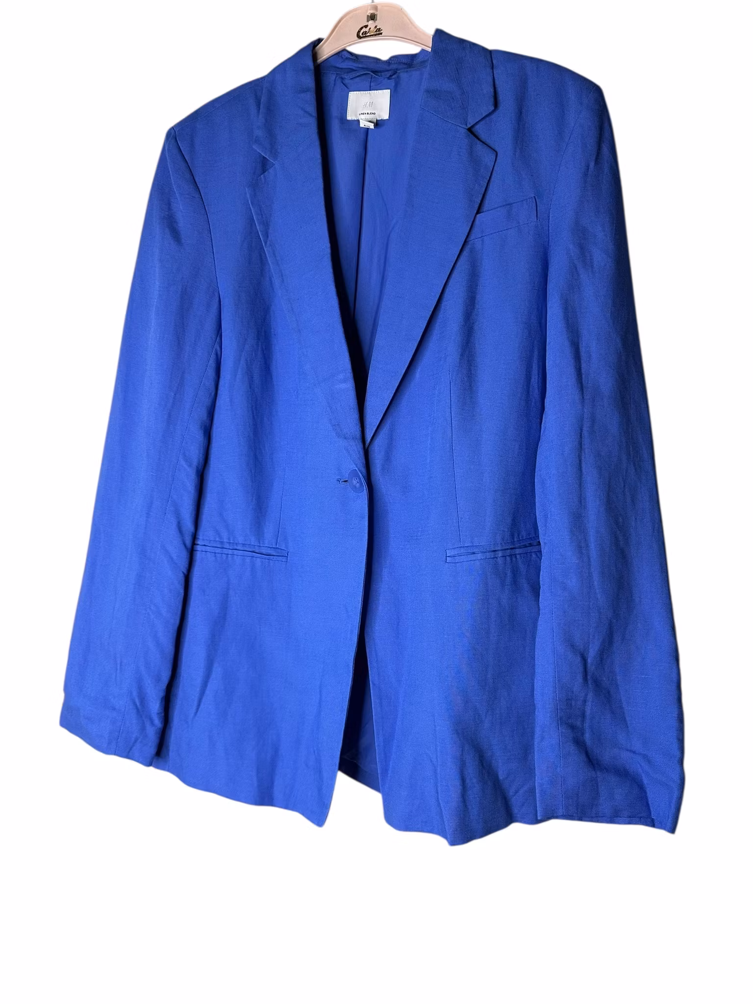 Beskrivning: En kavaj i härligt blå nyans. Materialet är viskos/linne, snittet är klassiskt med fickor fram, en knapp och lätt intagen i midjan. Helfodrad. Från HM.
