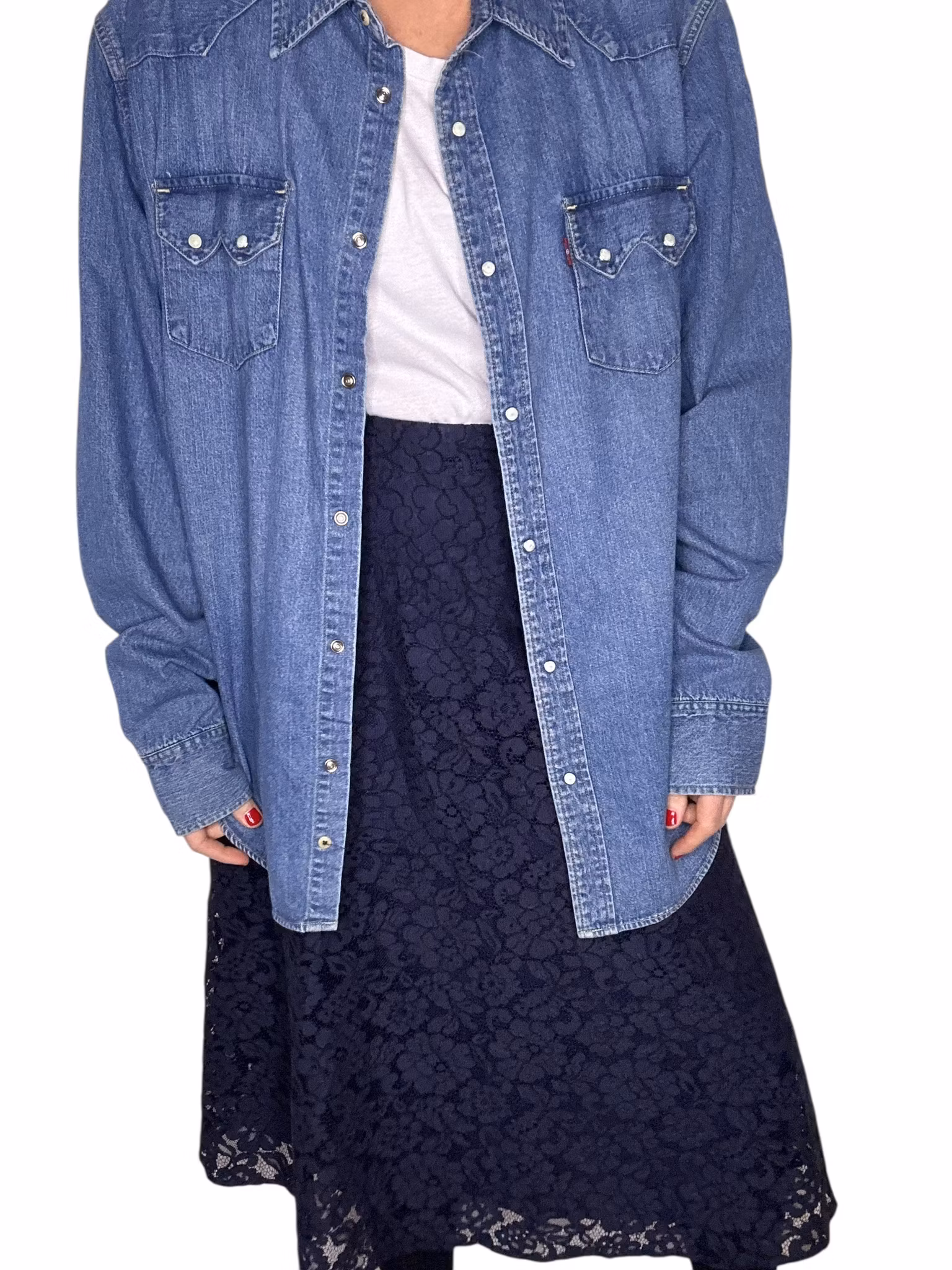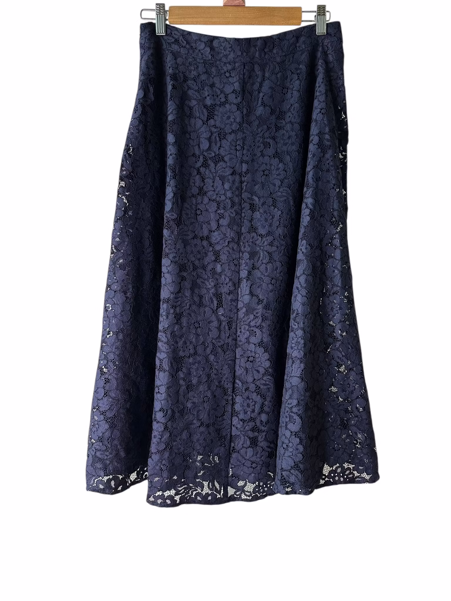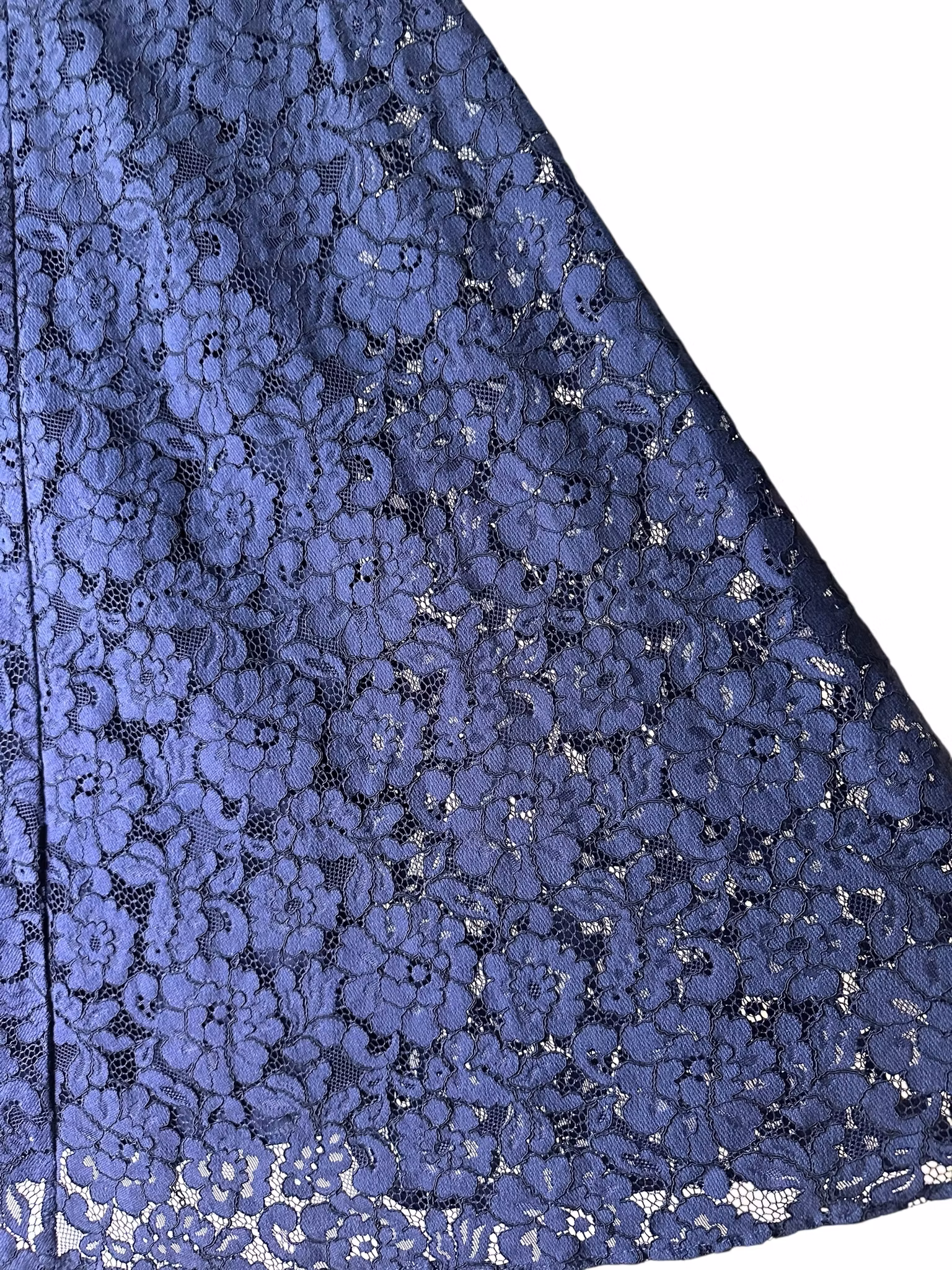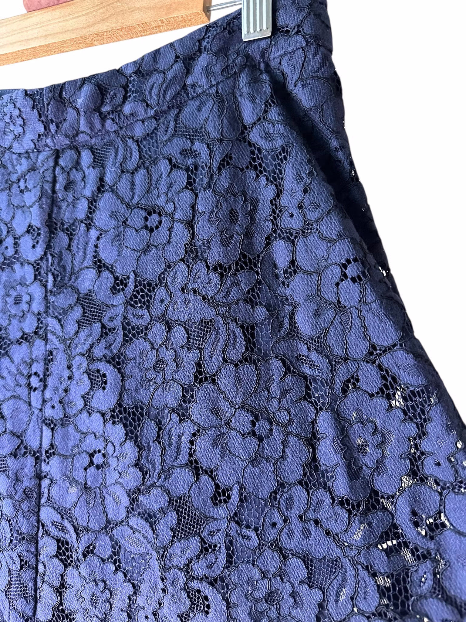 Beskrivning: Marinblå kjol i genombruten spets. Fint alternativ till det "vanliga" svarta till fest. Också så snyggt med denim till vardags. En modell med tajt midja och klockad kjol. Stängs med dragkedja. Heofodrad med marinblått material. Från HM.