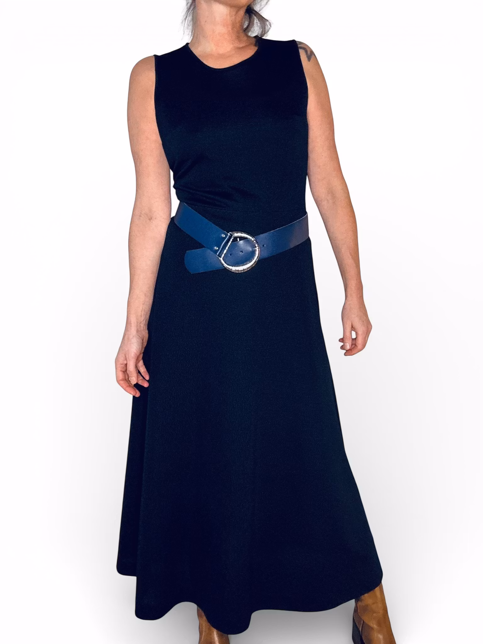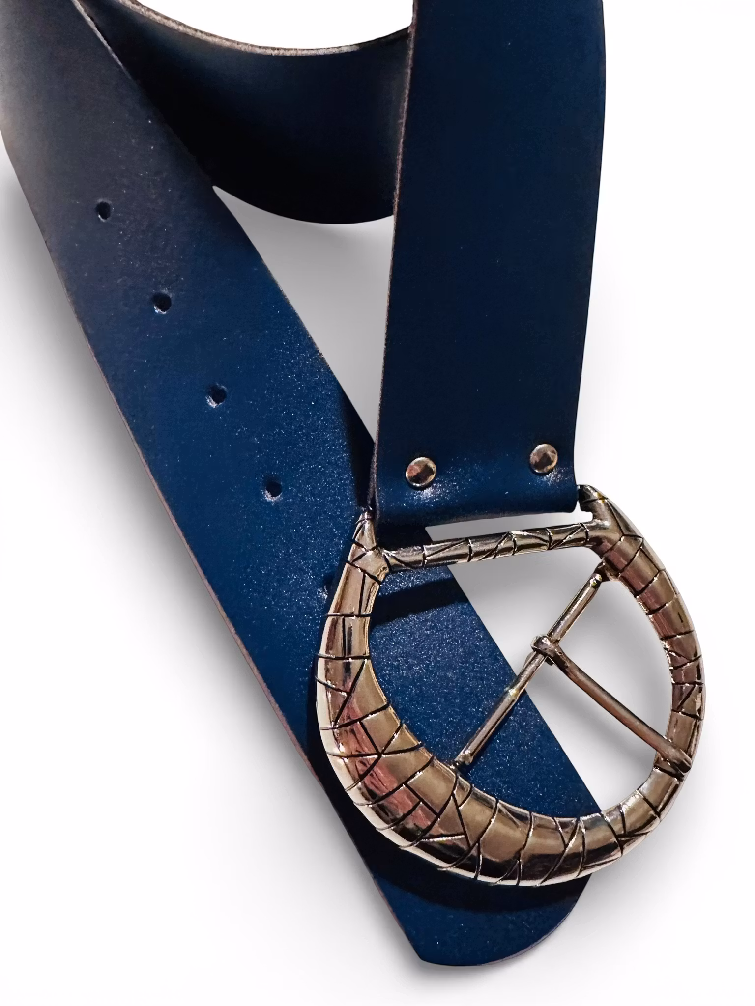 Beskrivning: Brett skärp i blått fejkläder. Silverspänne som stängs snett, perfekt att ha på höften.