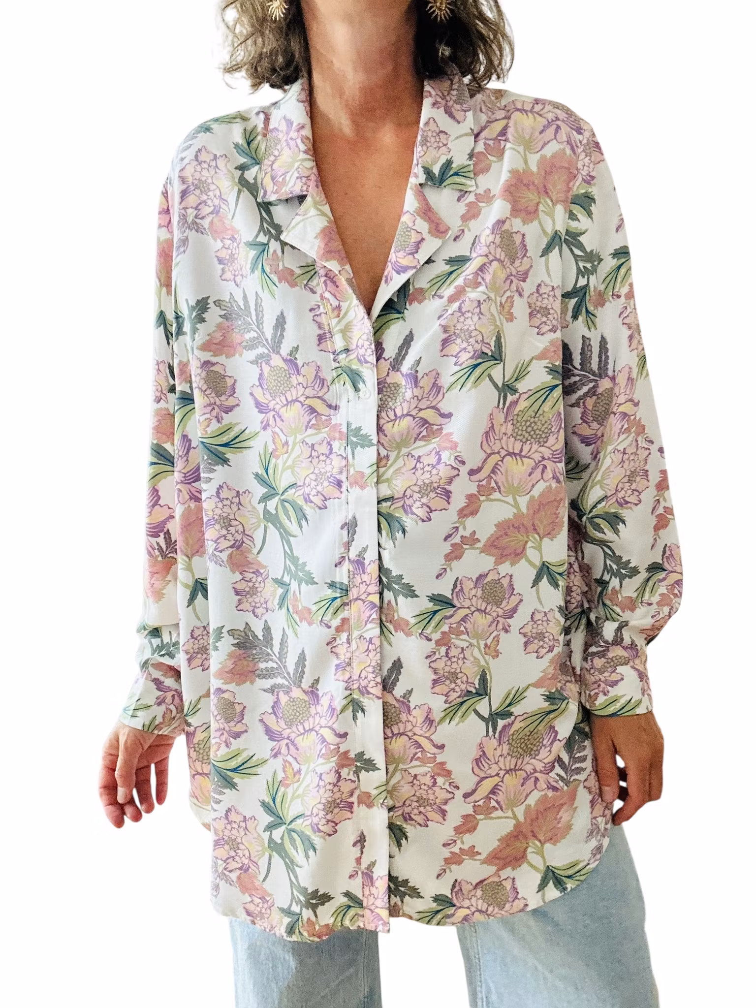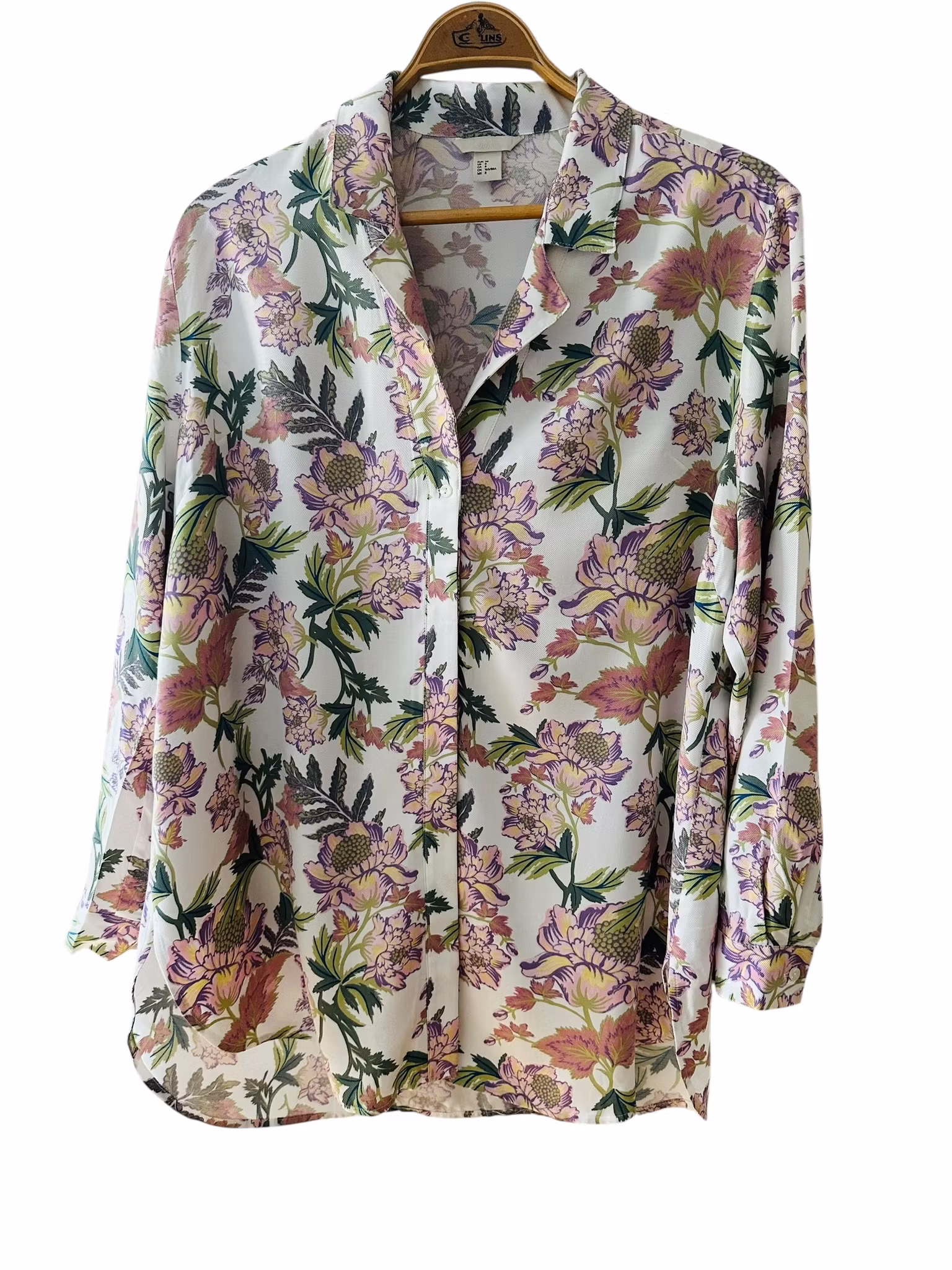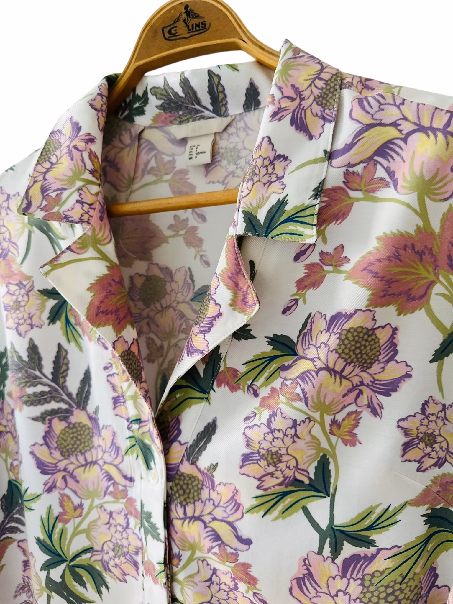 Beskrivning: Sval storskjorta med rosa blommor och gröna och lila detaljer. Kavajkrage och en knapp som är synlig - resten av knapparna är dolda bakom en knappslå. Lång modell med rundade nederkanter där framstycket är kortare än bakstycket. Lång ärm med manschett. Från H&M.