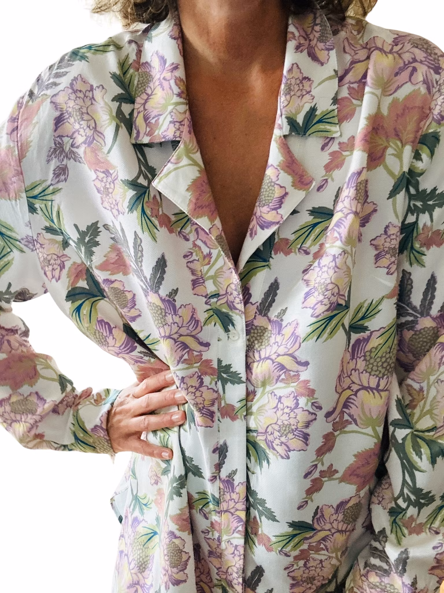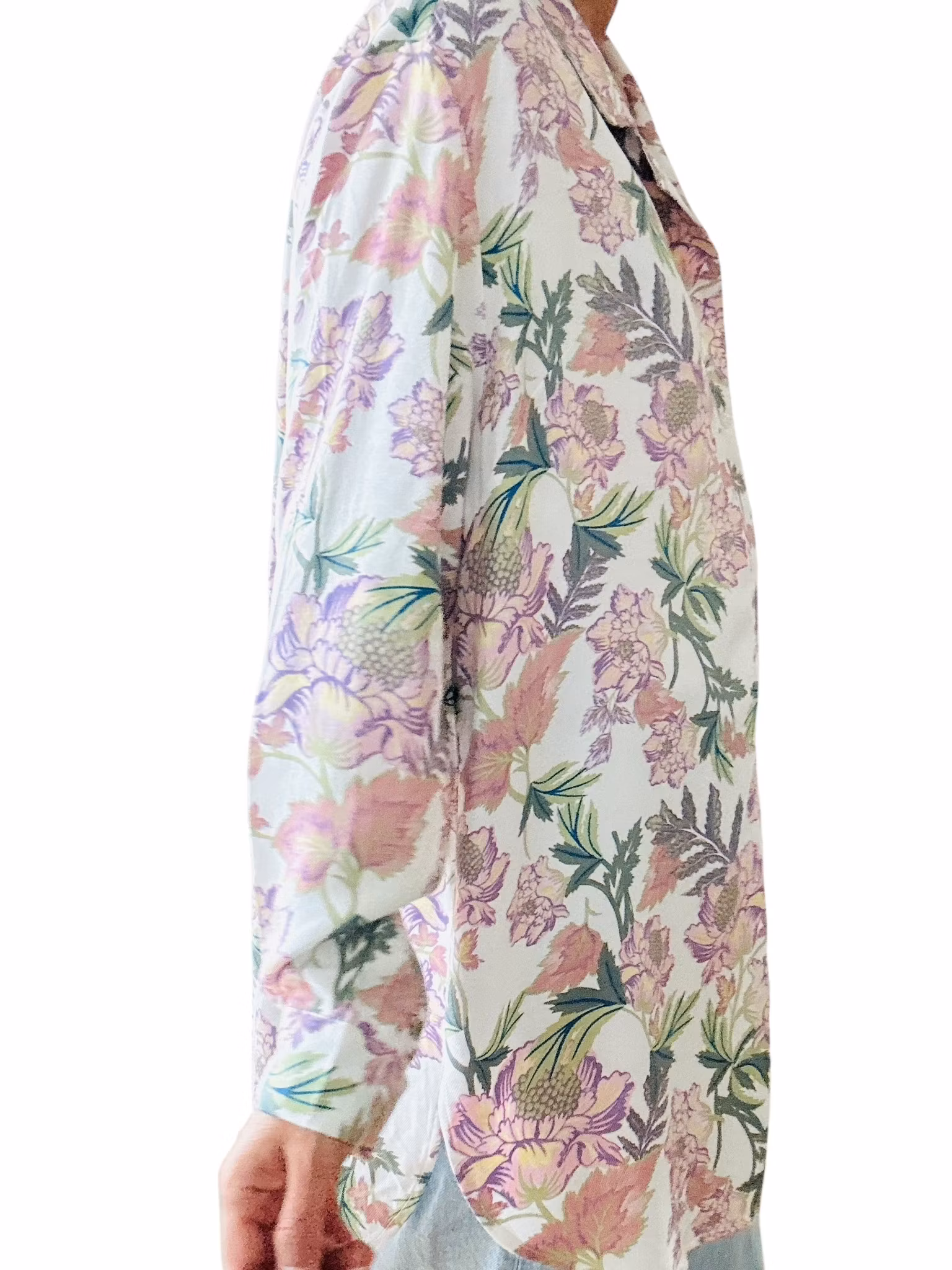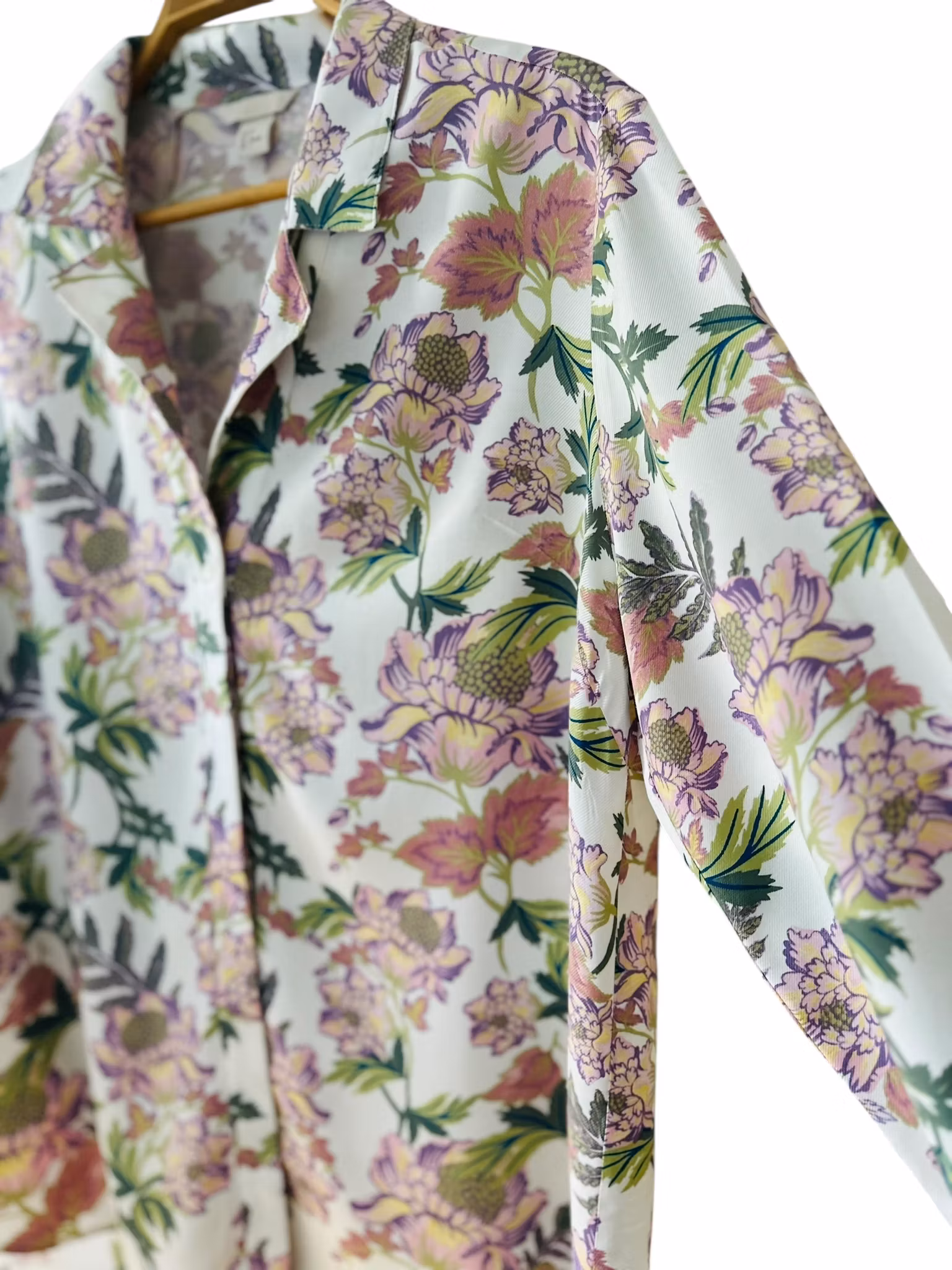 Beskrivning: Sval storskjorta med rosa blommor och gröna och lila detaljer. Kavajkrage och en knapp som är synlig - resten av knapparna är dolda bakom en knappslå. Lång modell med rundade nederkanter där framstycket är kortare än bakstycket. Lång ärm med manschett. Från H&M.