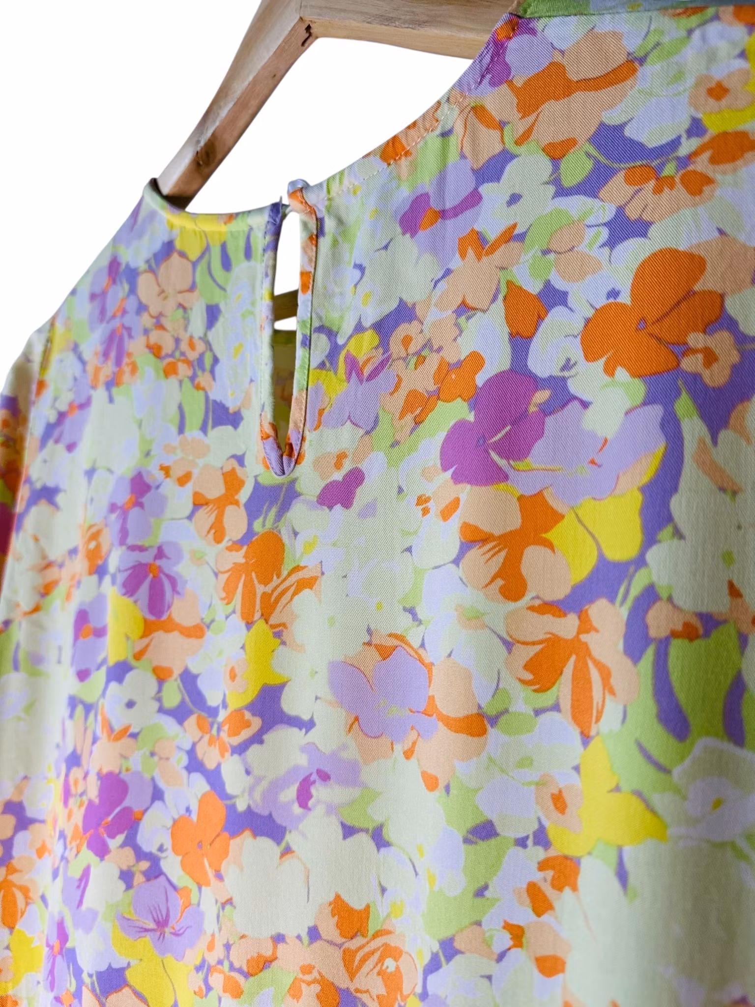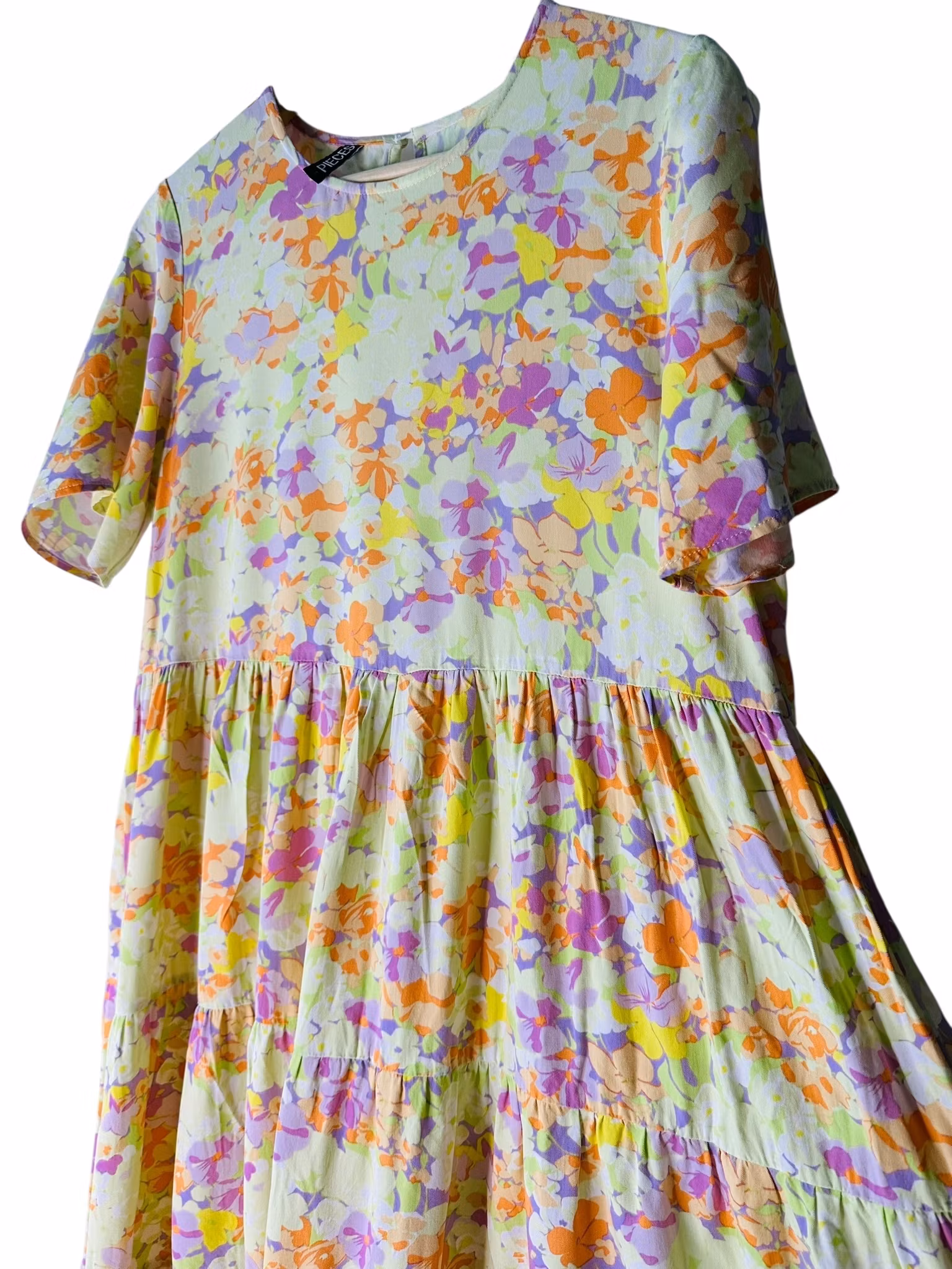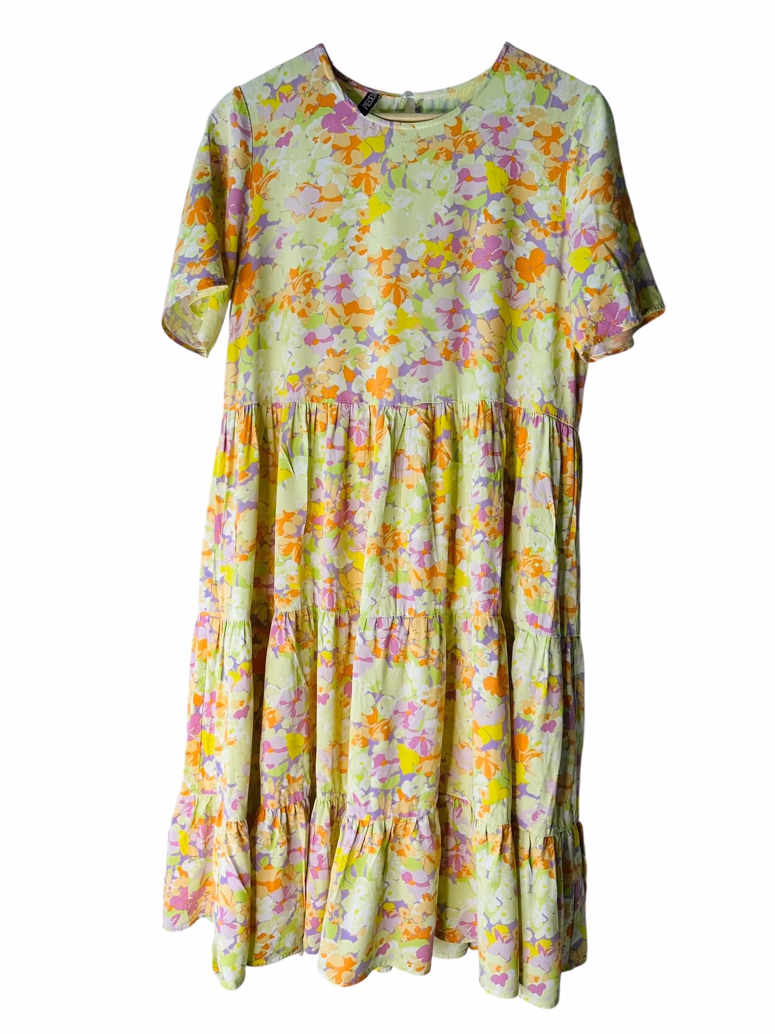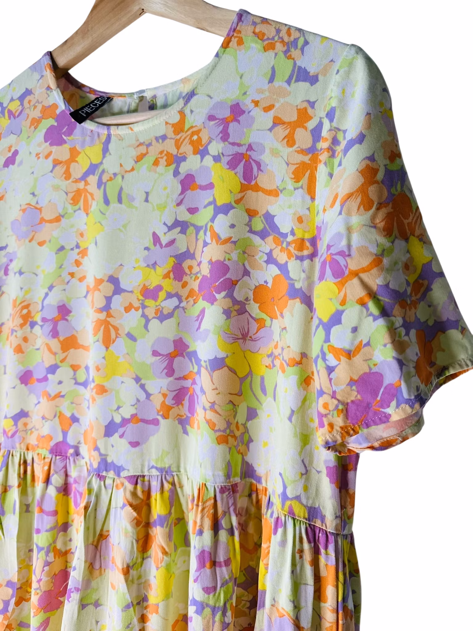 Beskrivning: Luftig och sval viskosklänning i härliga färger. Rejäl vidd i kjoldelen, kort ärm och stängning med nyckelhålsdetalj i nacken. Från Pieces. Uppfattas som rymlig i storlek, se mått.