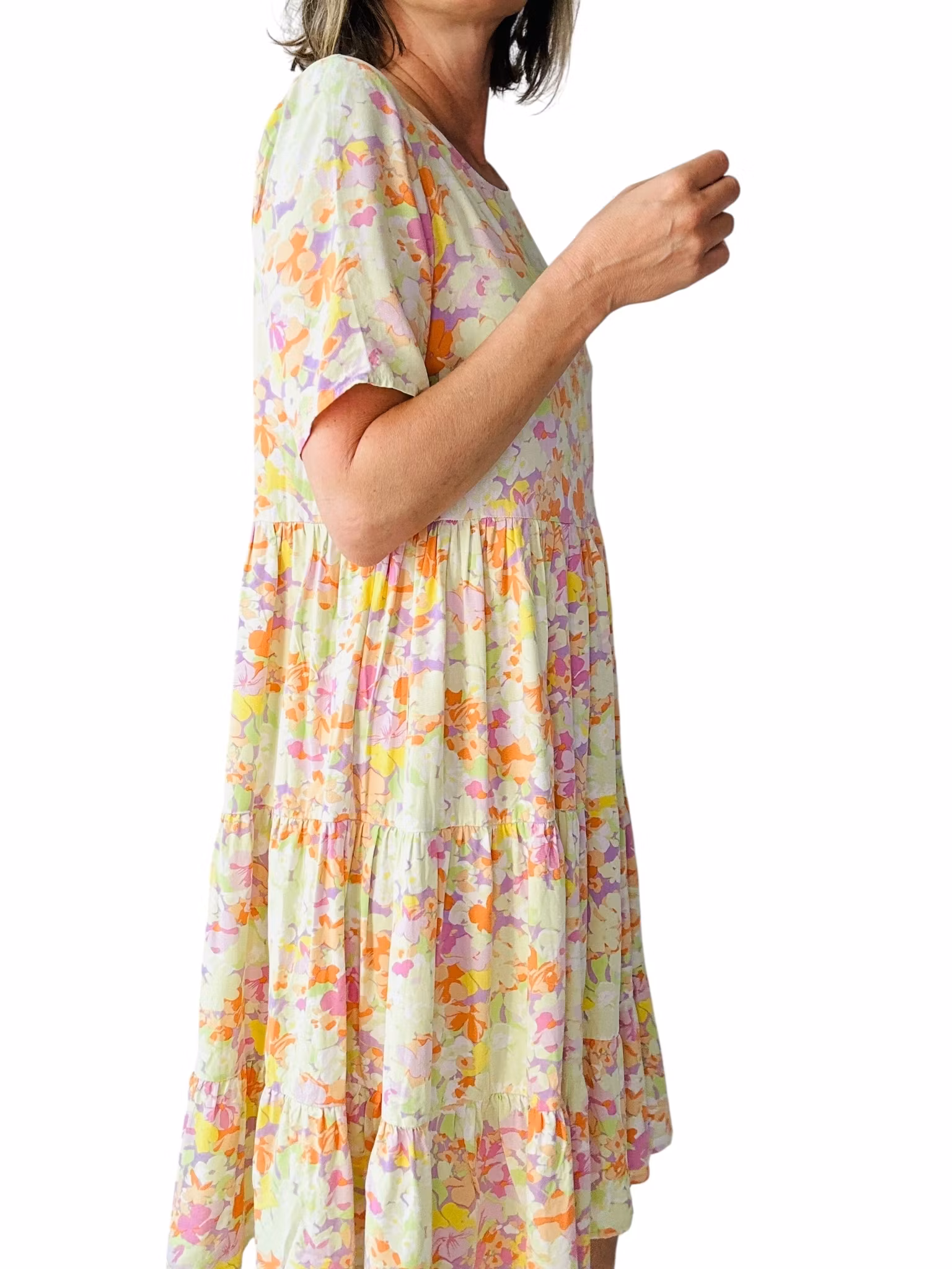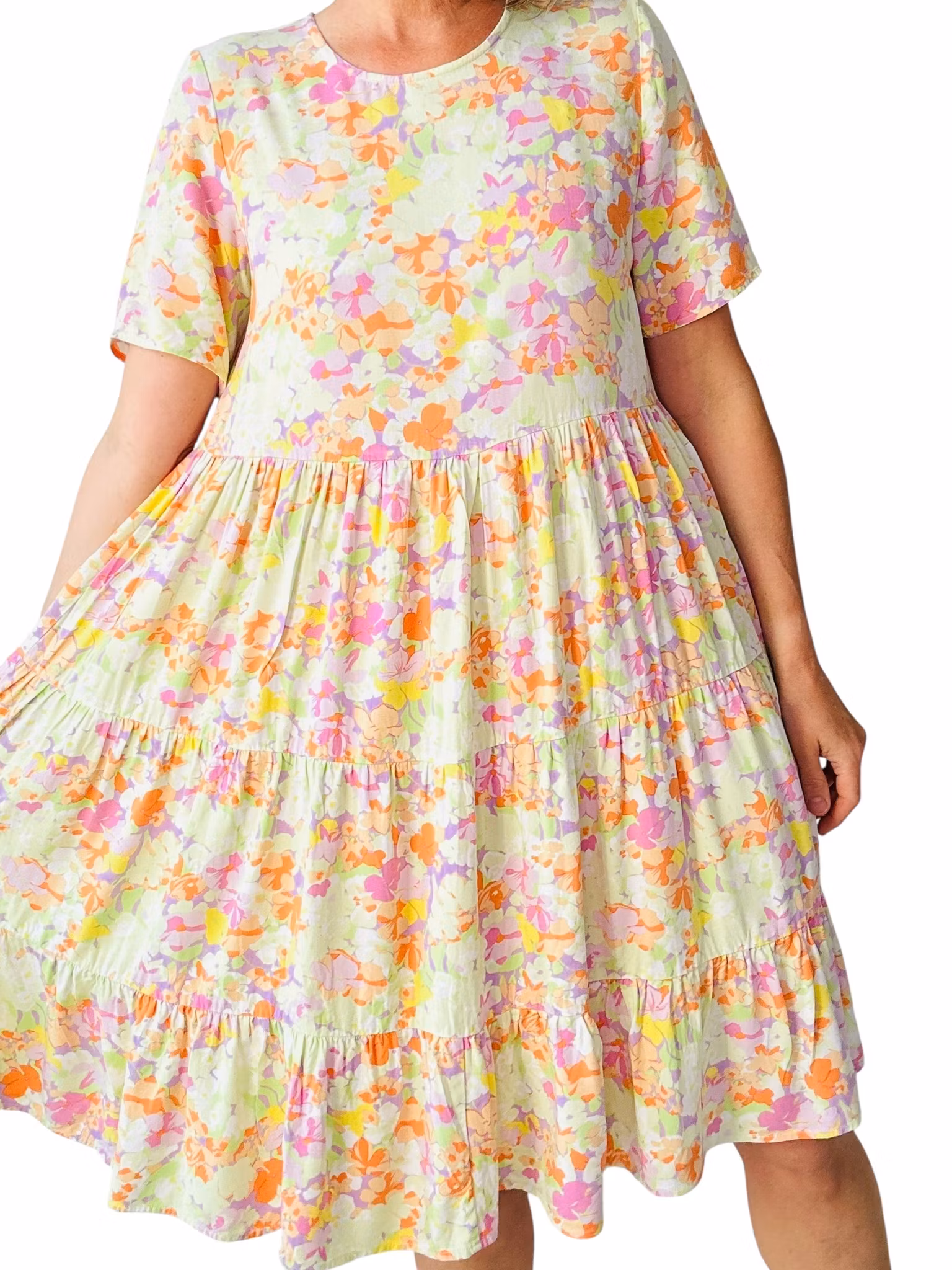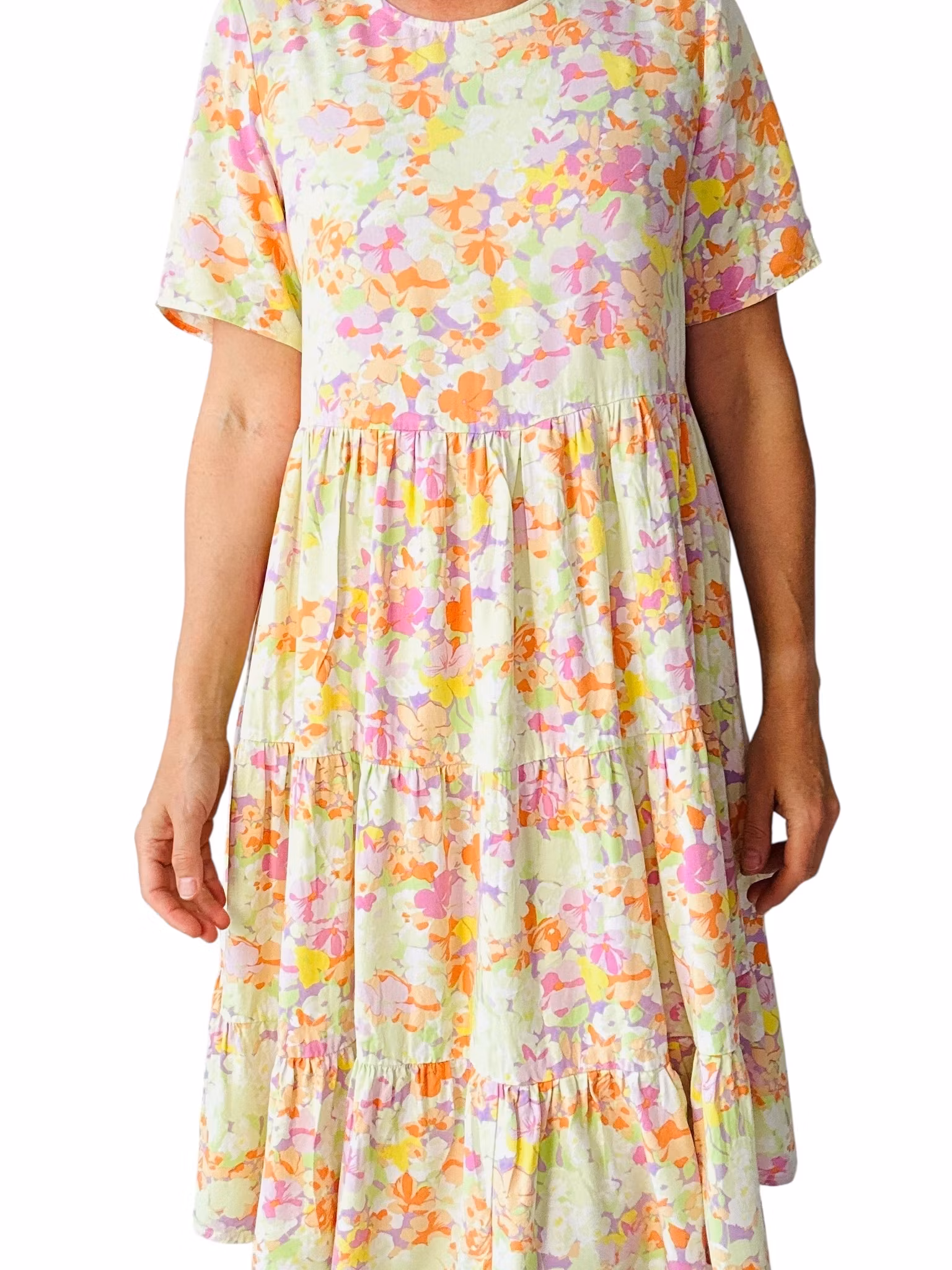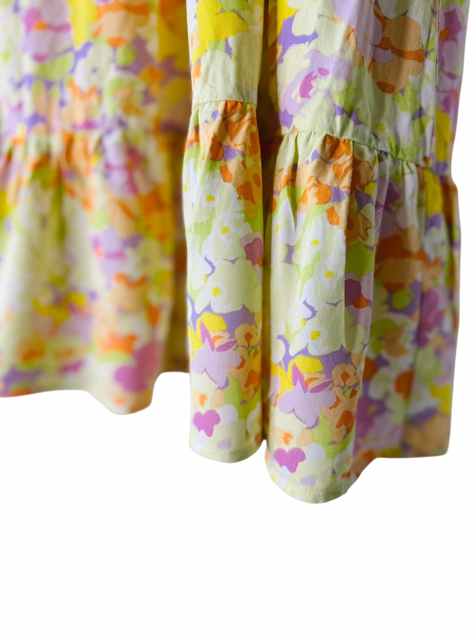 Beskrivning: Luftig och sval viskosklänning i härliga färger. Rejäl vidd i kjoldelen, kort ärm och stängning med nyckelhålsdetalj i nacken. Från Pieces. Uppfattas som rymlig i storlek, se mått.