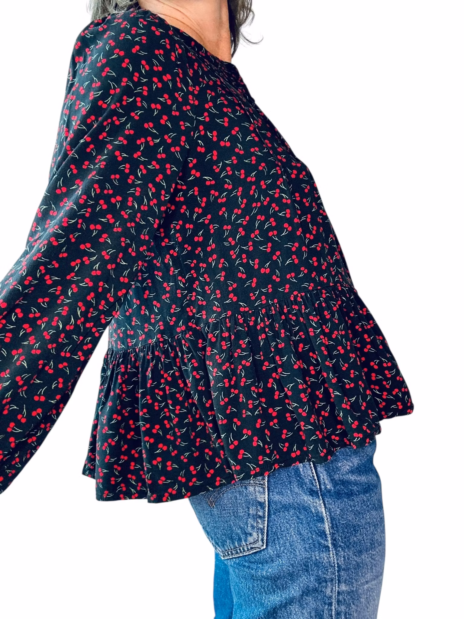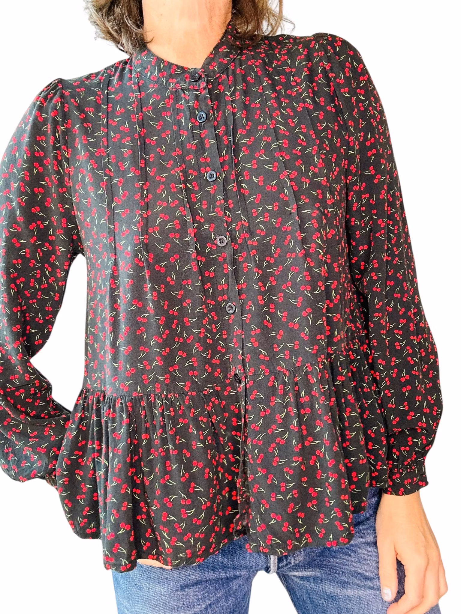 Beskrivning: Söt blus från danska Noella. I avslappnad form i ett härligt print - svart botten och en massa körsbär! Rund halsringning, knappar hela vägen ner framtill och en gullig volang i nederkant. Inte helt olik Rodebjers klassiska blus Lindy.