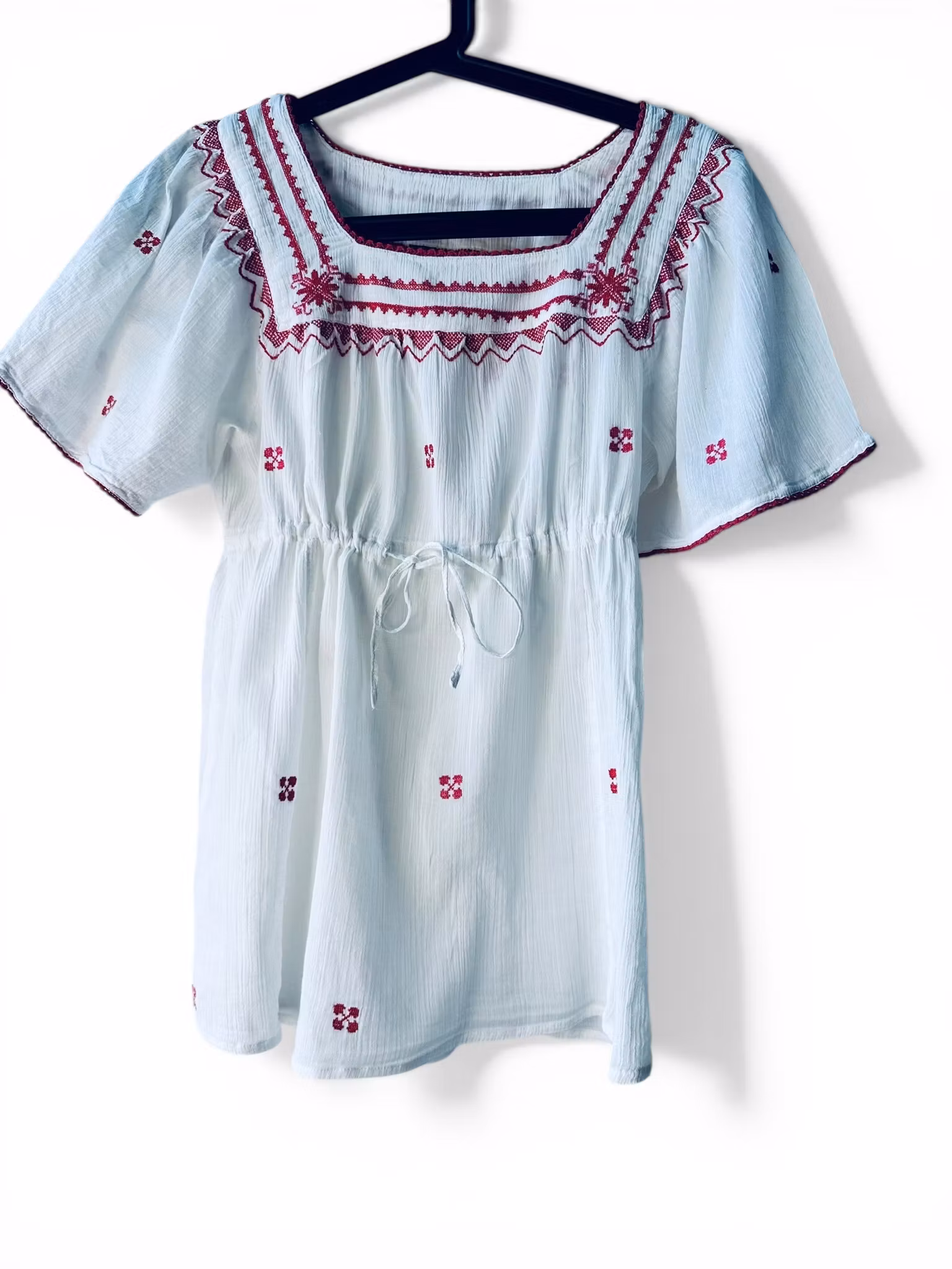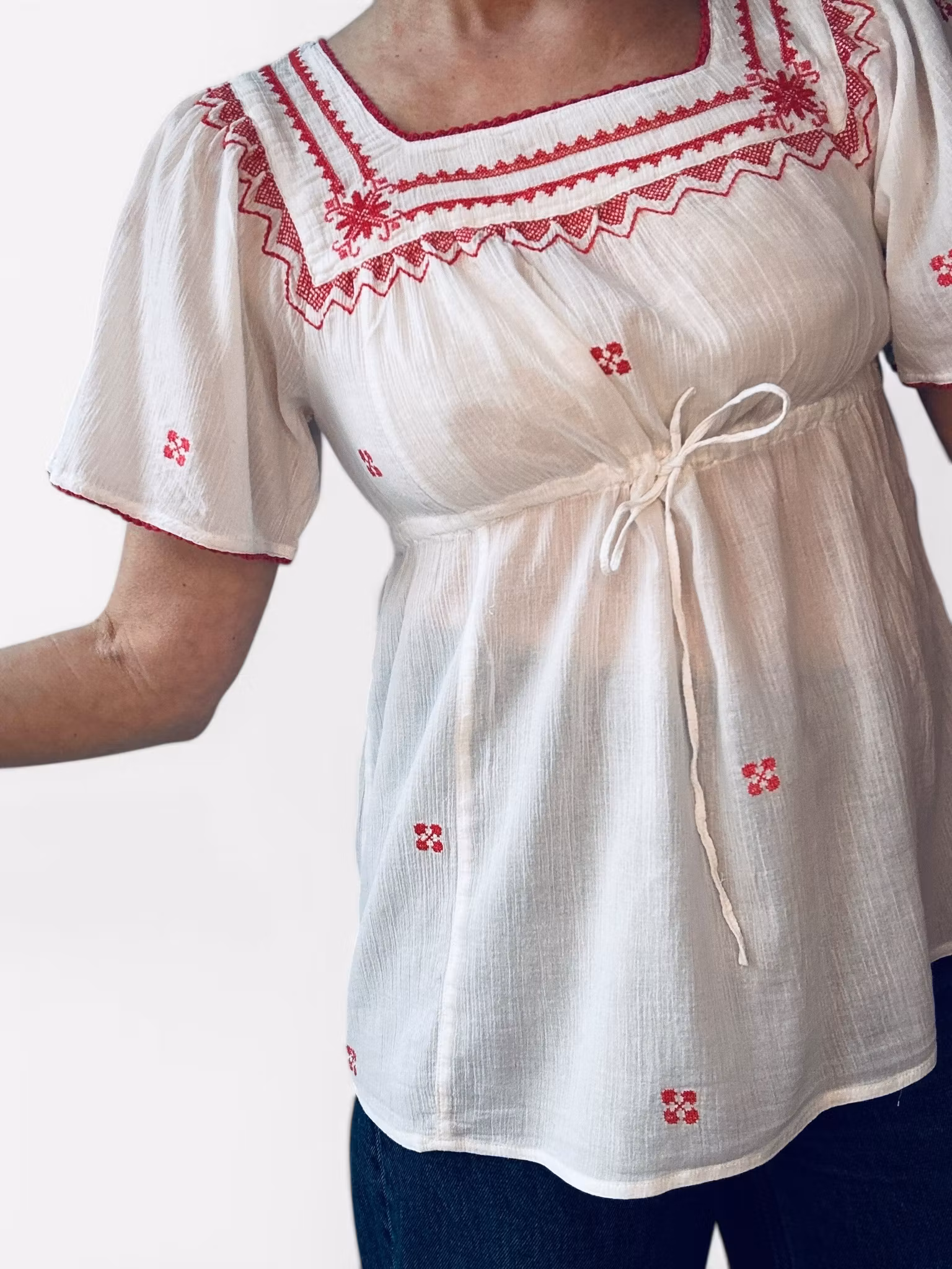 Beskrivning: En söt, bohemisk topp i vitt crinklat material som uppskattas vara bomull. Röda broderier och dragsko under brösten.