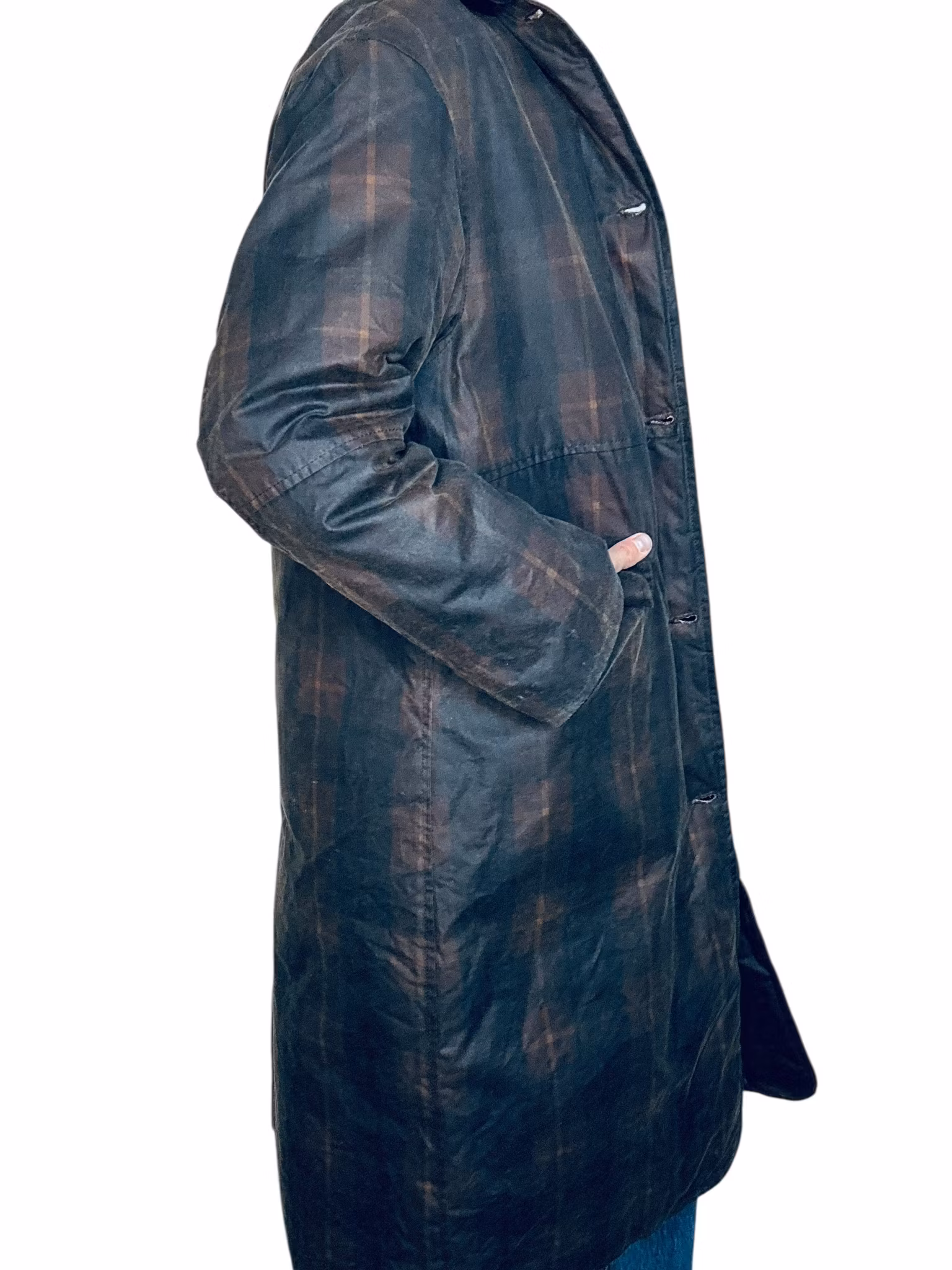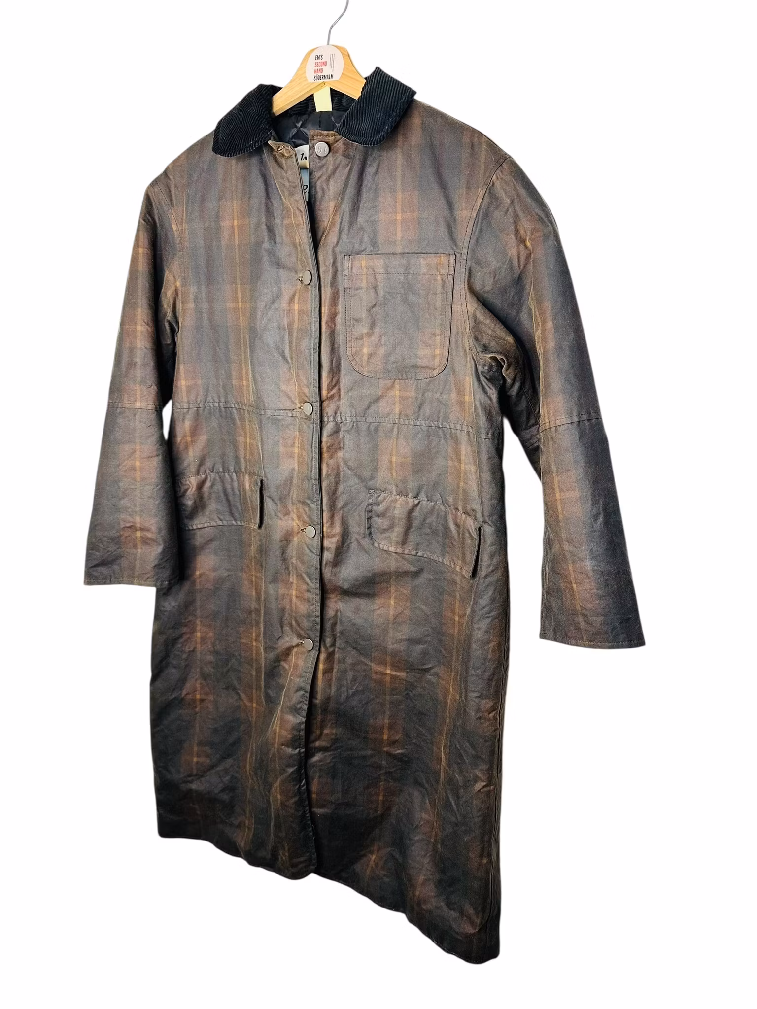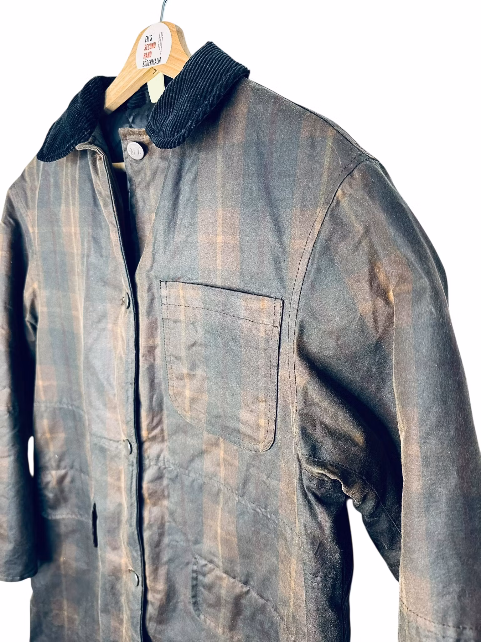 Beskrivning: En nutida klassiker - svensk Brixtol Textiles jacka Joan Jett padded med vattenavvisande vaxad bomullsyta. Den här är i färgen/printet brown tartan och har en brun manchesterkrage - ett tyg som även finns inuti ärmarna som en kan vika upp om en vill. Fickor med lock i sidorna och en bröstficka. Finns också innerfickor. Stängs med tryckknappar. Uppfattas som rymlig i storlek, se mått nedan. De första bilderna är lånade produktbilder.