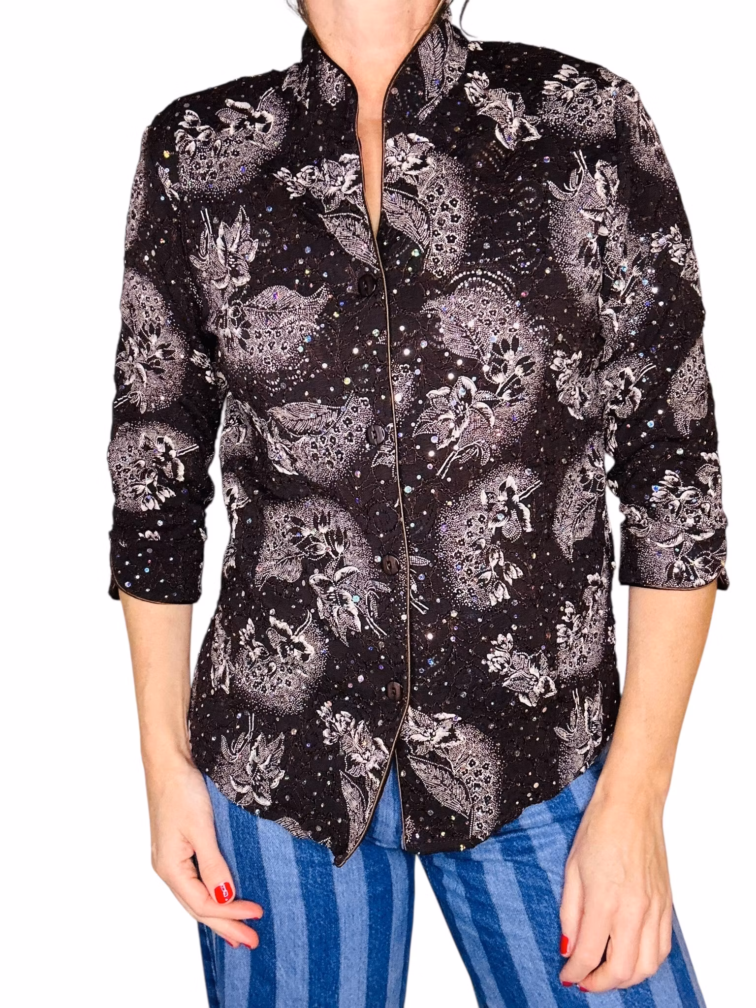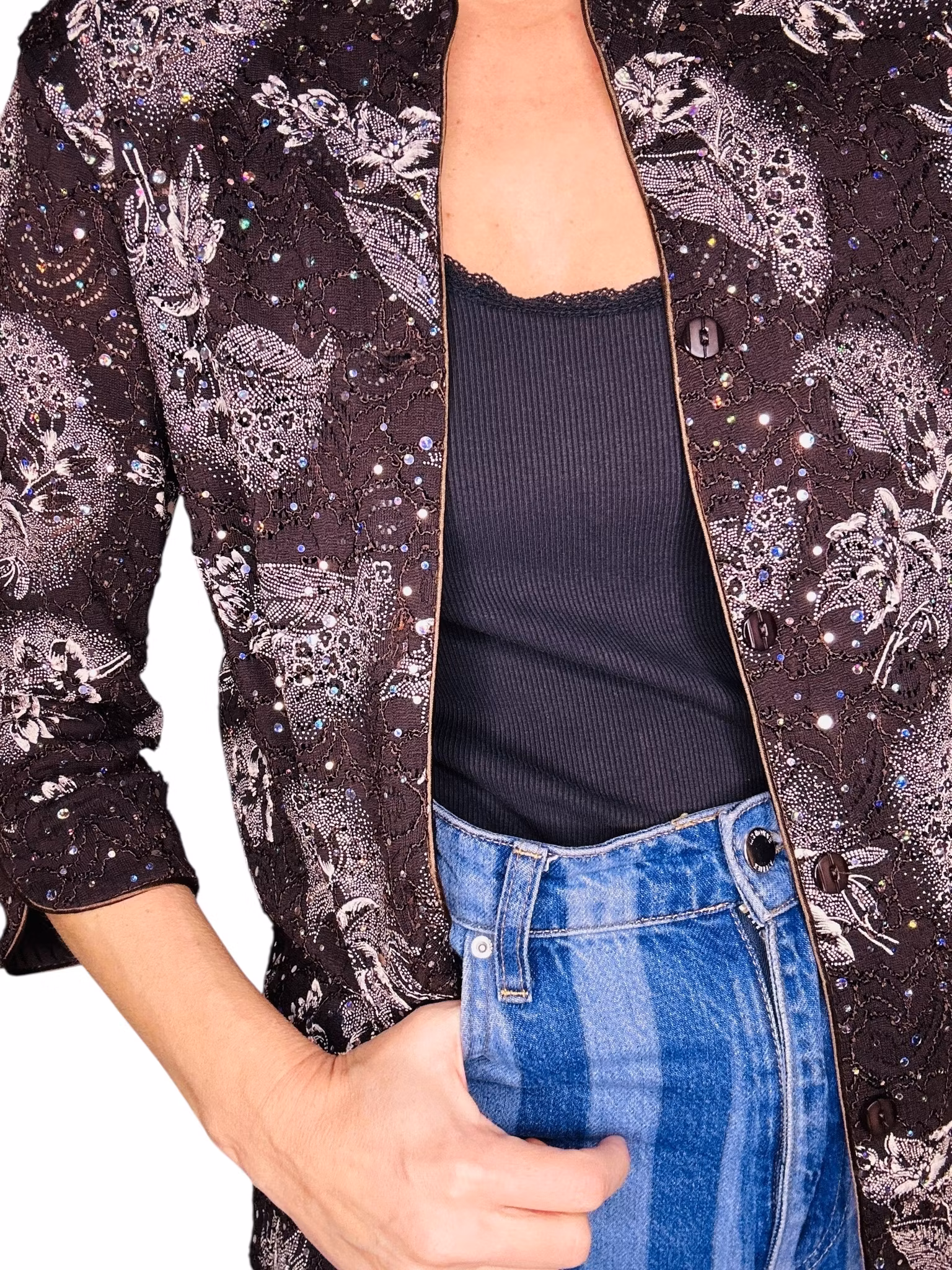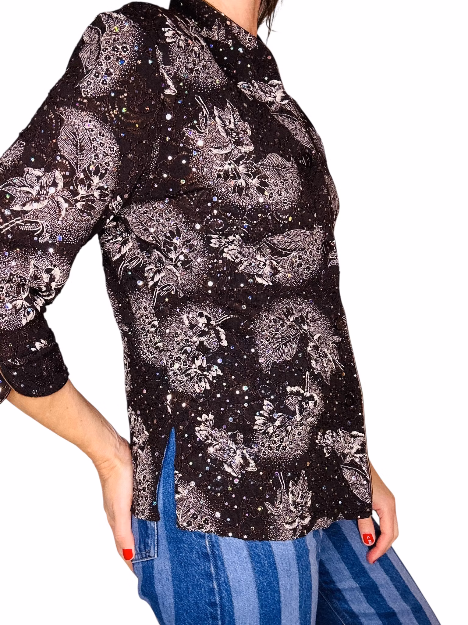 Beskrivning: En brun topp märkt "New Jersey". Trevkartsärm, nätta axelvaddar och liten ståkrage. Knappar hela vägen ner framtill, lika fin att bära stängd som öppen. Tryckt mönster i cremevitt med brunna broderier, spetshålmönster och påsydda paljetter och strass. Tunt kantade ärmslut och krage med brunt, blankt tyg. Små slitsar i sidorna.