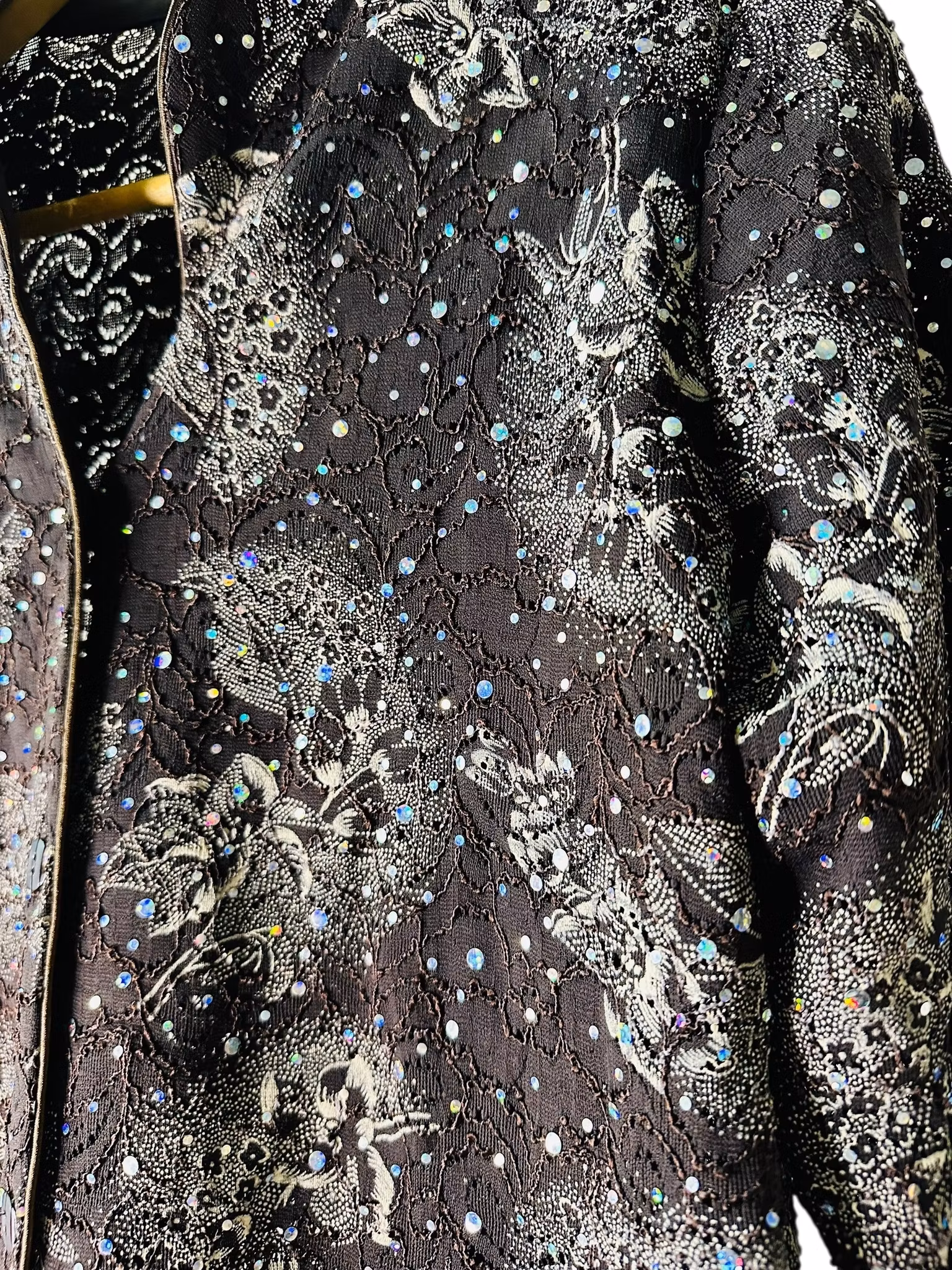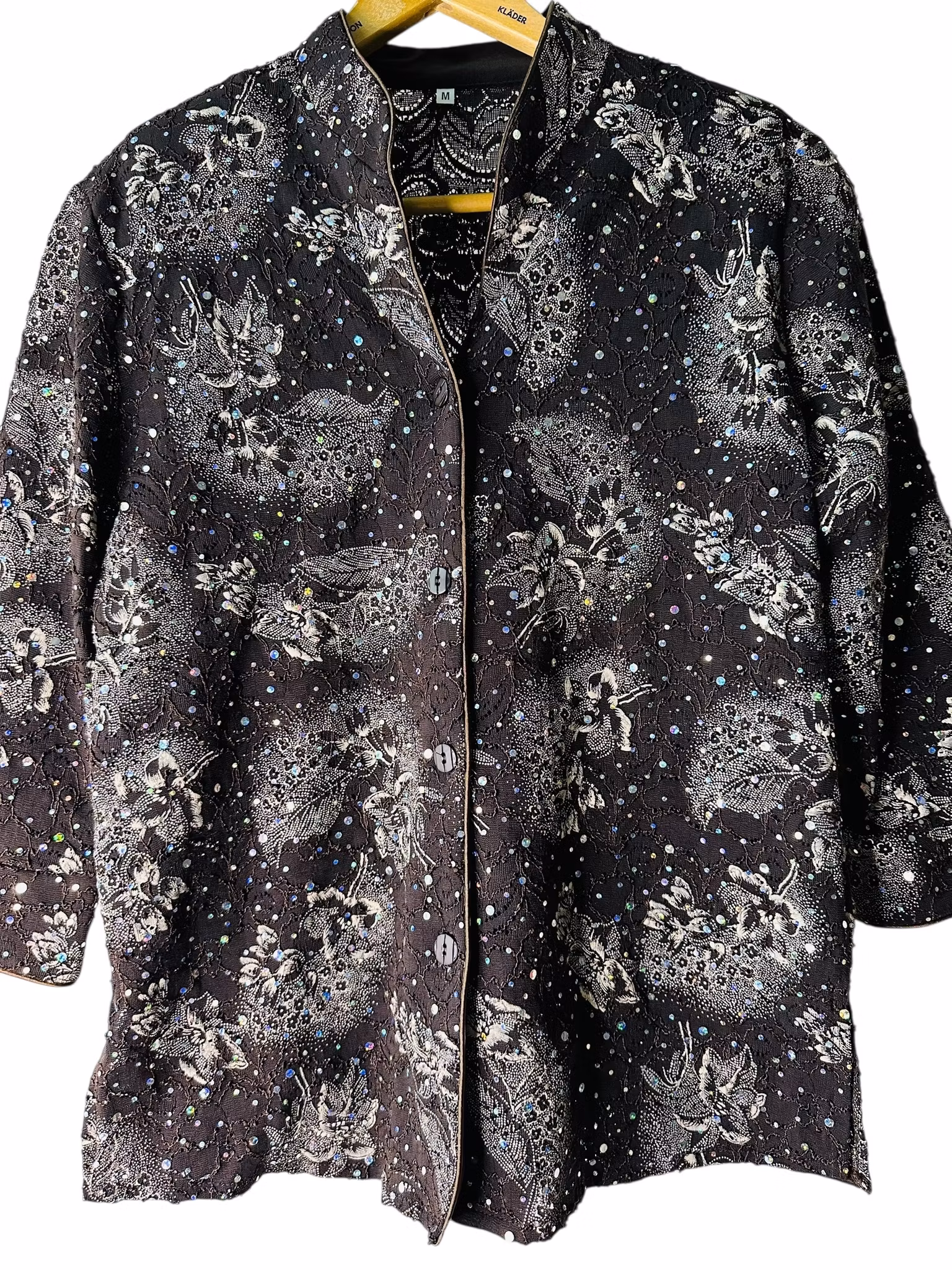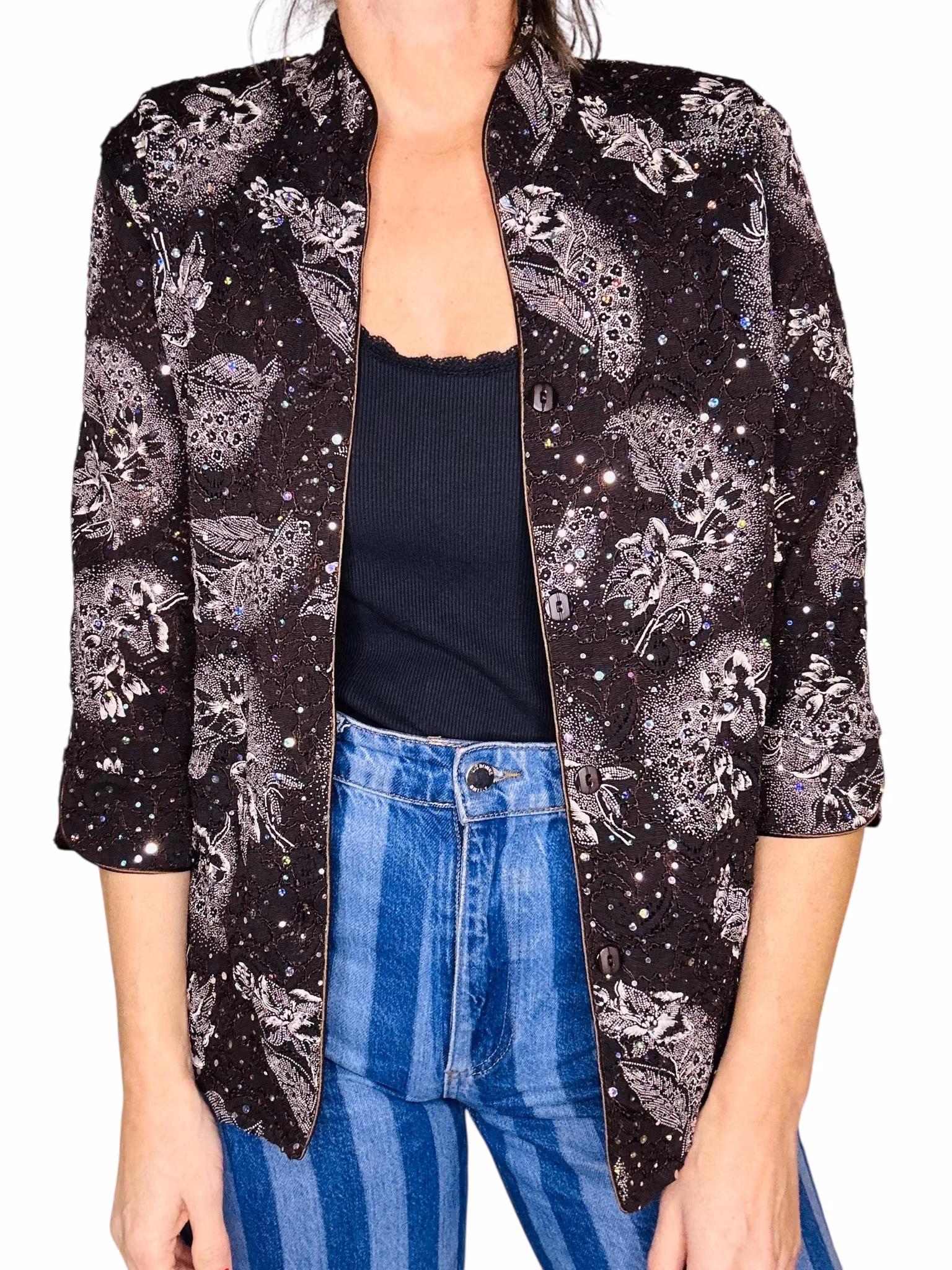 Beskrivning: En brun topp märkt "New Jersey". Trevkartsärm, nätta axelvaddar och liten ståkrage. Knappar hela vägen ner framtill, lika fin att bära stängd som öppen. Tryckt mönster i cremevitt med brunna broderier, spetshålmönster och påsydda paljetter och strass. Tunt kantade ärmslut och krage med brunt, blankt tyg. Små slitsar i sidorna.