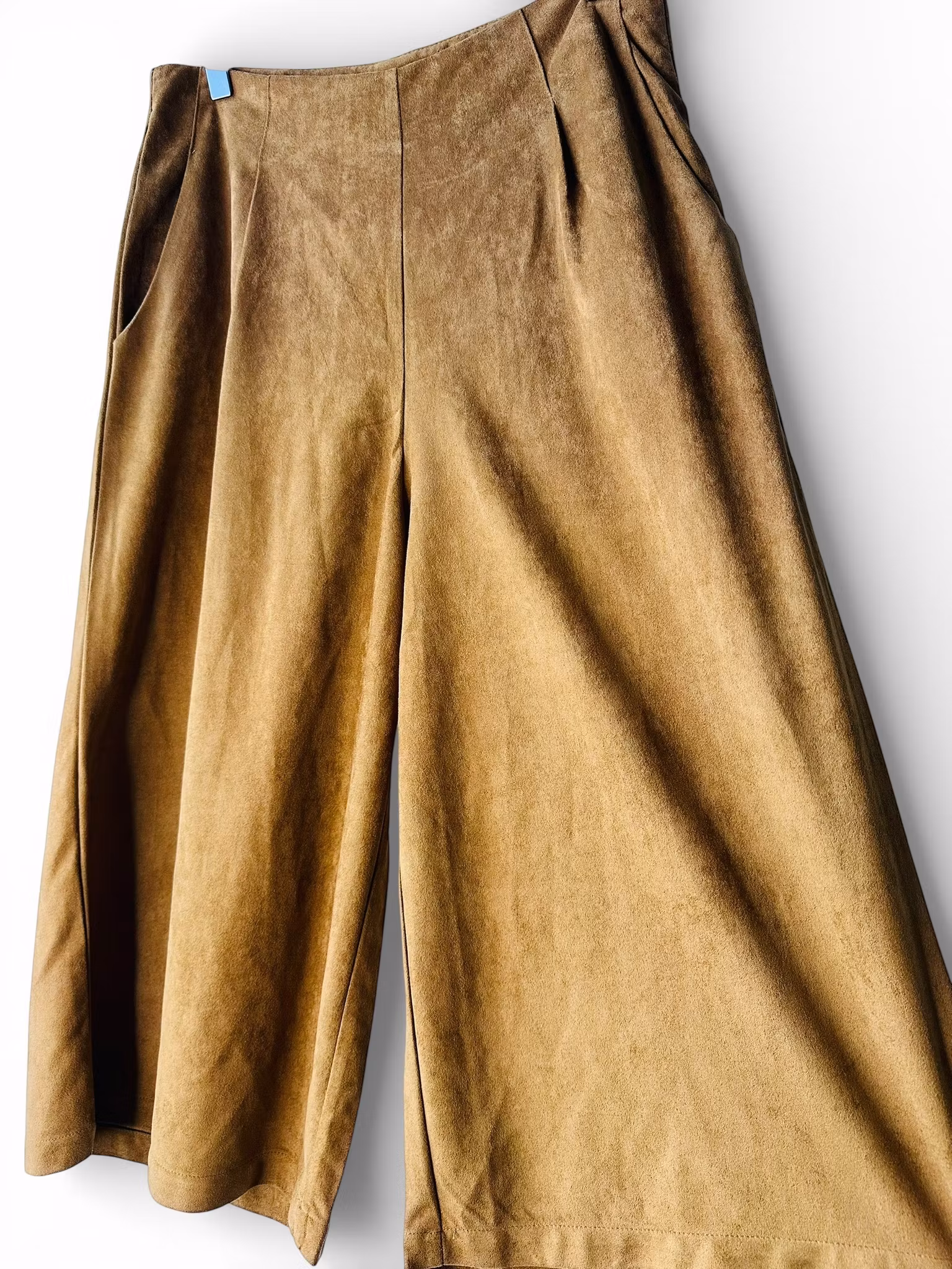 Beskrivning: Vårens hetaste byxa - culottebyxan! I mockaimitation i den perfekta konjaksbruna nyansen. Hög midja och vida ben, fickor i sidorna och en stolpficka baktill. Stängs med dragkedja i sidan. Från Cherry Paris.