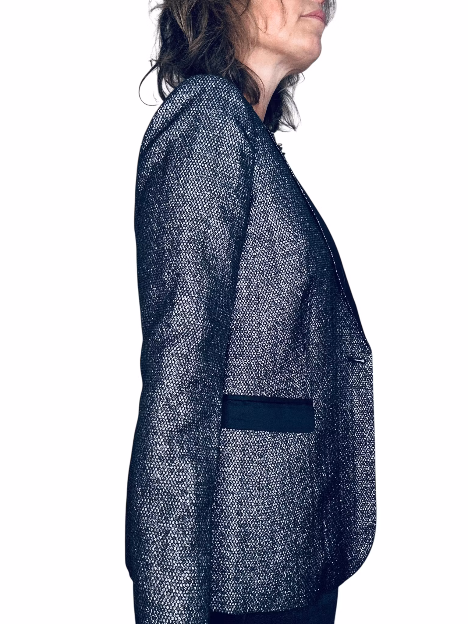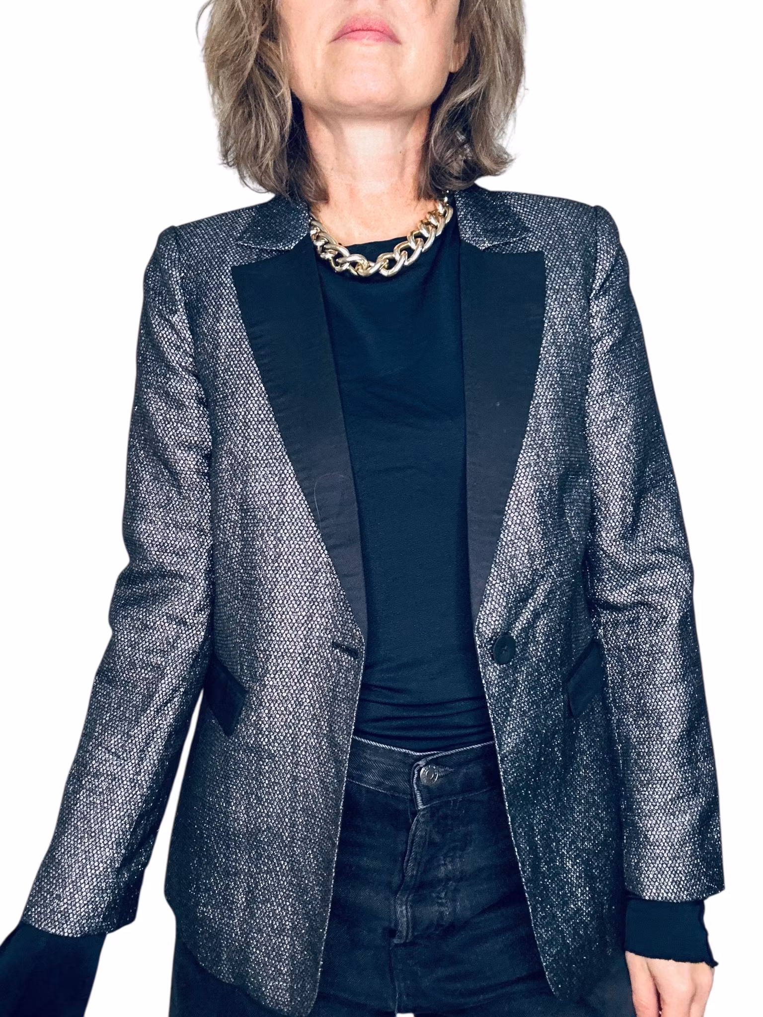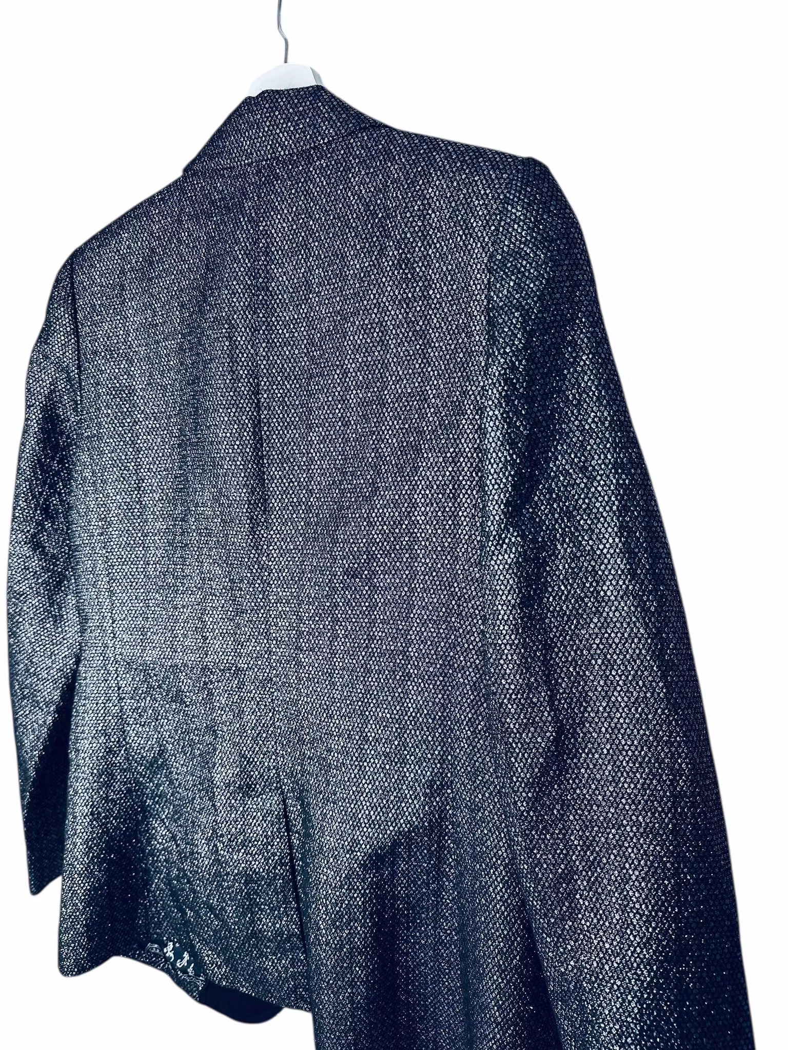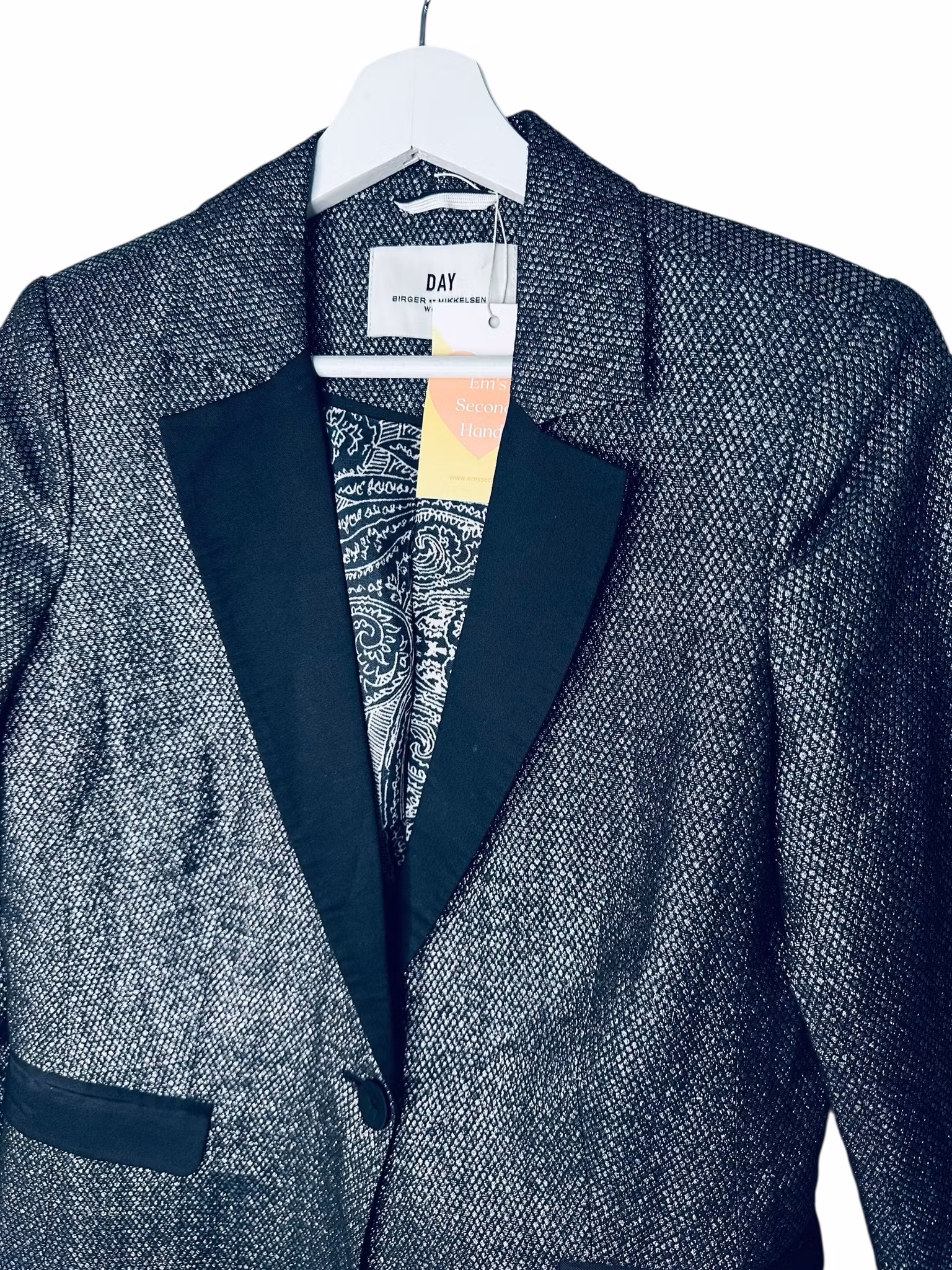 Beskrivning: En kavaj i svart och silver från danska Day Birger et Mikkelsen. Slagen är svarta liksom ficklocken och den klädda knappen som stänger kavajen i midjan. Fodrad med glansigt mönstrat foder och med en innerficka.