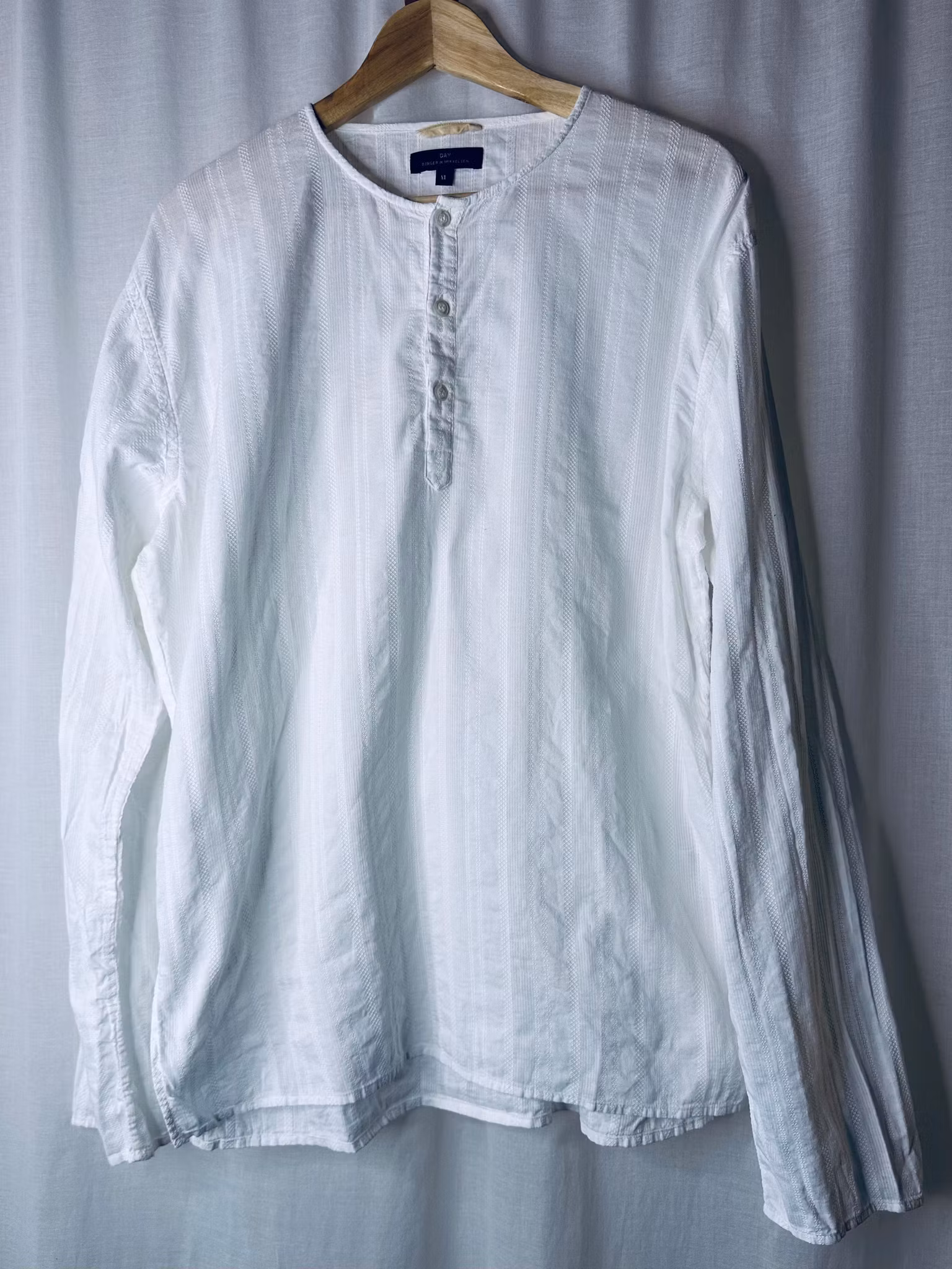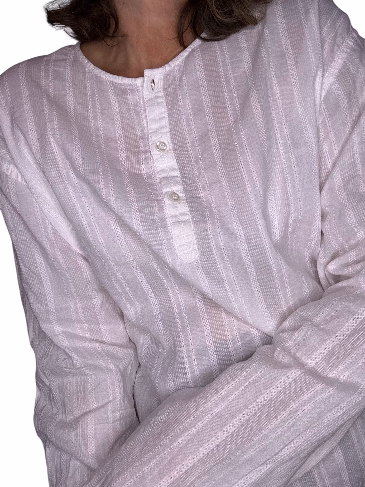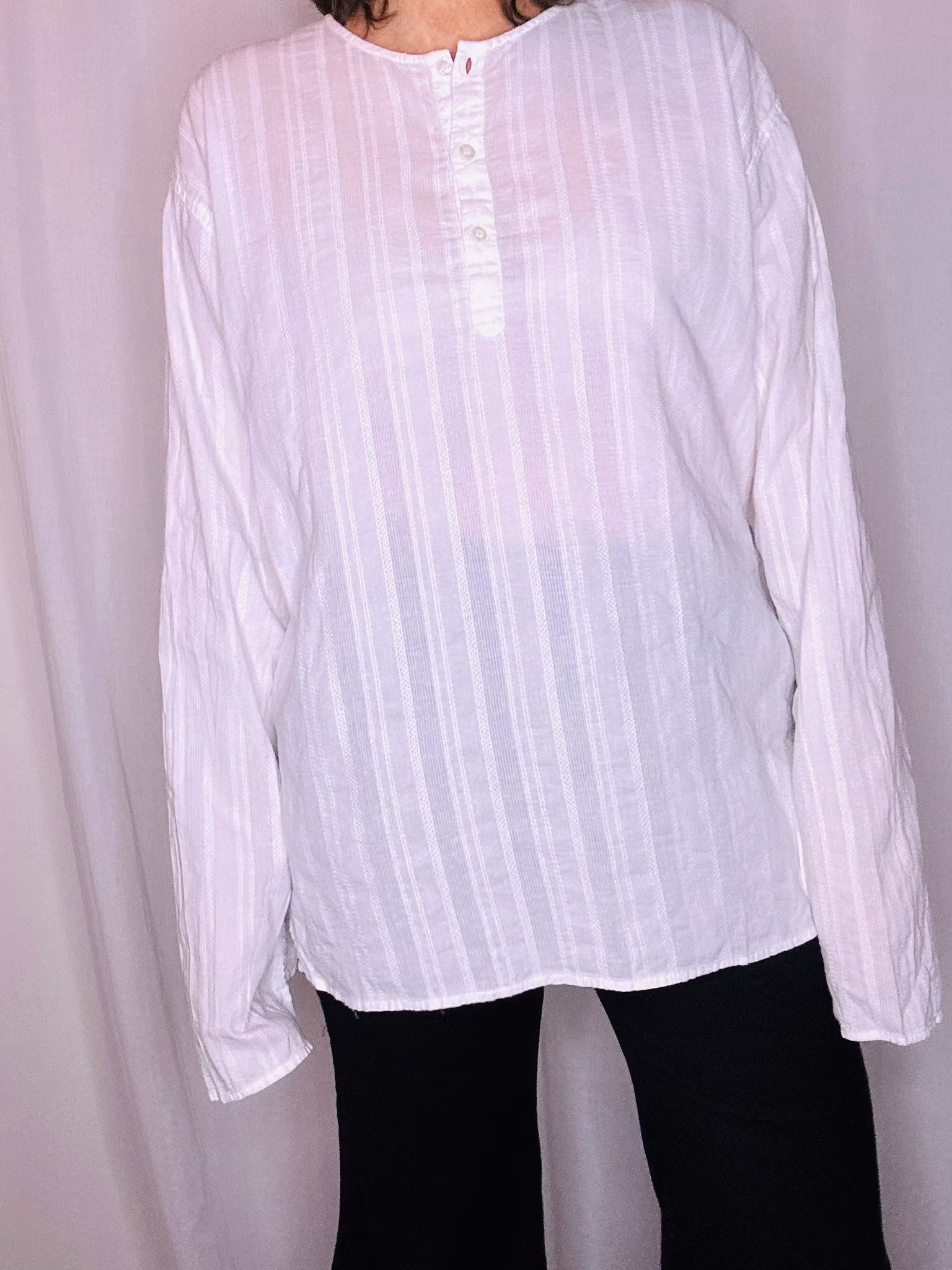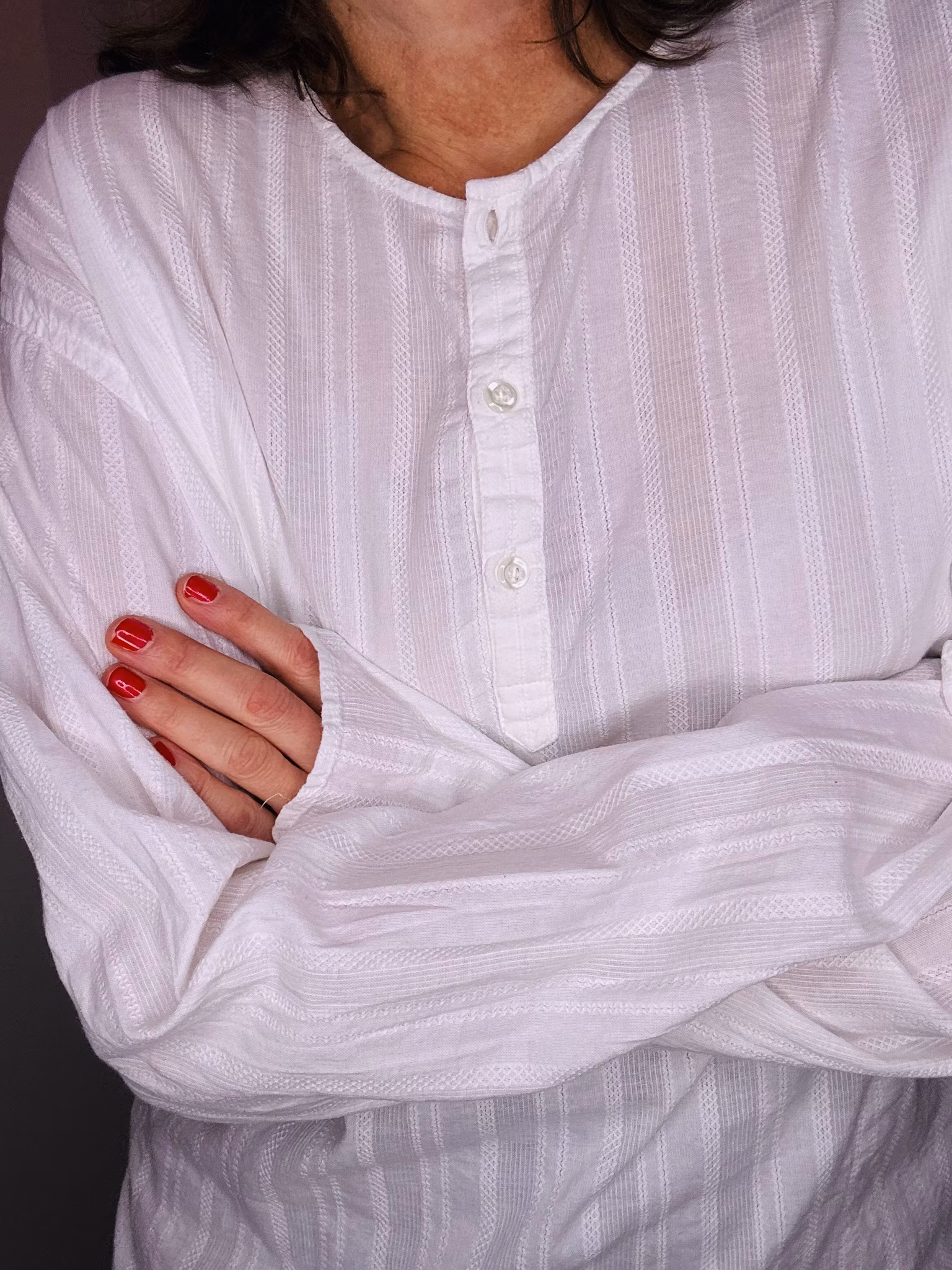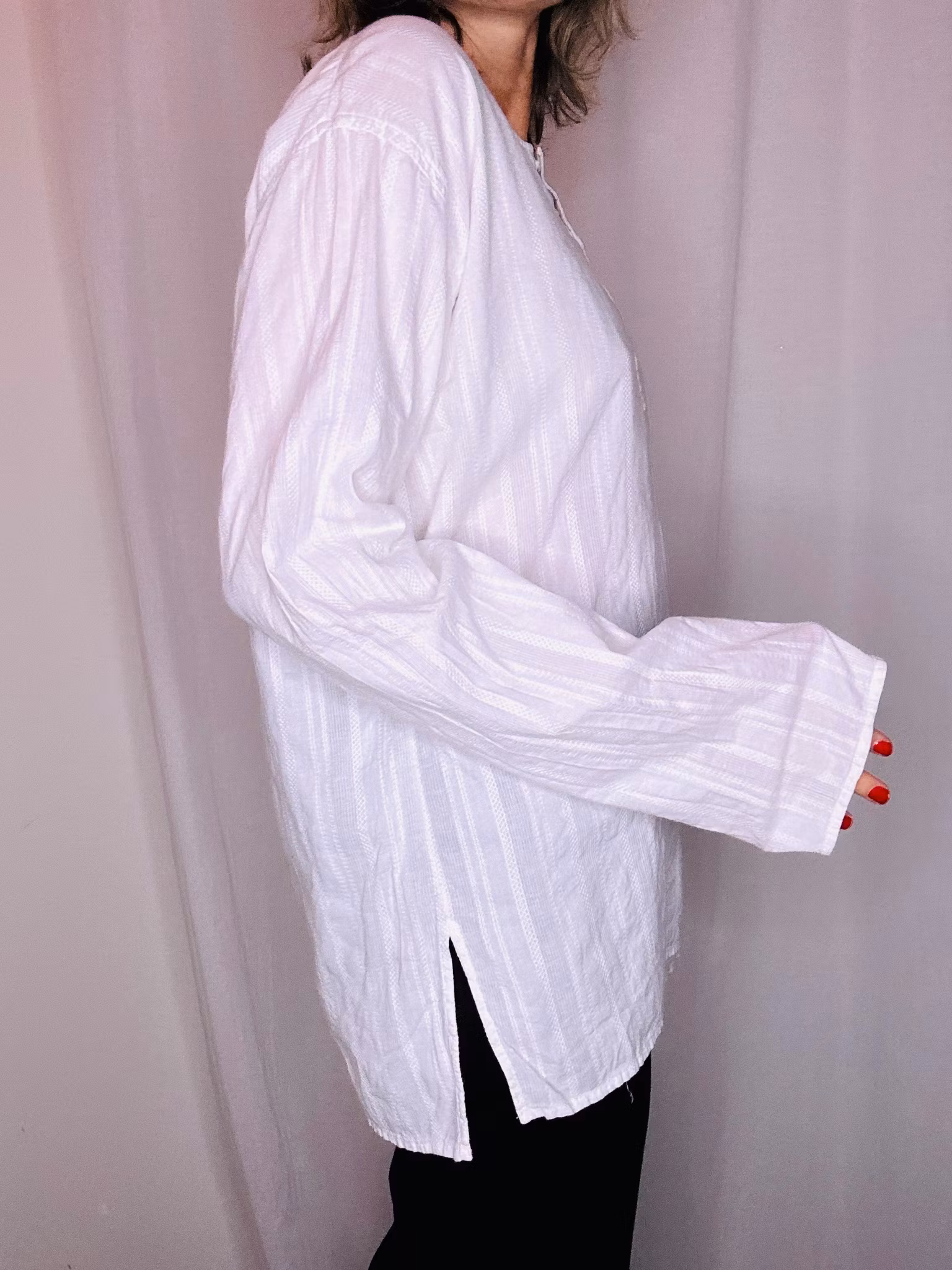 Beskrivning: Topp i vit, mönstervävd bomull i farfarsmodell från Day Birget et Mikkelsen. Med liten knappslå i halsen, långa ärmar och slitsar i sidorna. Finns även en hängare i nacken.