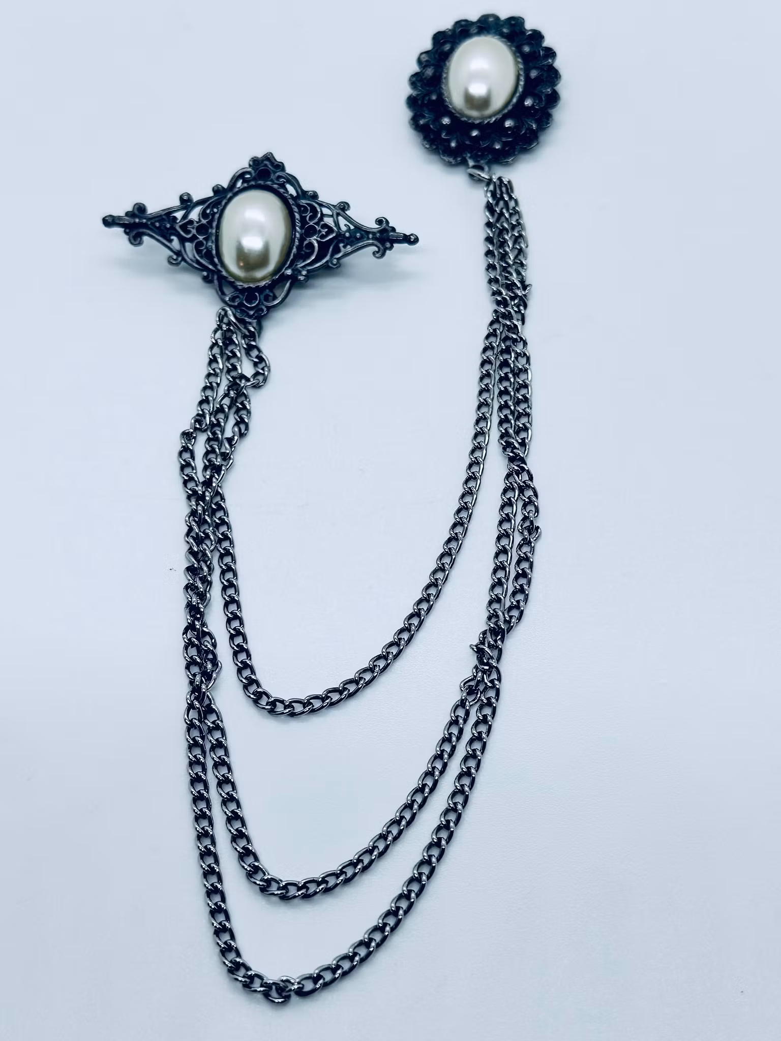 Beskrivning: Brosch i oxiderad silvermetall med två fästen som båda har pärlor på sig och som sitter ihop i varandra med tre kedjor.