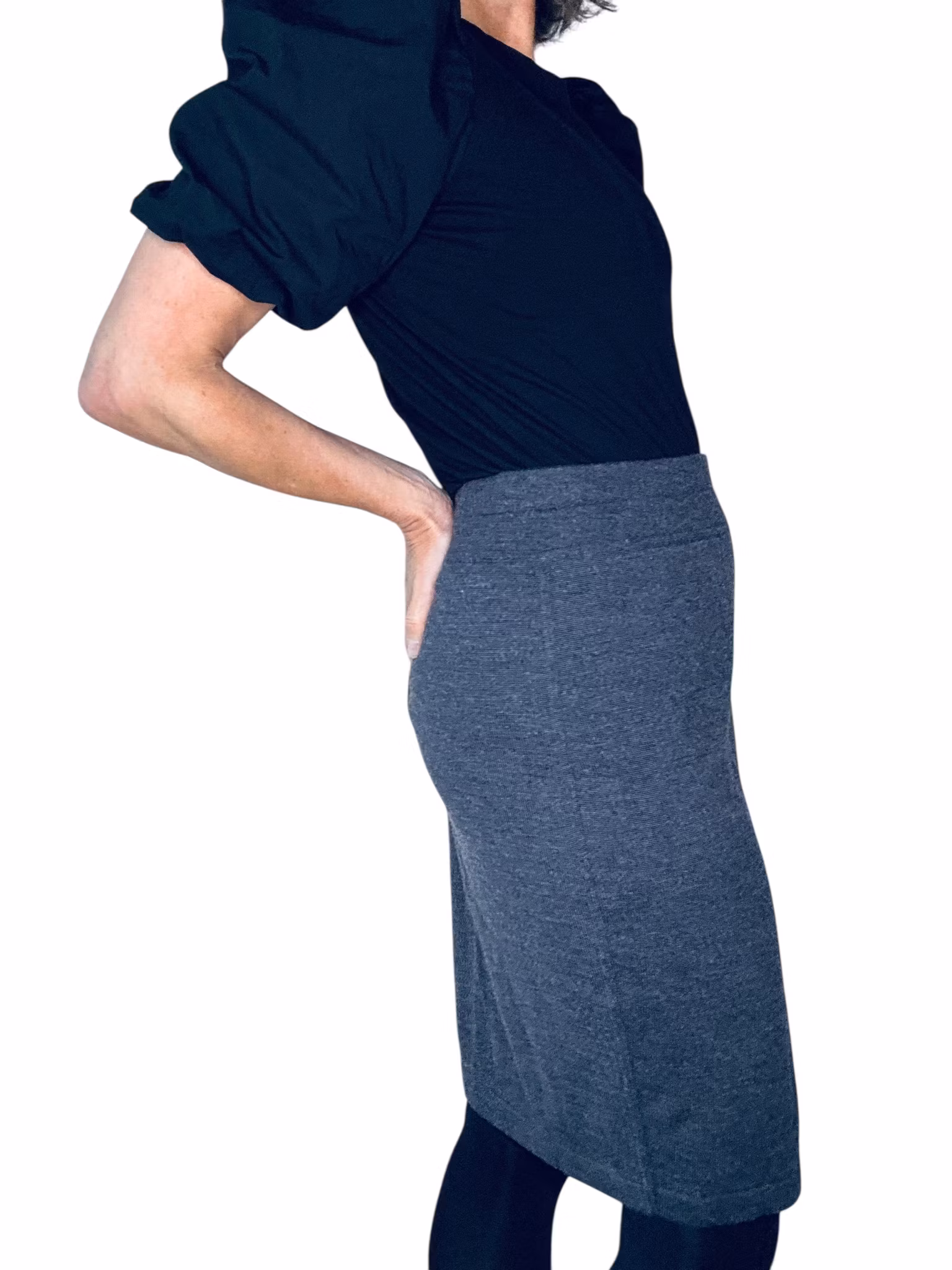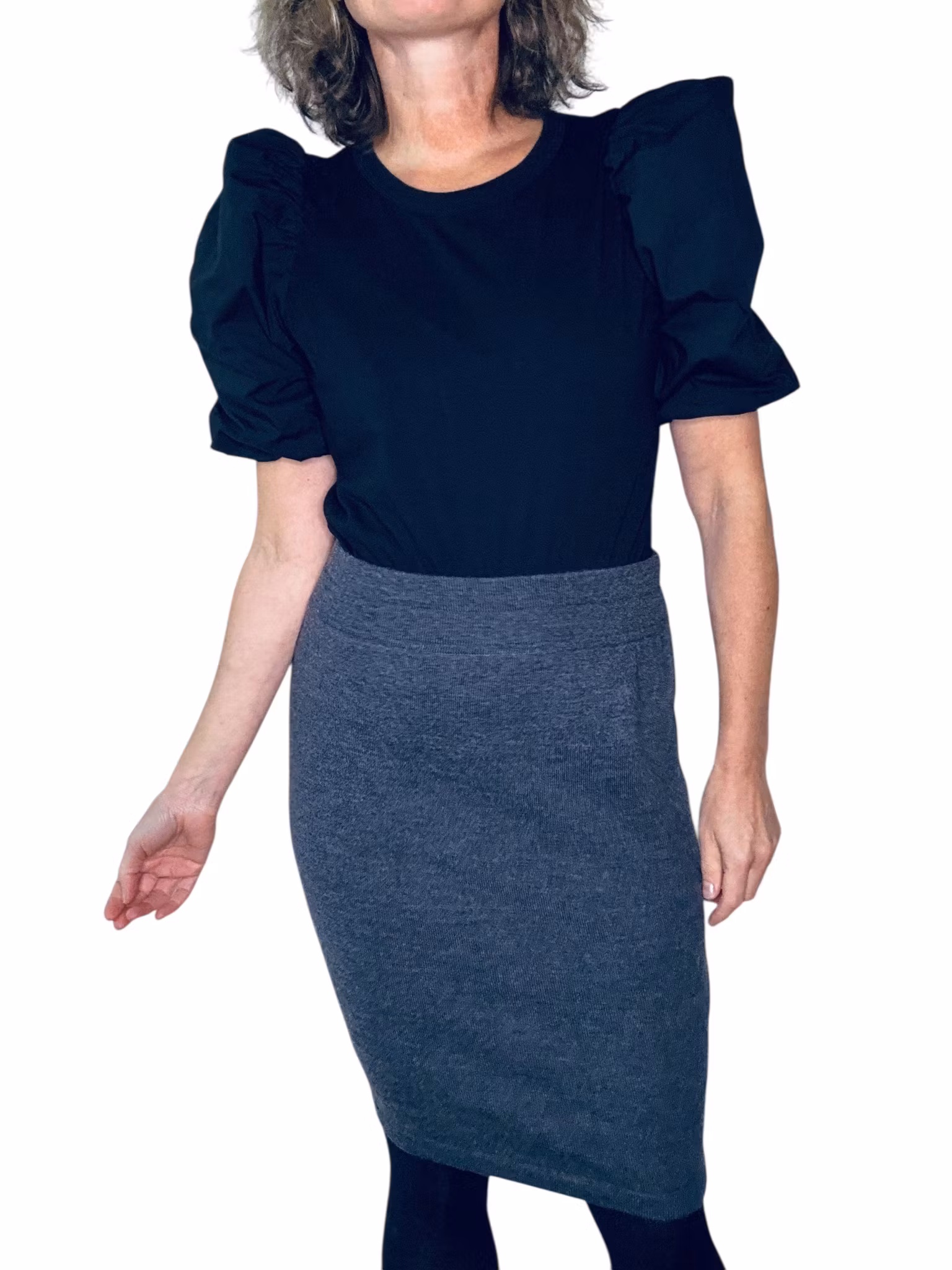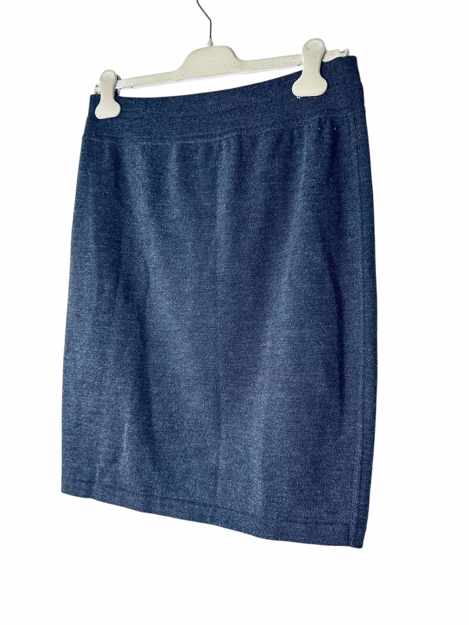Beskrivning: En stickad kjol i grå ull- och kashmirmix. Rak tubmodell med elastik över hela kjolen. Från Escada by Margareta Ley.