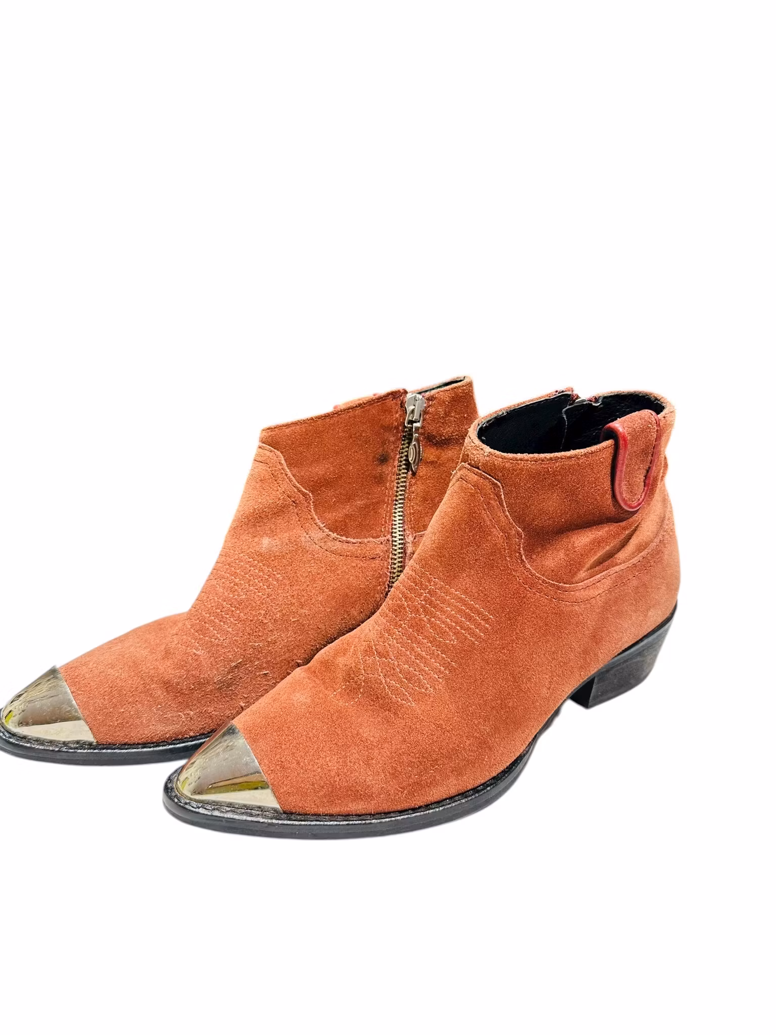 Beskrivning: Vinröda mockaboots från holländska Fabienne Chapot. Cowboysömmar framtill, metallhätta på tårna och dragkedja i sidan. Finns några fläckar och lite ludd i mockan, se bilder.