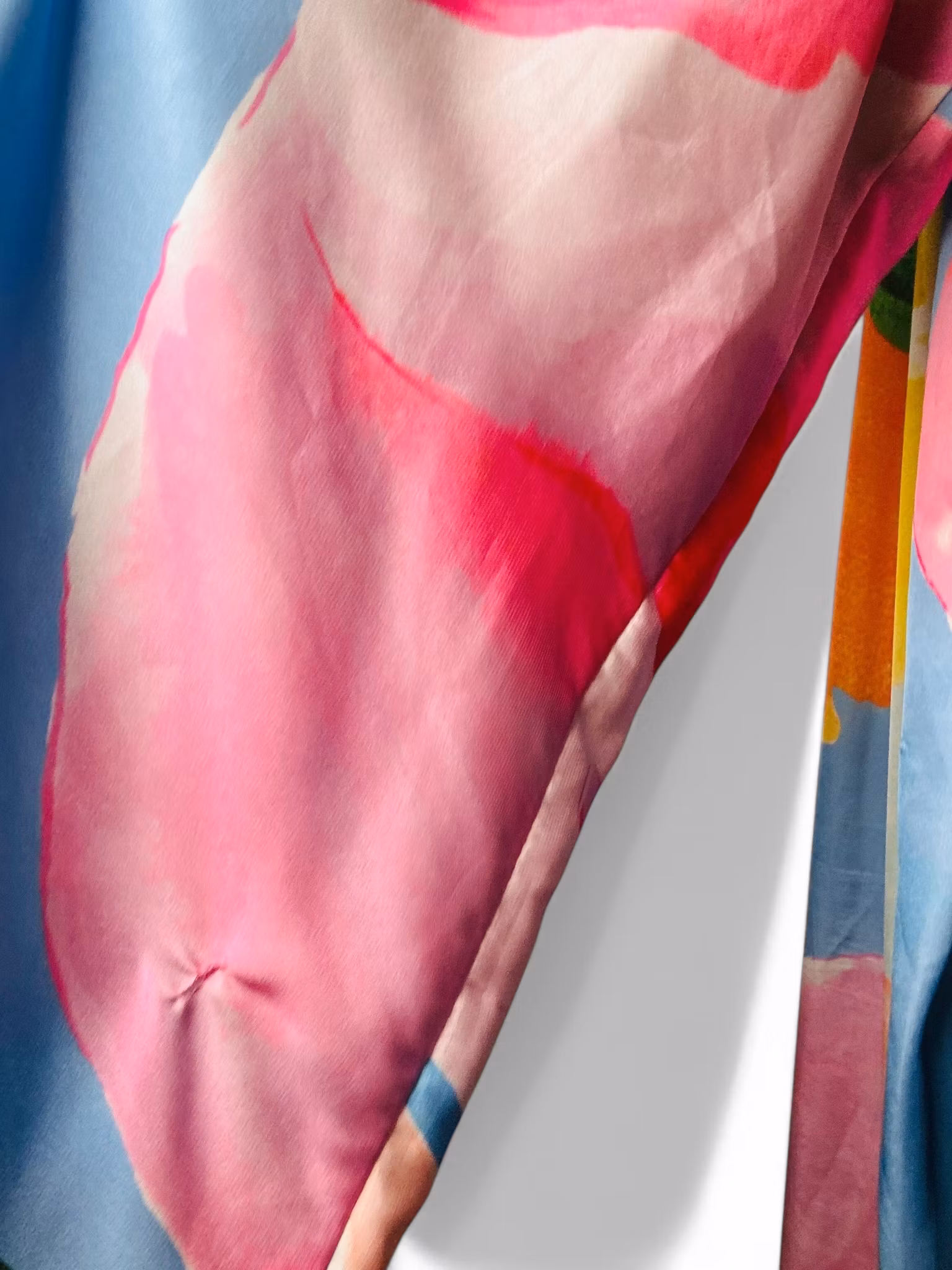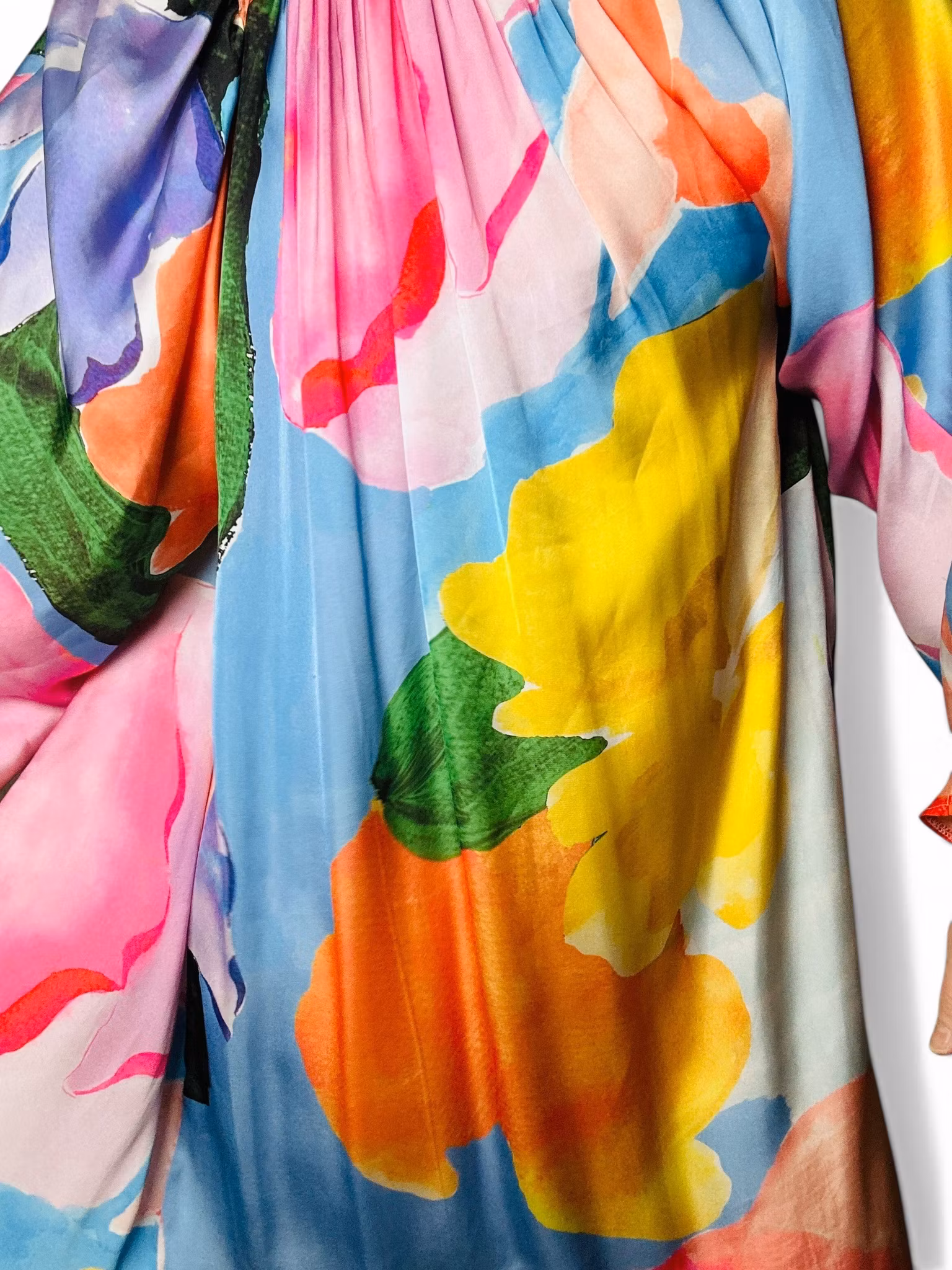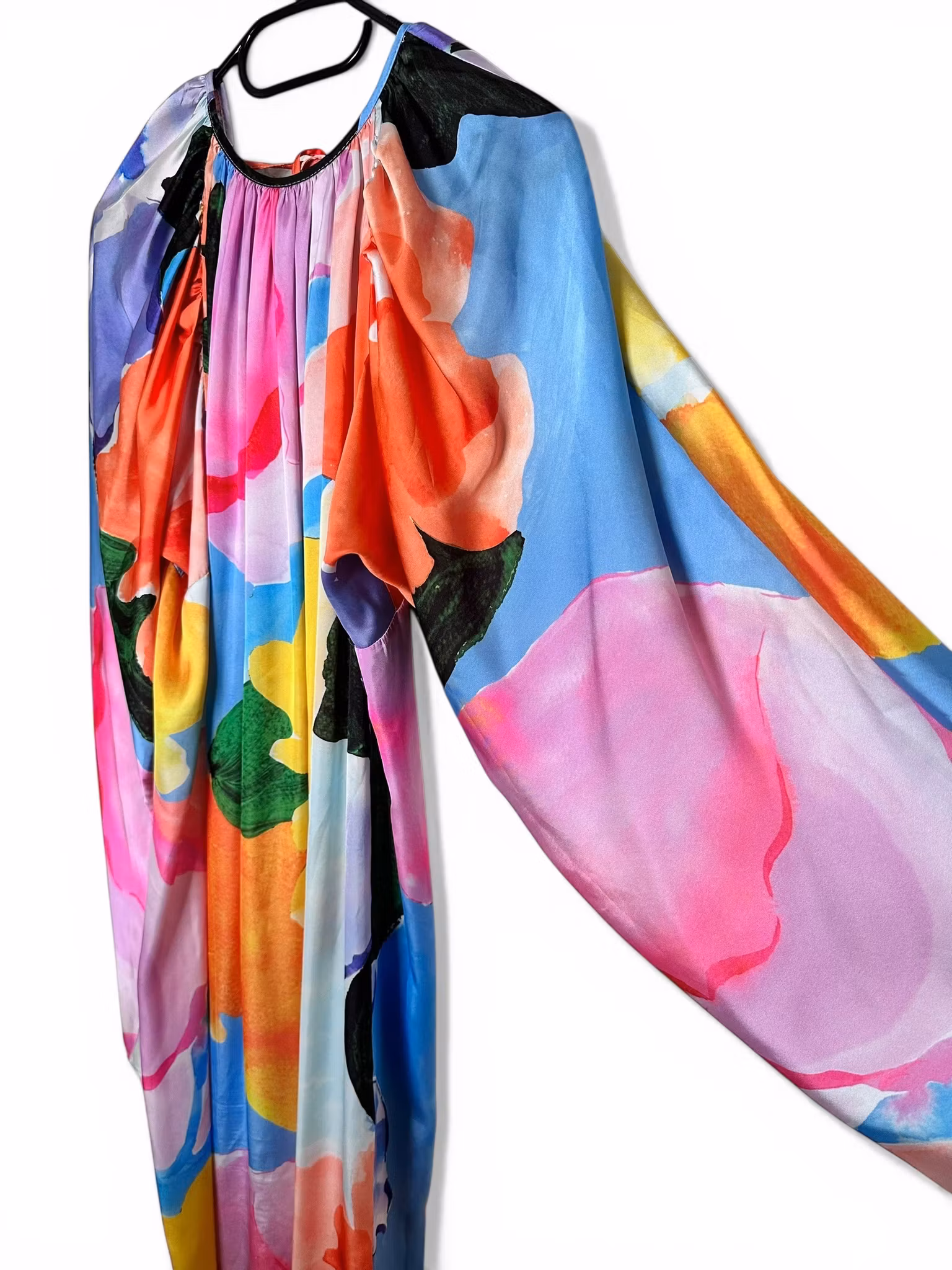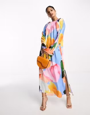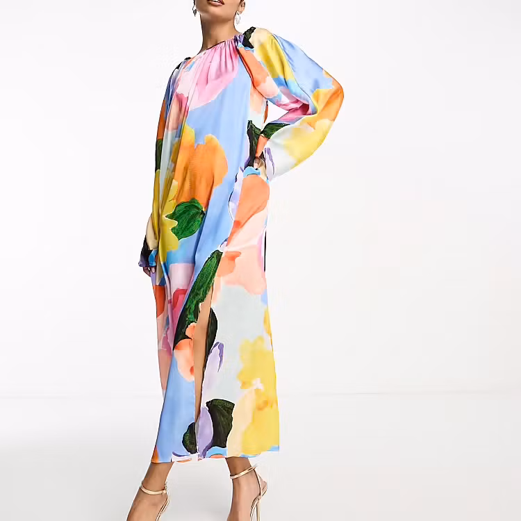 Beskrivning: Färgglad klänning från ASOS Design. Flowy modell med mycket tyg och vackra rynkningar. Djup rygg med knyt i nacken. Vida ärmar och en slits i sidan. Det finns en liten lagning på ena ärmen, se närbild. De fyra sista bilderna är lånade produktbilder.