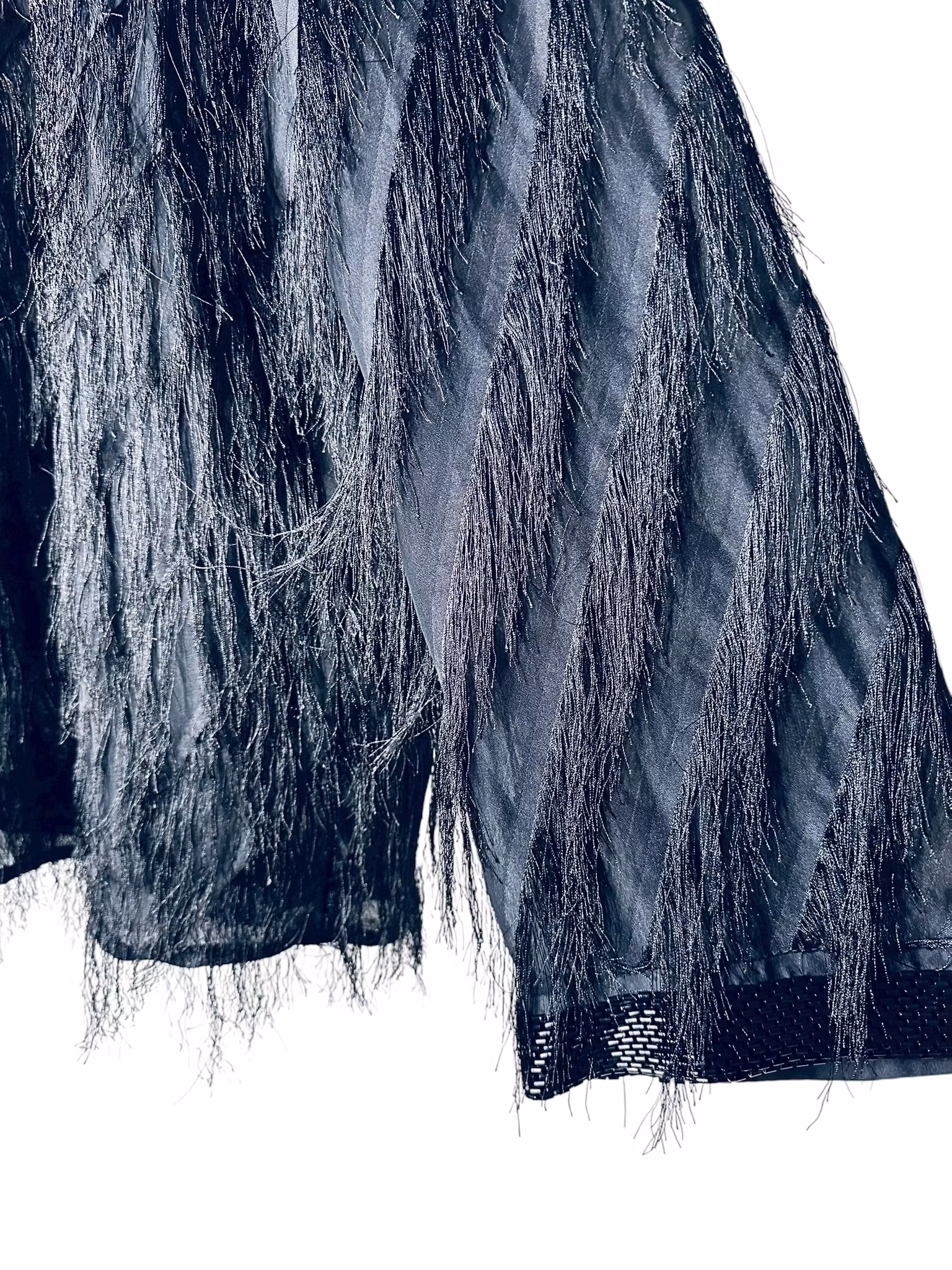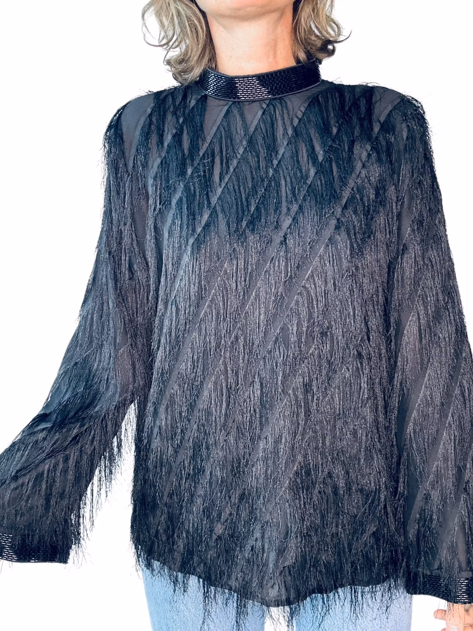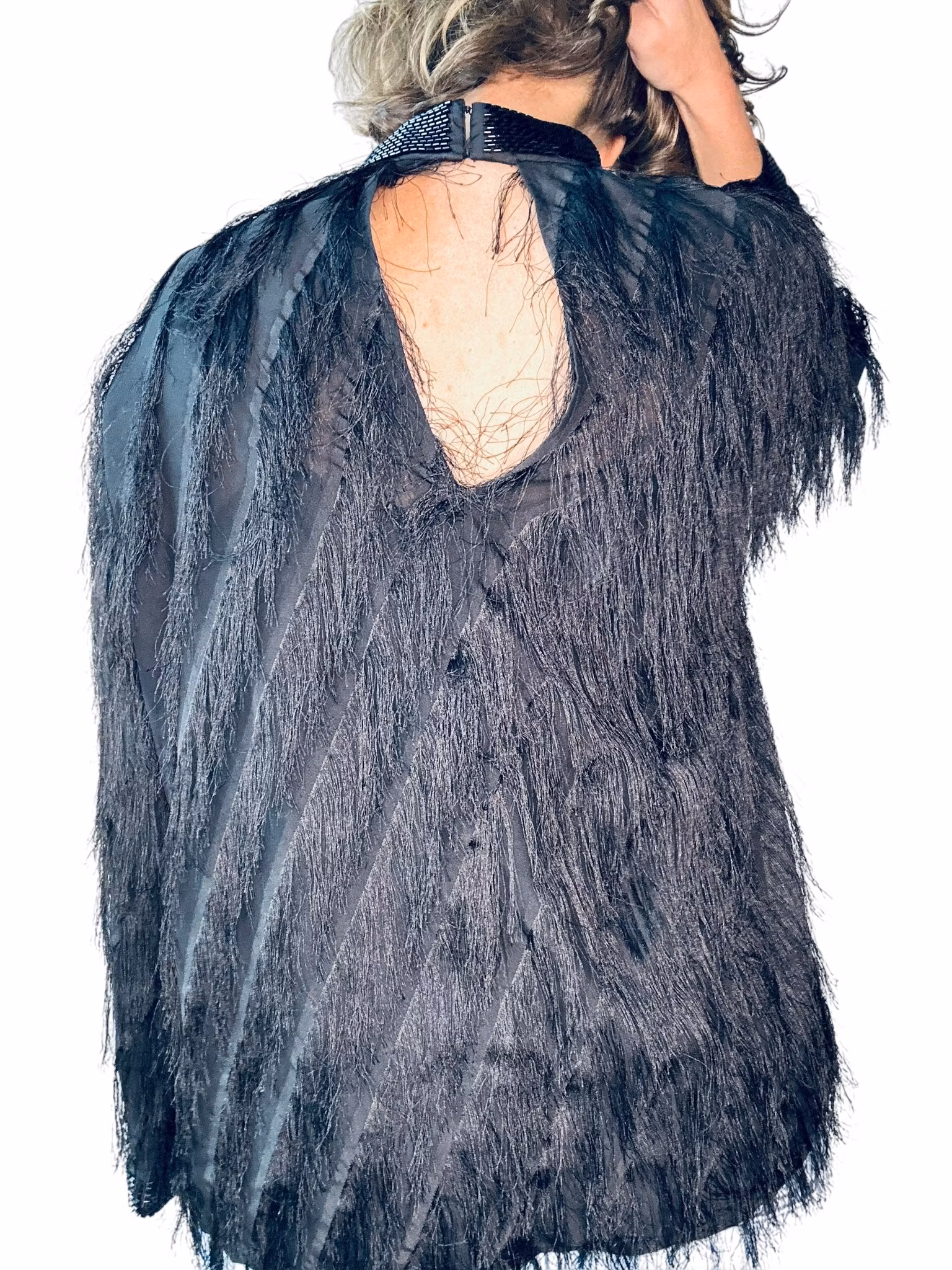 Beskrivning: Topp med fransar i diagonala ränder. Kragen är hög och pärlad och stängs med hyskor i nacken över en lång nyckelhålsöppning. Modellen är vid och ärmarna likaså och de avslutas liksom kragen med en pärlad kant. Uppfattas som rymlig i storlek. Från HM Edition.