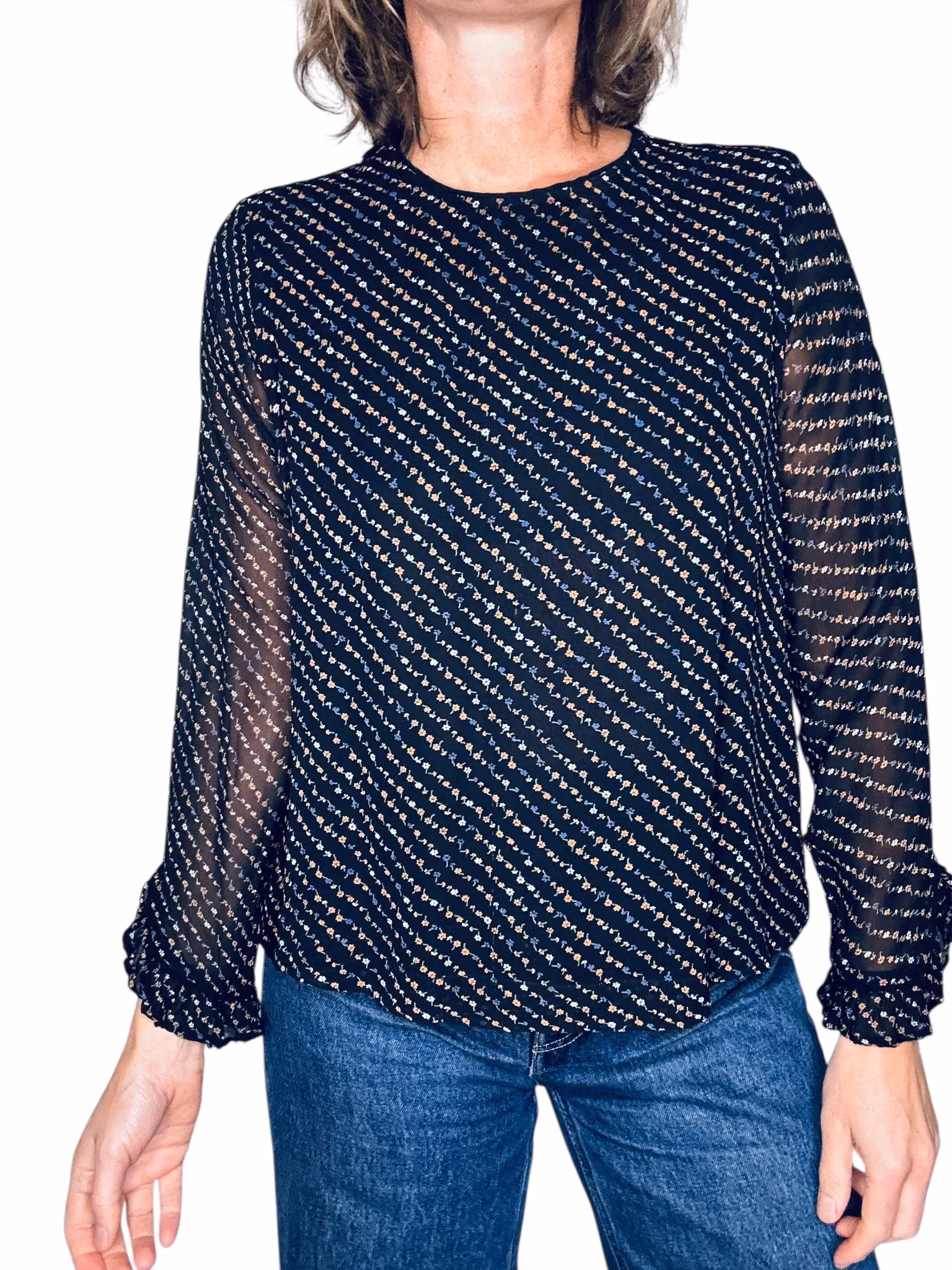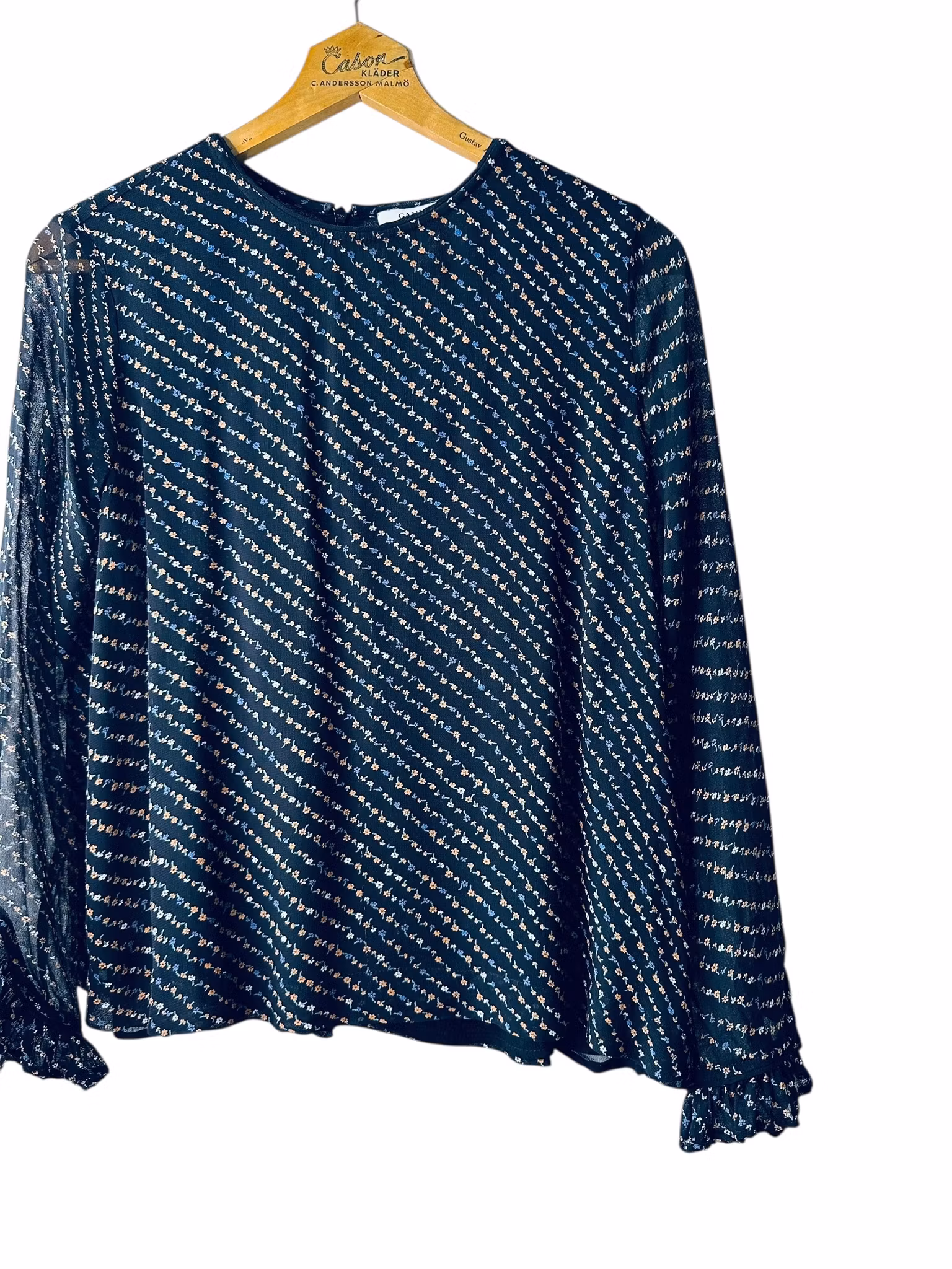 Beskrivning: Gannis söta blus med slät framsida och en baksida med ett ok och veckat nedanför. Stängs med dragkedja i ryggen. Ärmar med volangkant. Fodrat liv. Randigt mönster där ränderna utgörs av små, små blommor.