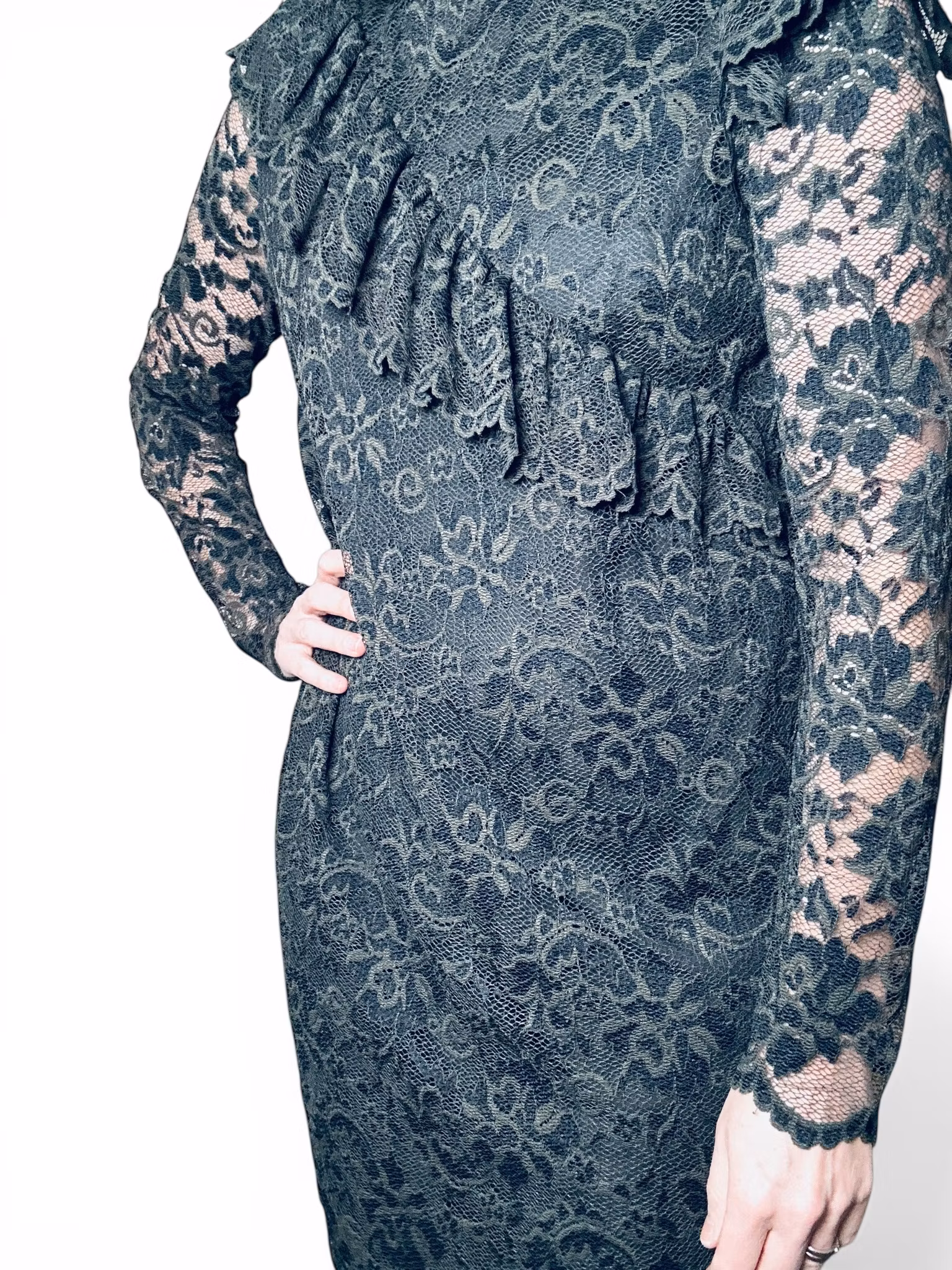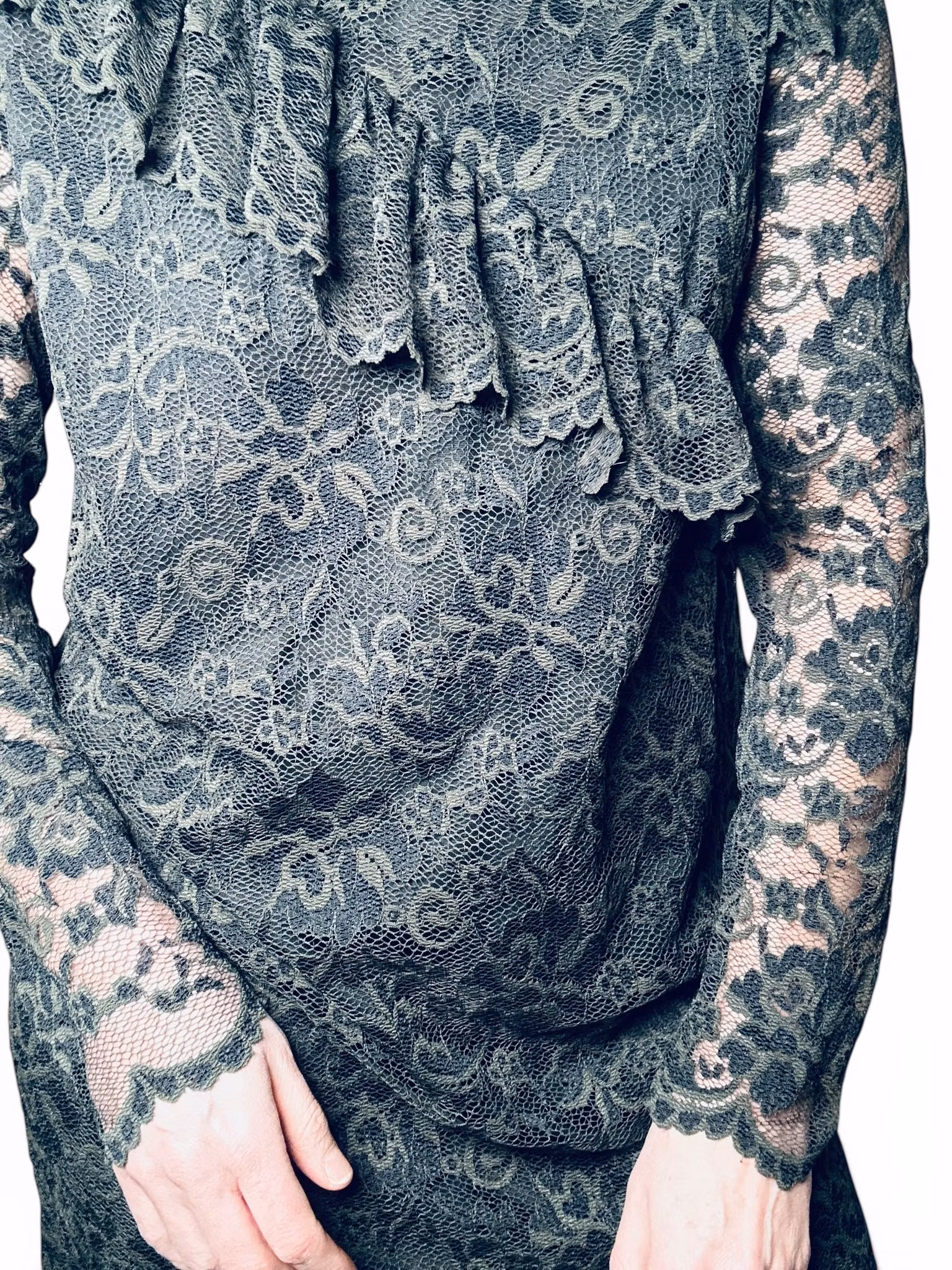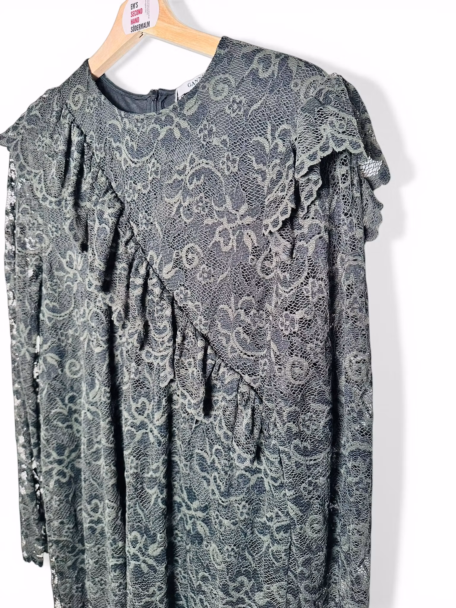 Beskrivning: Gannis Flynn Lace dress i genombruten grön spets med en volang diagonalt över fronten och volanger som markerar axlarna. Lång ärm och fodrad kropp. Stretchig och normal till rymlig i storleken. Sista bilden är en lånad produktbild.