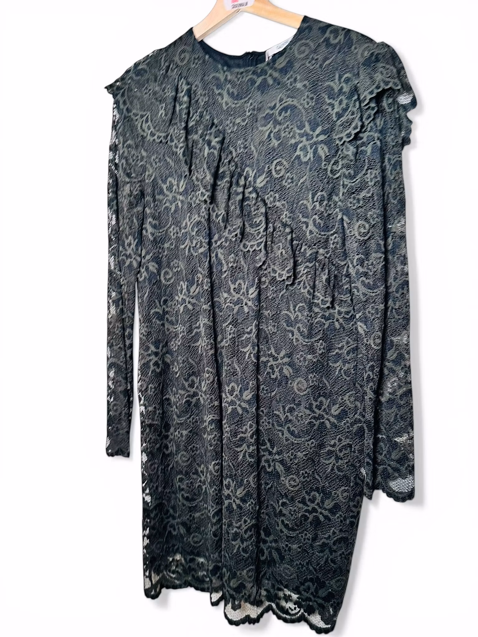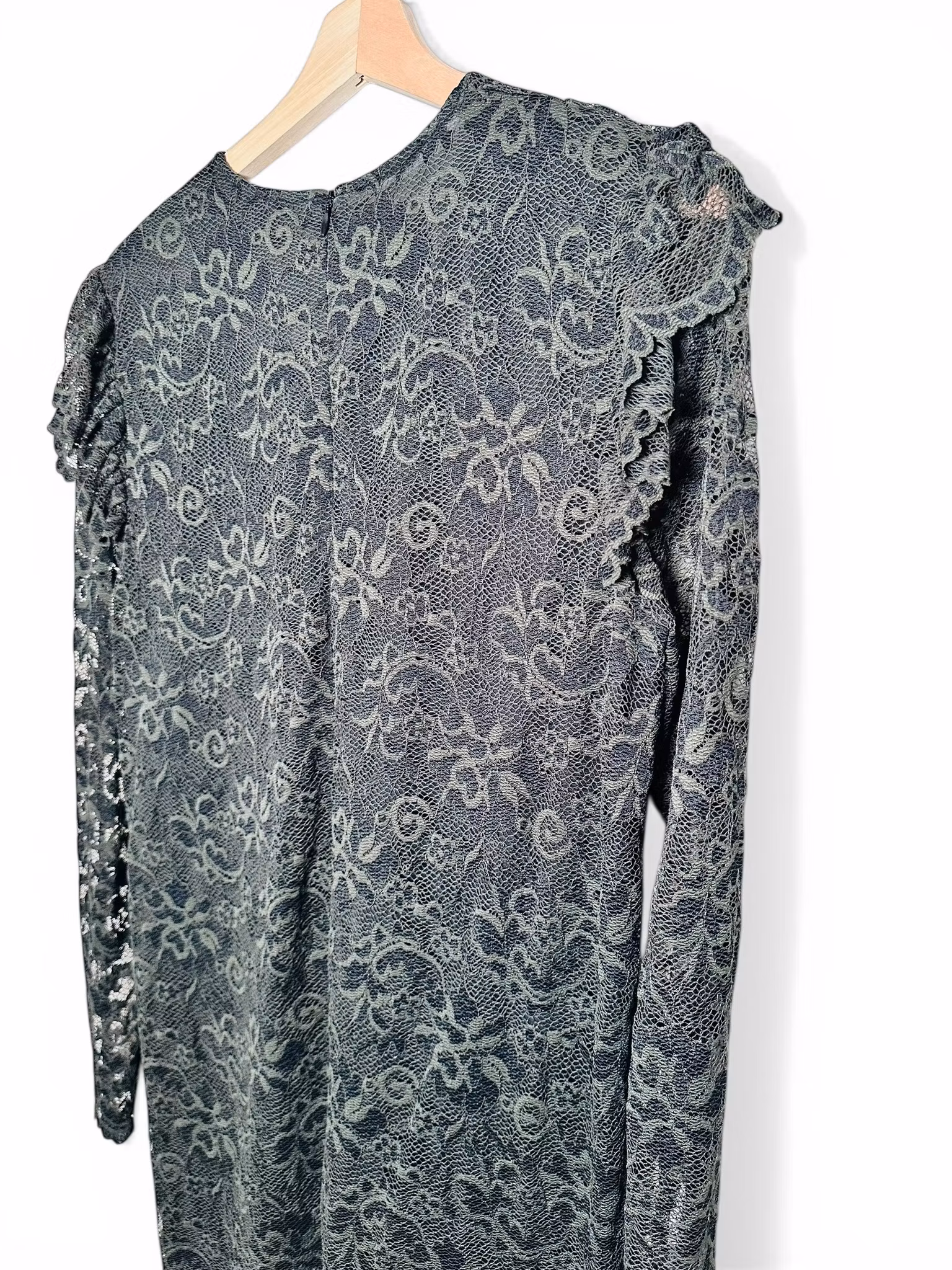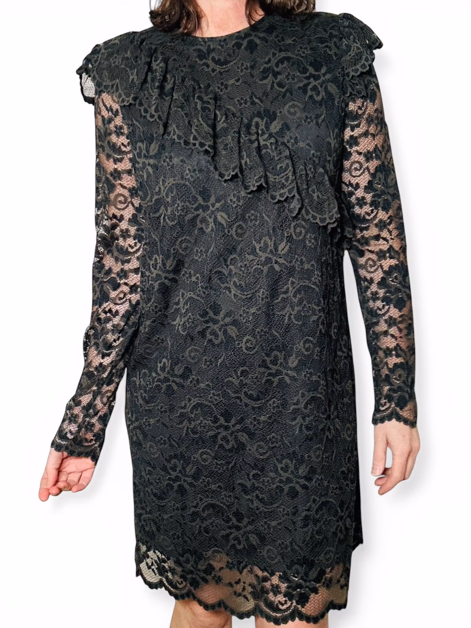 Beskrivning: Gannis Flynn Lace dress i genombruten grön spets med en volang diagonalt över fronten och volanger som markerar axlarna. Lång ärm och fodrad kropp. Stretchig och normal till rymlig i storleken. Sista bilden är en lånad produktbild.