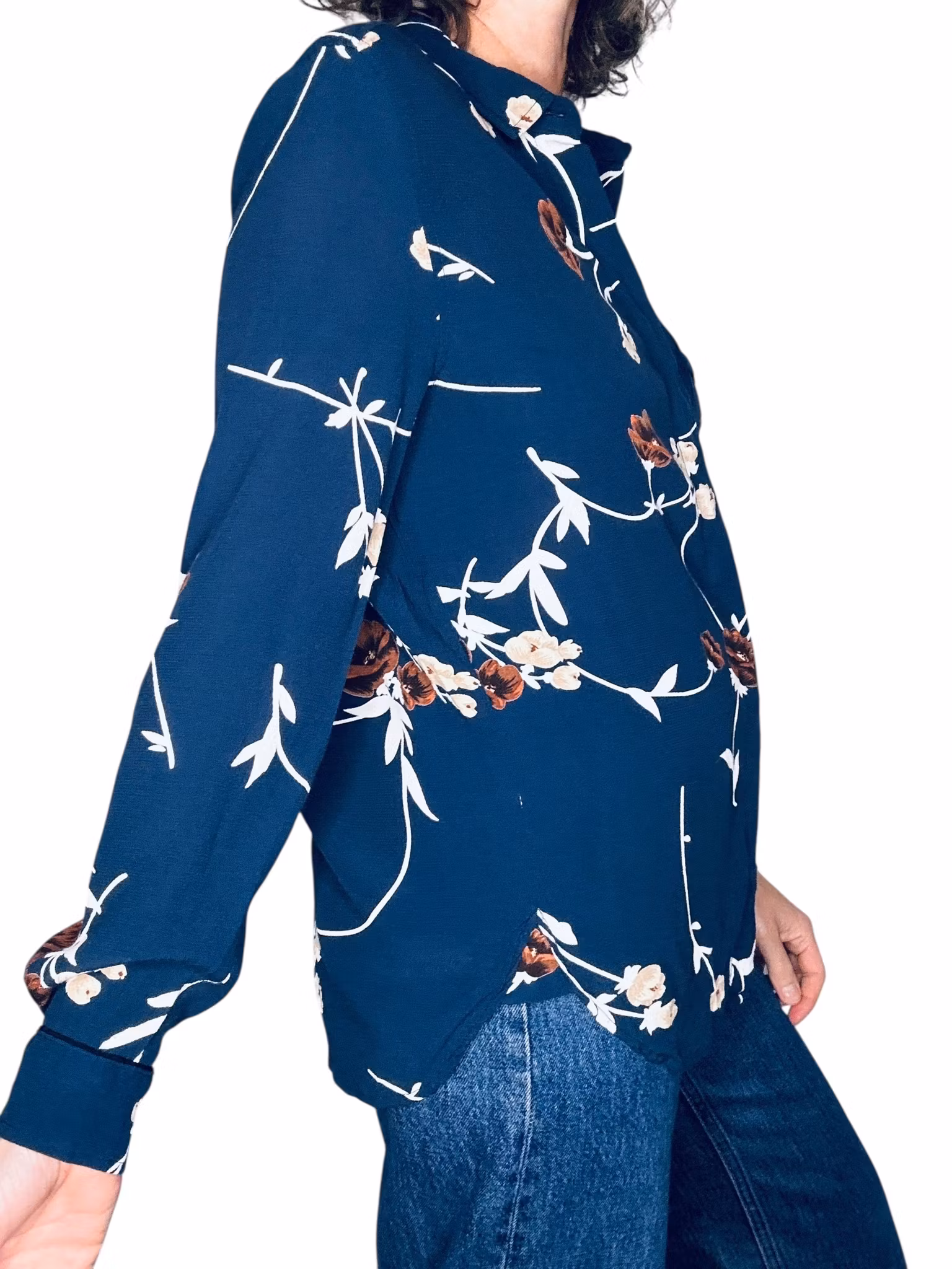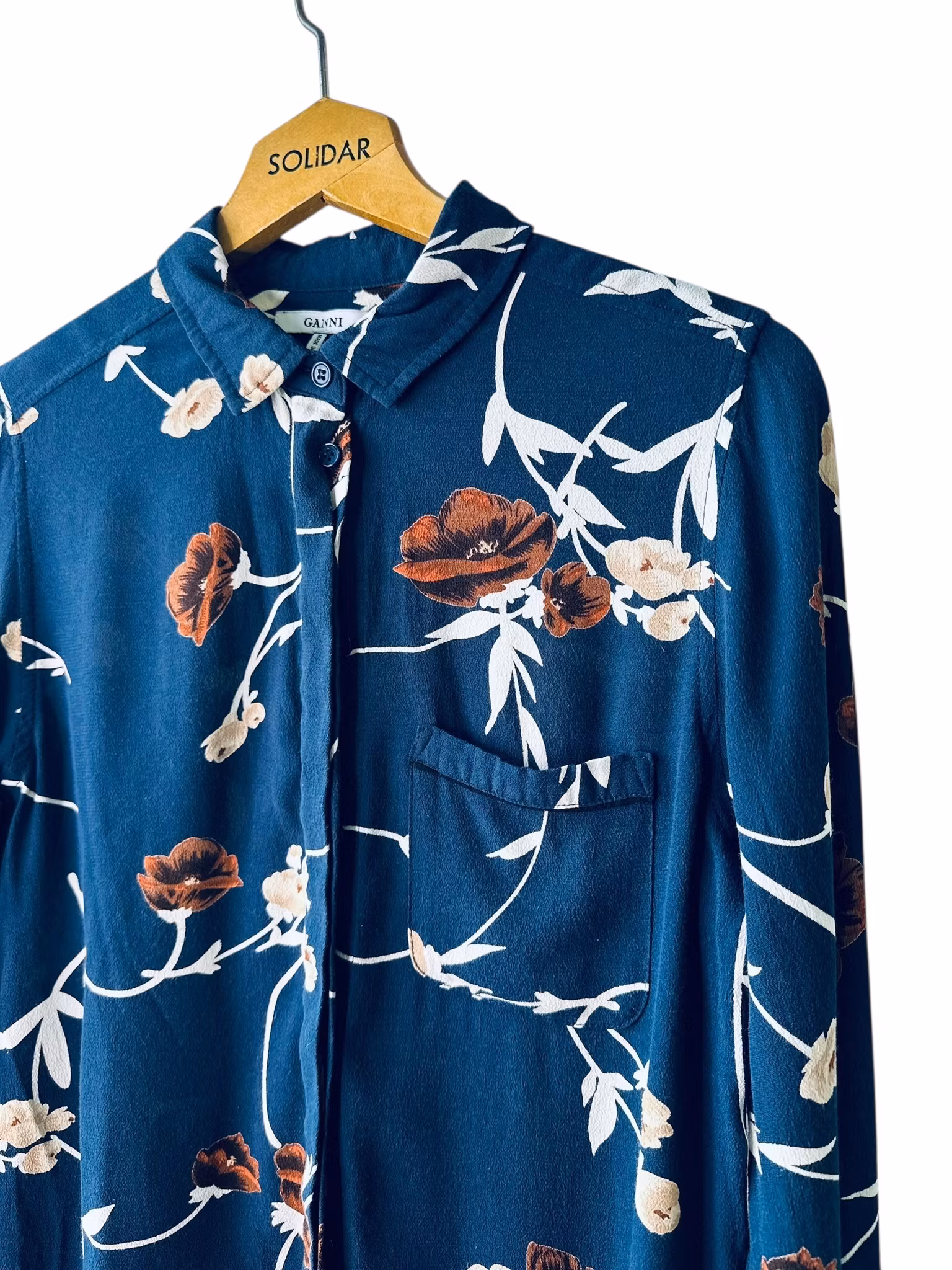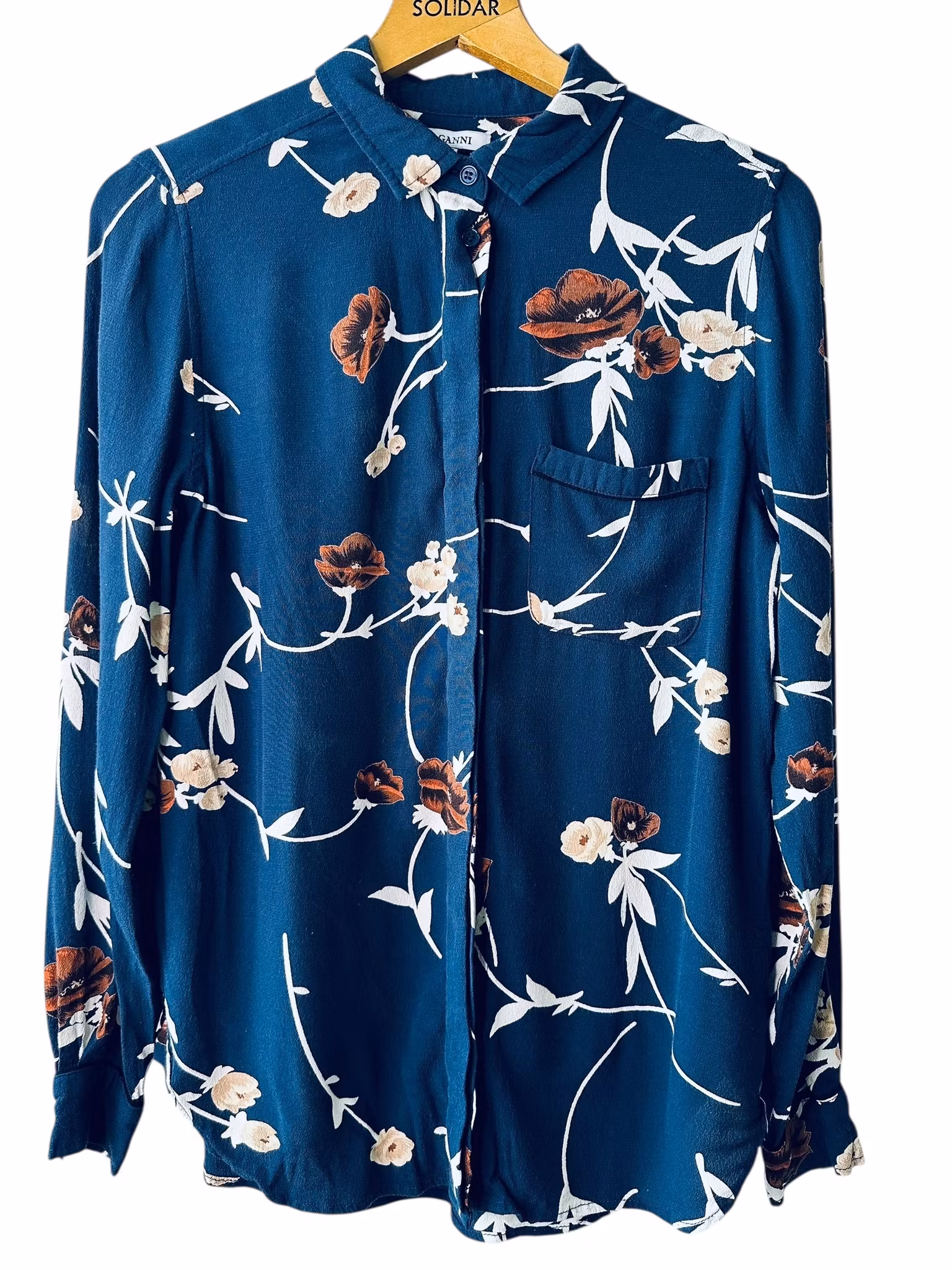 Beskrivning: Gannis klassiska skjortmodell, med dold knäppning, rundad nederkant med kliar i slitsarna, veck under oket i ryggen, en bröstficka och svarta stickningar vid ficka och manschetter. I viskos. Här mörkblått med blommor och blad i brunt, beige och vitt. Uppfattas som rymlig i storlek.