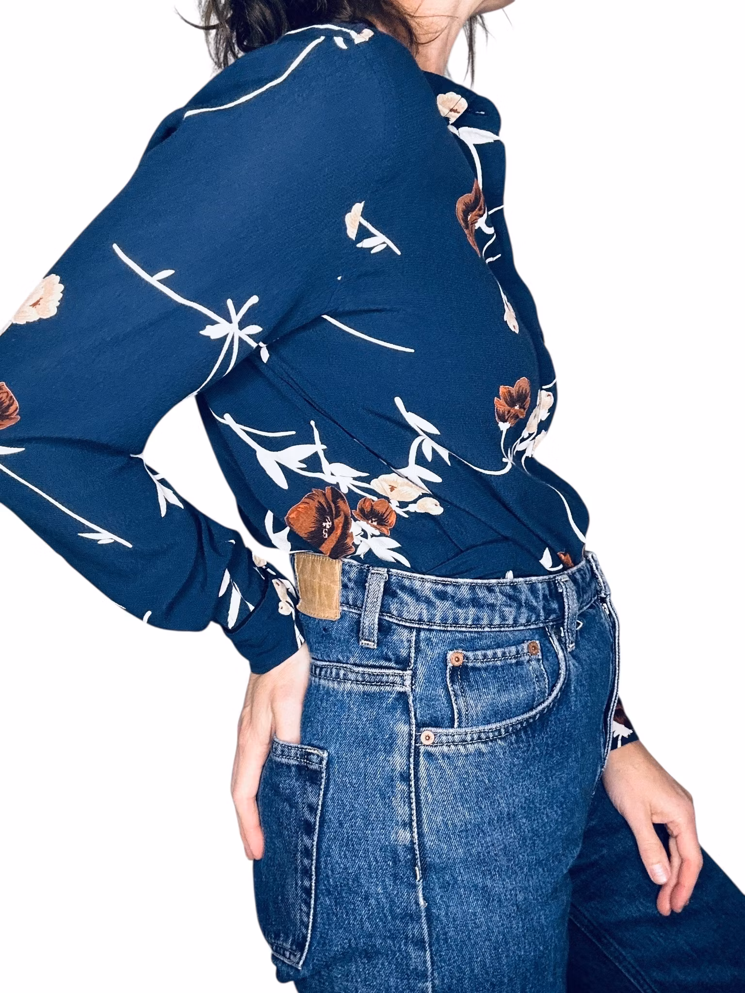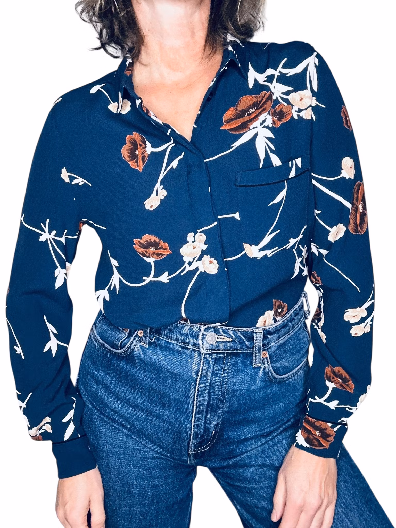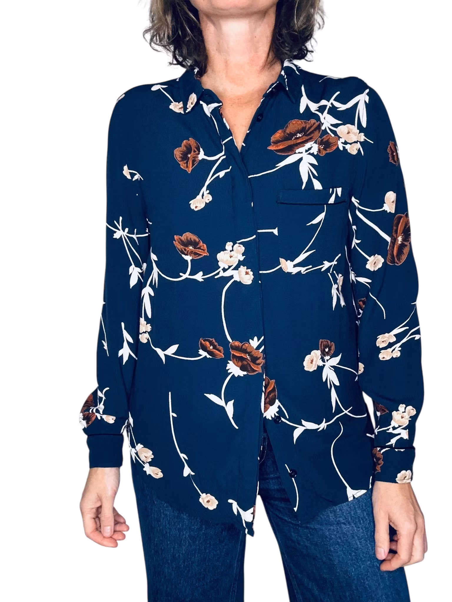 Beskrivning: Gannis klassiska skjortmodell, med dold knäppning, rundad nederkant med kliar i slitsarna, veck under oket i ryggen, en bröstficka och svarta stickningar vid ficka och manschetter. I viskos. Här mörkblått med blommor och blad i brunt, beige och vitt. Uppfattas som rymlig i storlek.