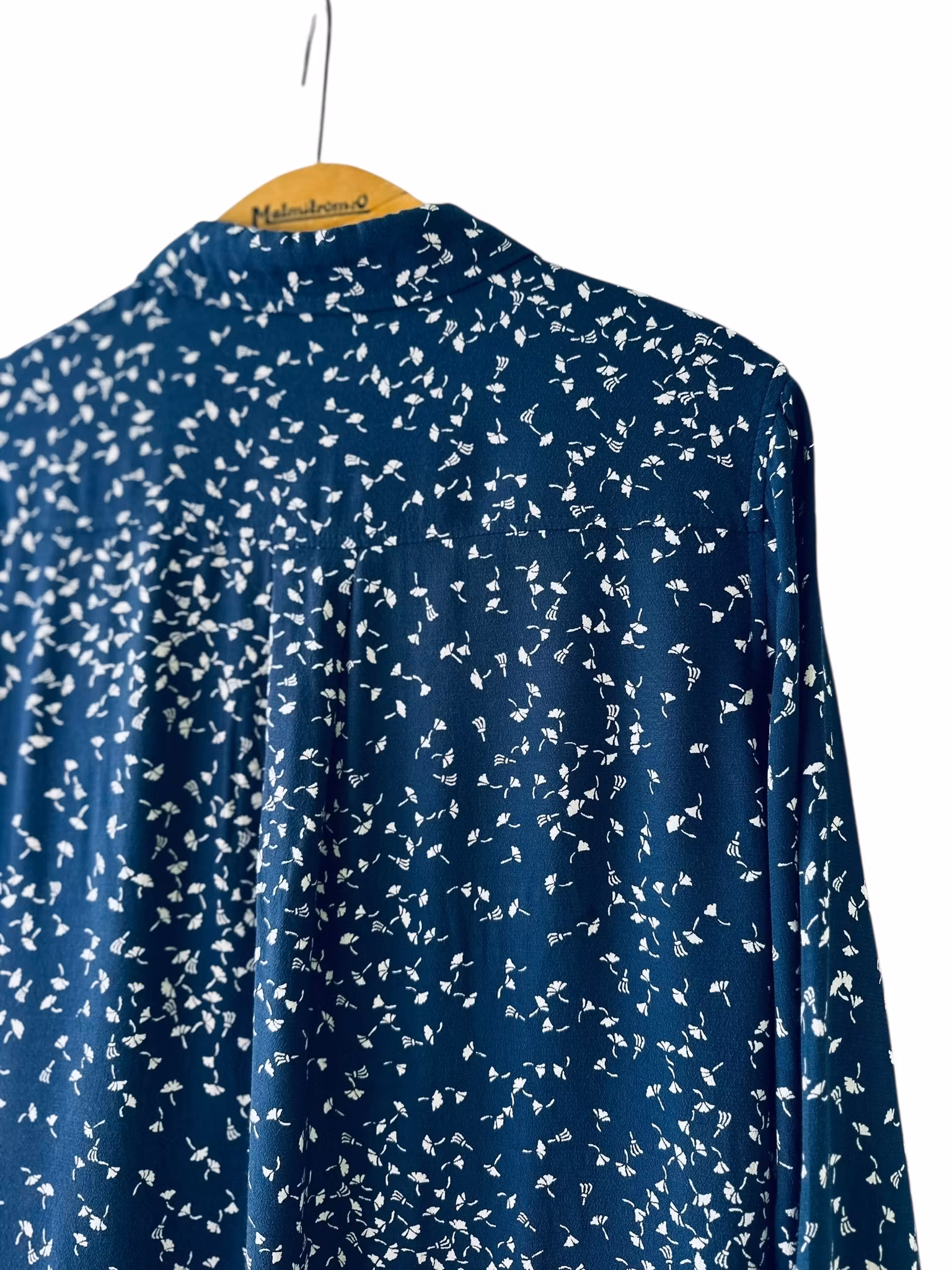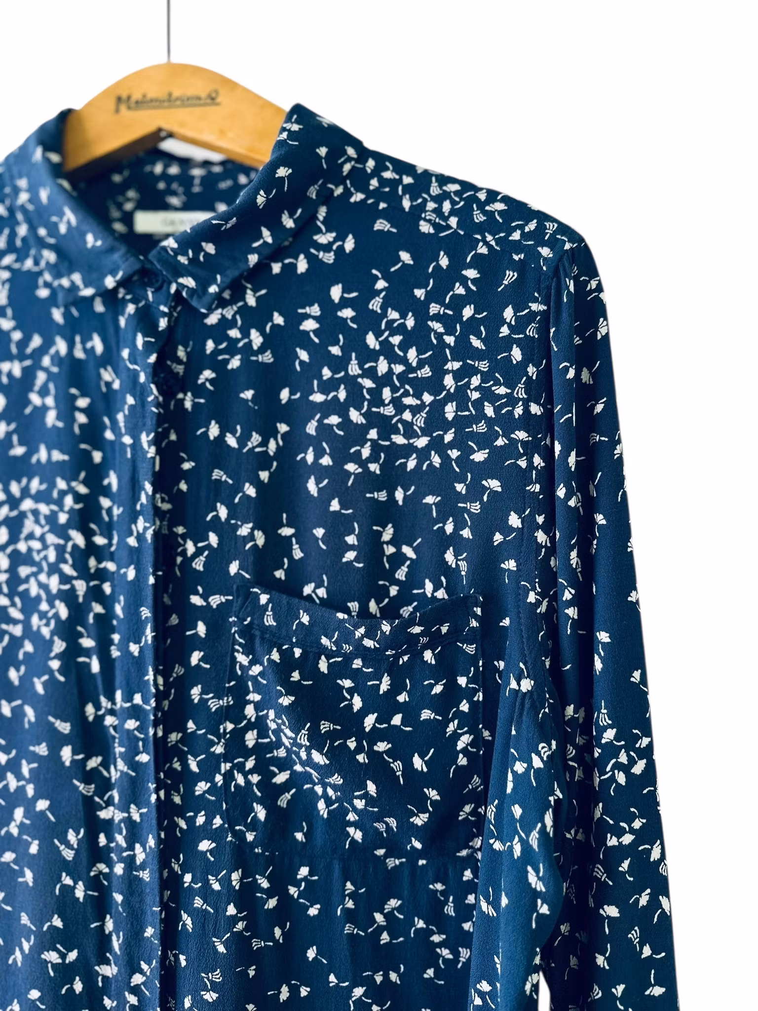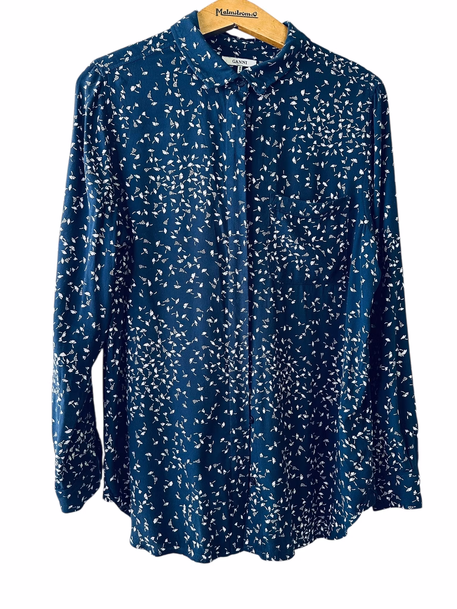 Beskrivning: Gannis klassiska skjortmodell, med dold knäppning, rundad nederkant med kliar i slitsarna, veck under oket i ryggen, en bröstficka och svarta stickningar vid ficka och manschetter. I viskos. Här mörkblått med vita maskrosfrön. Uppfattas som rymlig i storlek.