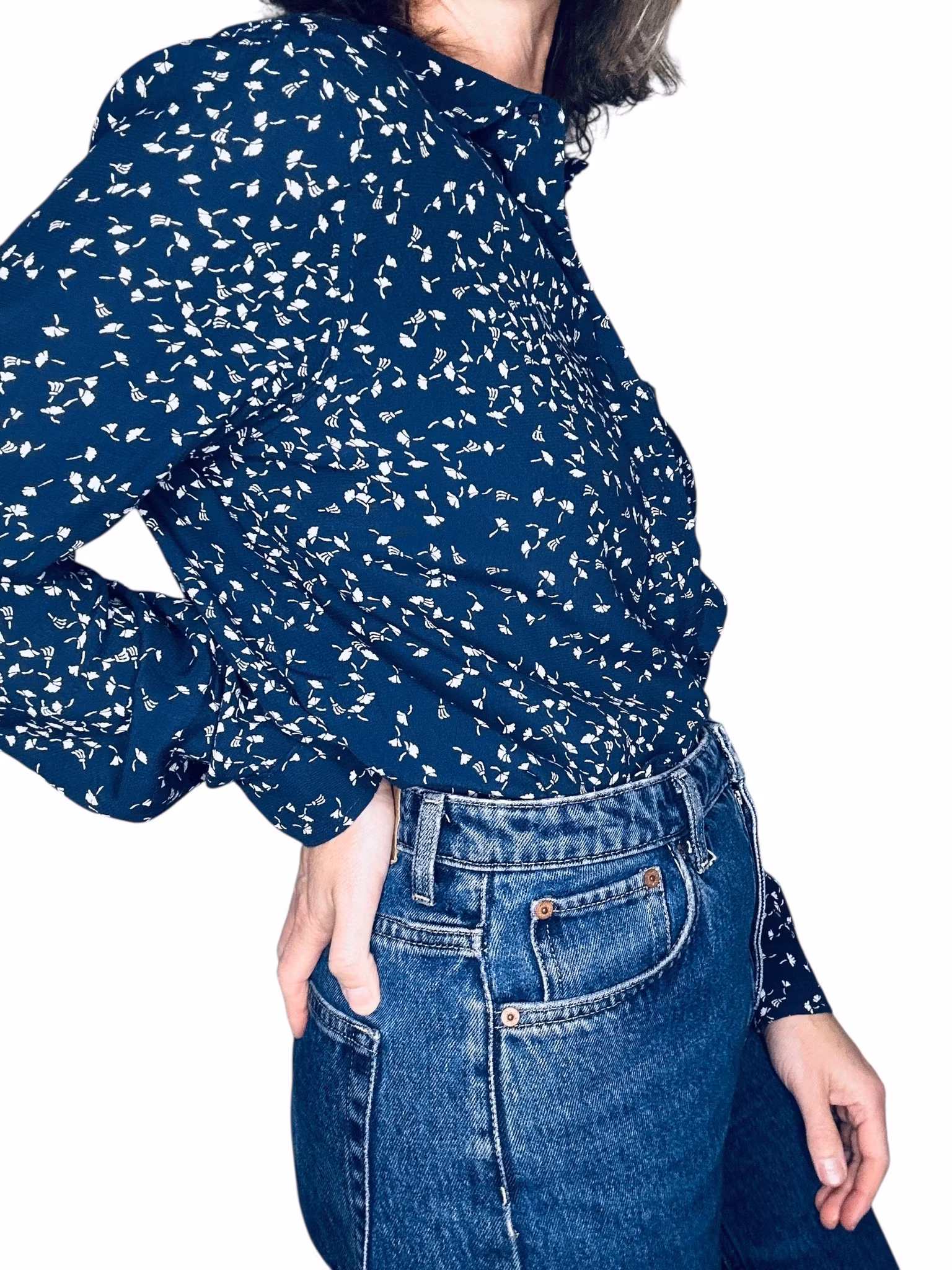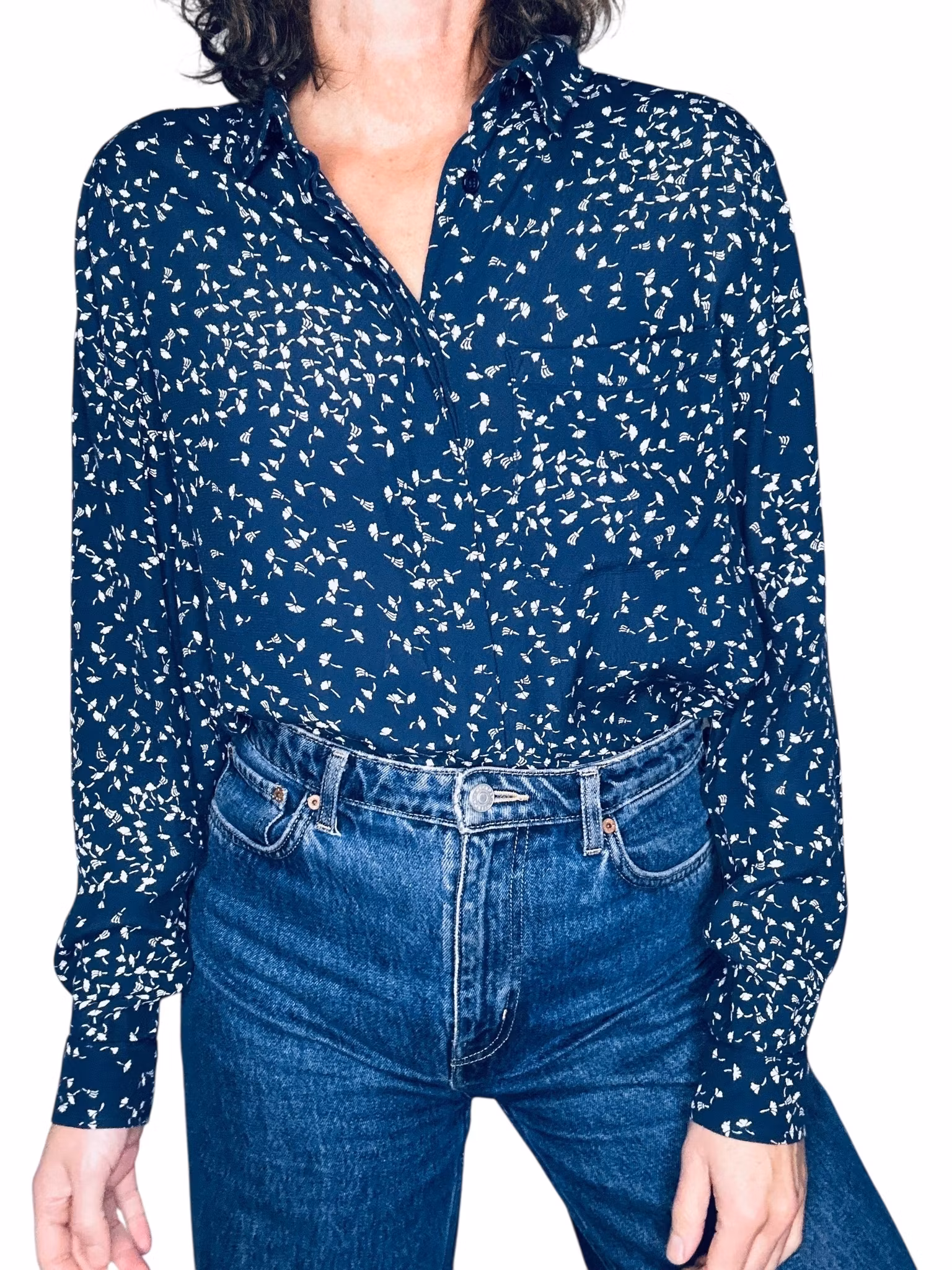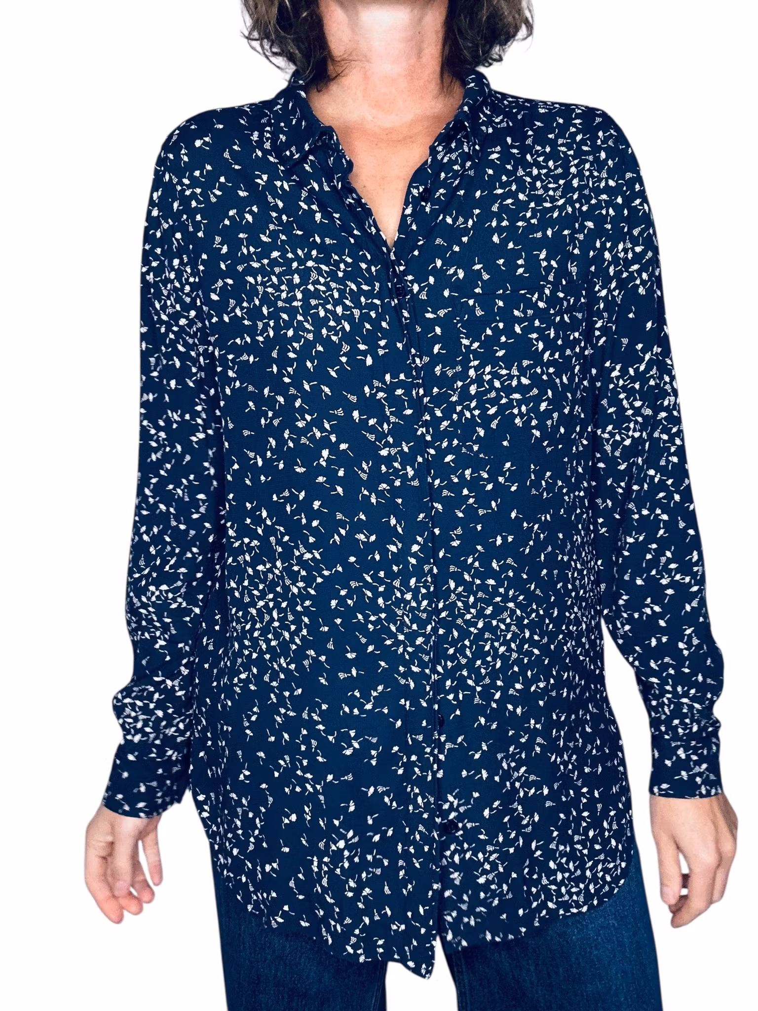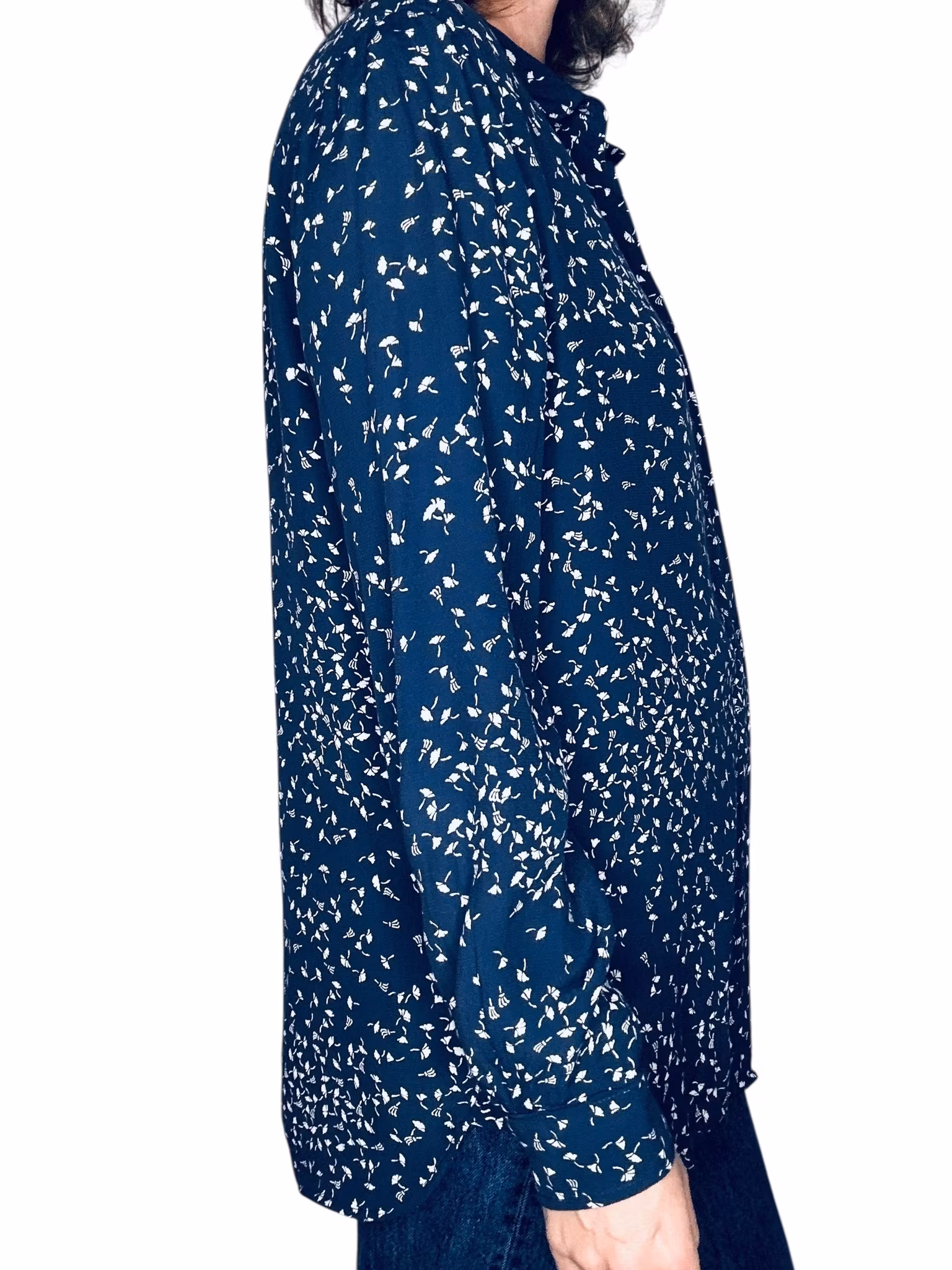 Beskrivning: Gannis klassiska skjortmodell, med dold knäppning, rundad nederkant med kliar i slitsarna, veck under oket i ryggen, en bröstficka och svarta stickningar vid ficka och manschetter. I viskos. Här mörkblått med vita maskrosfrön. Uppfattas som rymlig i storlek.