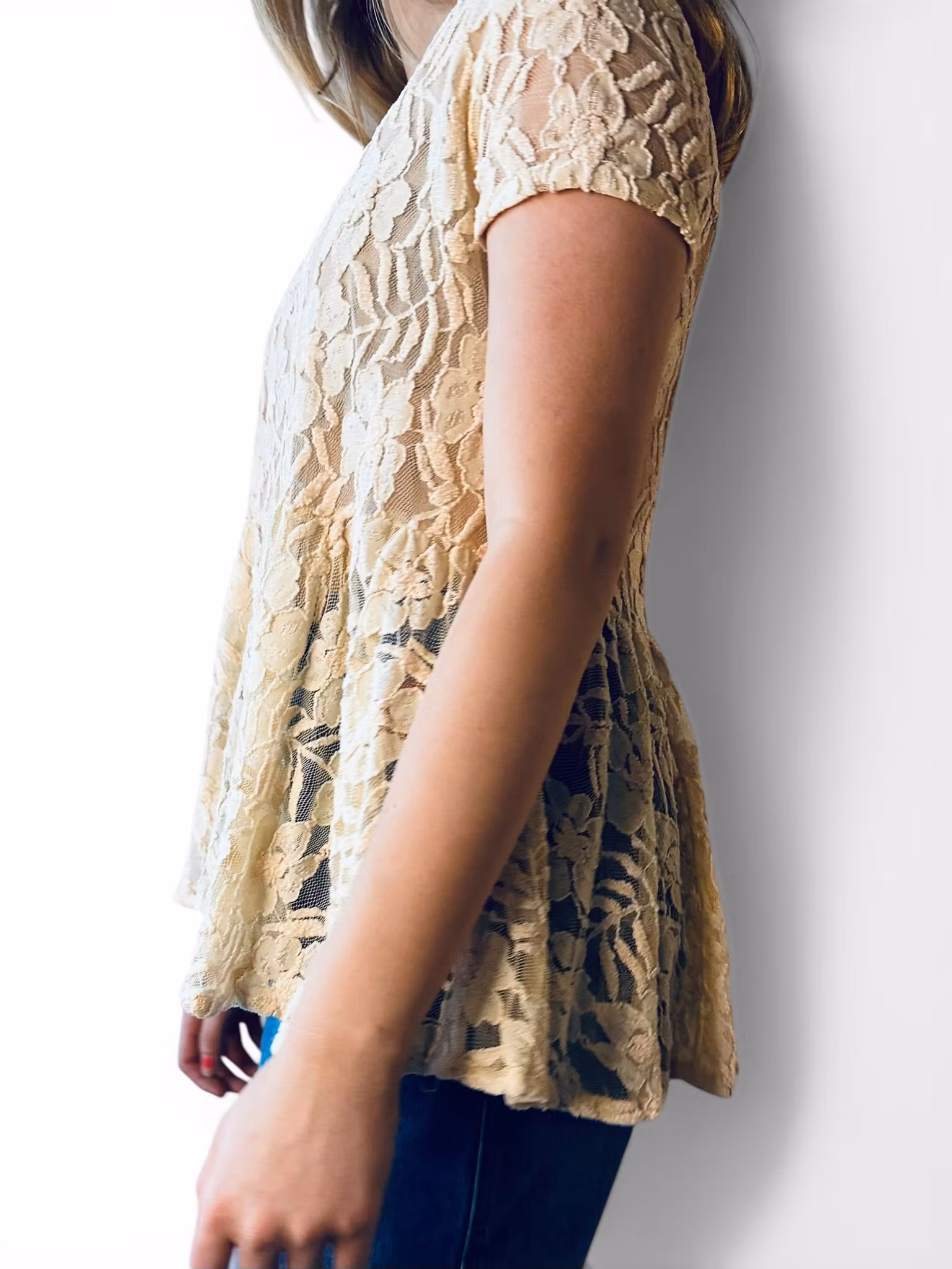 Beskrivning: En söt spetstopp från Ganni. Elastiskt material i ljust beige med markerad midja och volangdel nedanför.