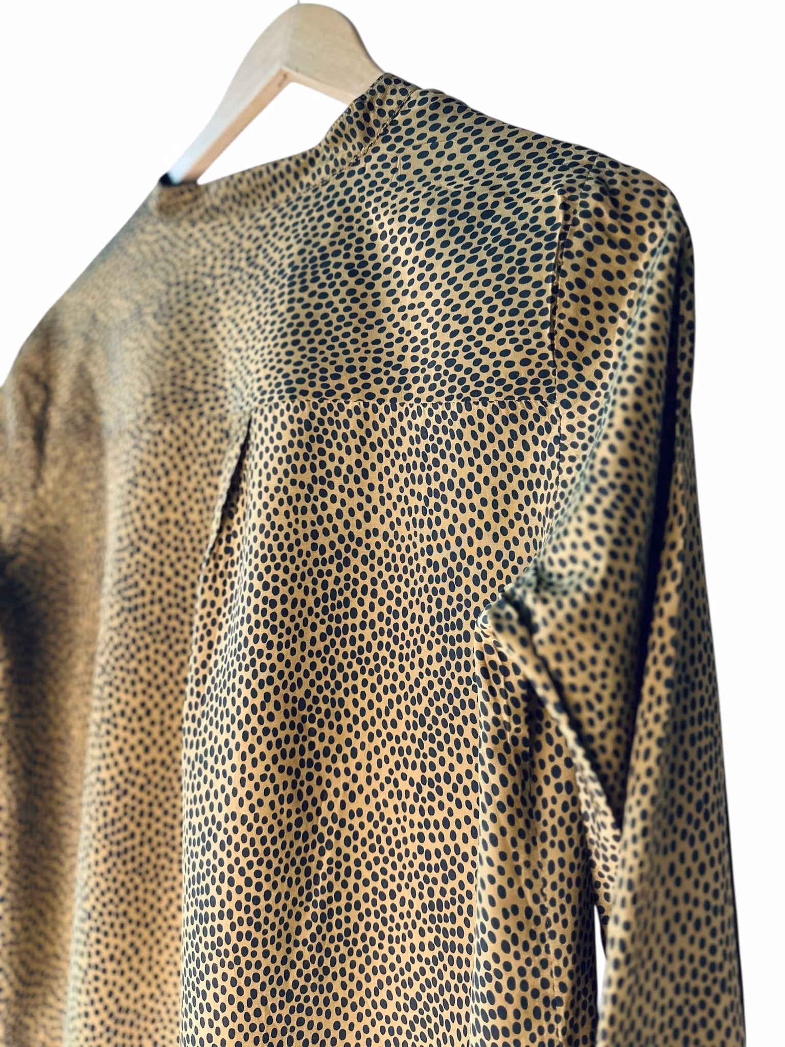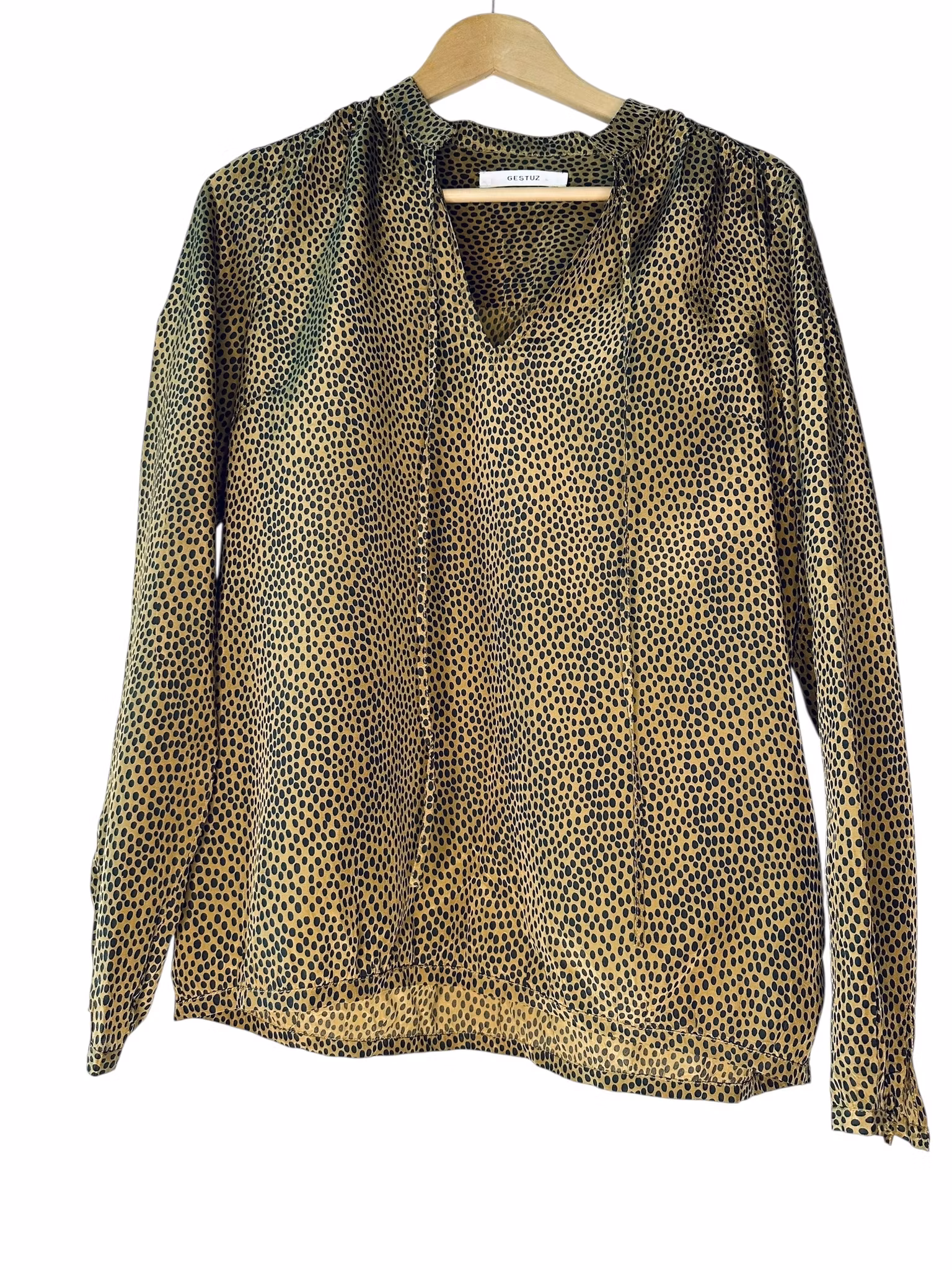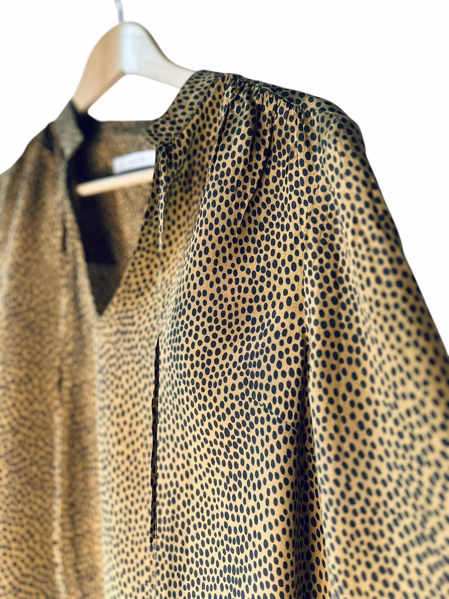 Beskrivning: Blus i guldigt brun med svarta små fläckar, nästan som smått leopardfärgad. Vävd, lite blank viskos. Lång och voluminös ärm, sprund framtill med knyt och en liten kant längst ner, som en stum mudd som gör att en kan variera uttrycket på blusen - ha den helt nere - eller hissa upp och få ett veck - som en tröja. Från danska Gestuz.