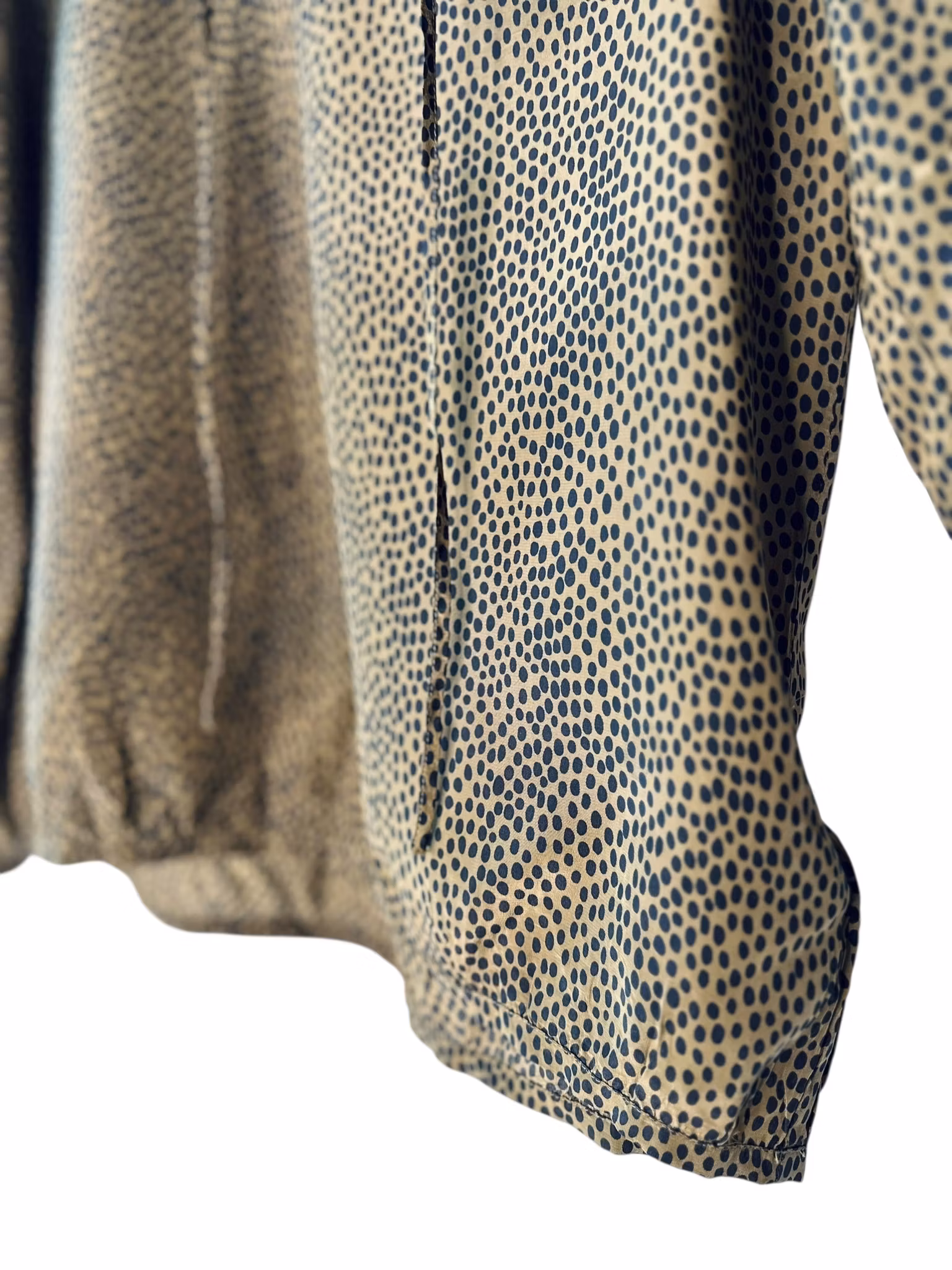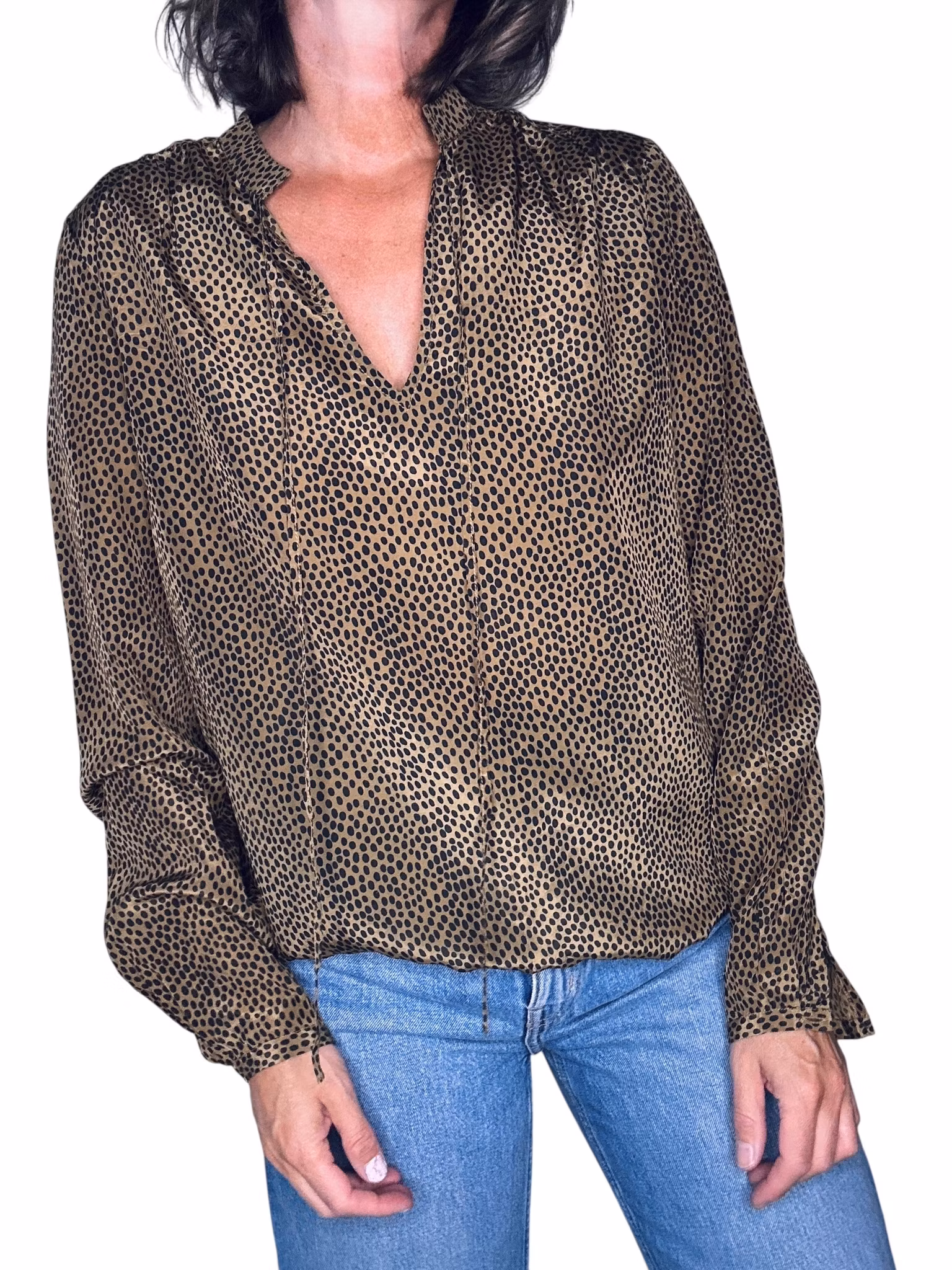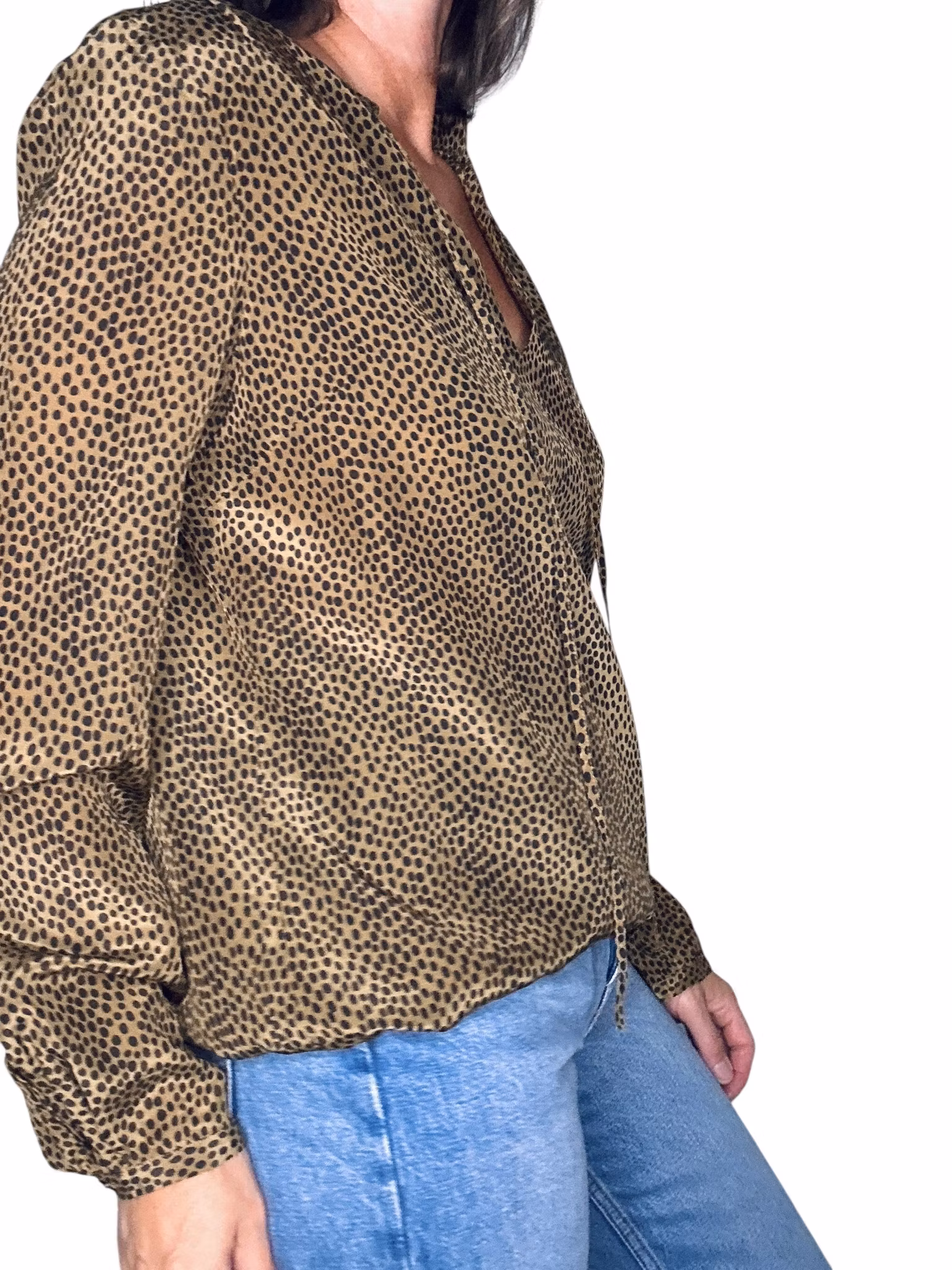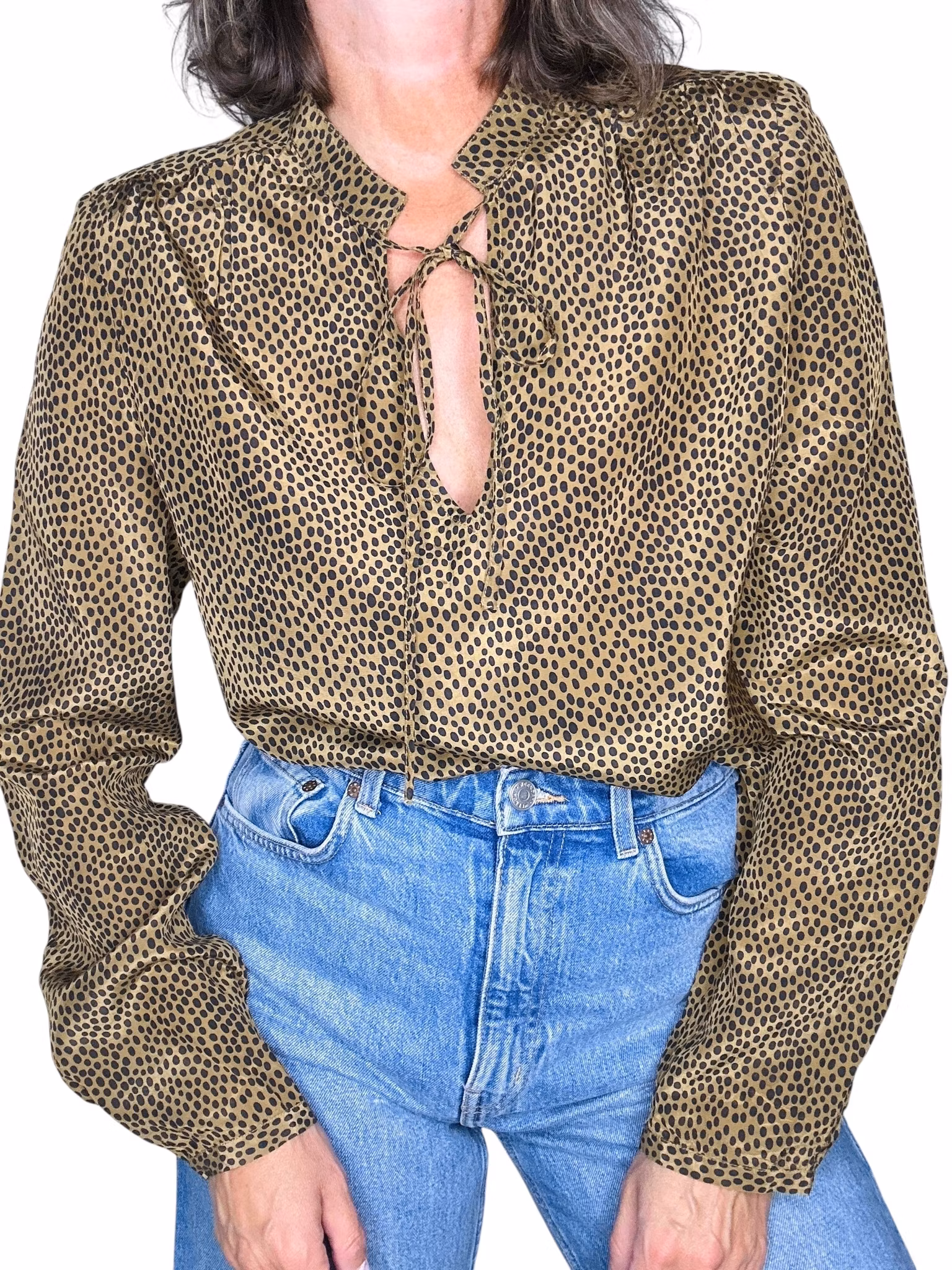 Beskrivning: Blus i guldigt brun med svarta små fläckar, nästan som smått leopardfärgad. Vävd, lite blank viskos. Lång och voluminös ärm, sprund framtill med knyt och en liten kant längst ner, som en stum mudd som gör att en kan variera uttrycket på blusen - ha den helt nere - eller hissa upp och få ett veck - som en tröja. Från danska Gestuz.
