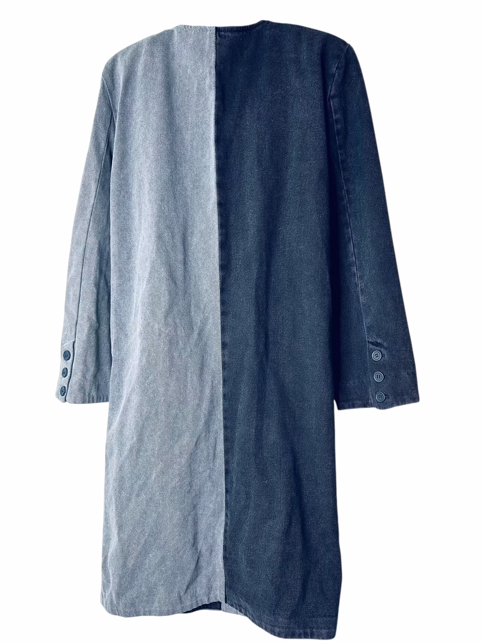 Beskrivning: Rolig klänning från danska Gestuz i två nyanser av grått! Ena sidan mörkgrå, andra ljusgrå. Använd den som klänning - eller knäpp upp och ha som kaftan/lång kavaj. Nypris ca 2000kr.