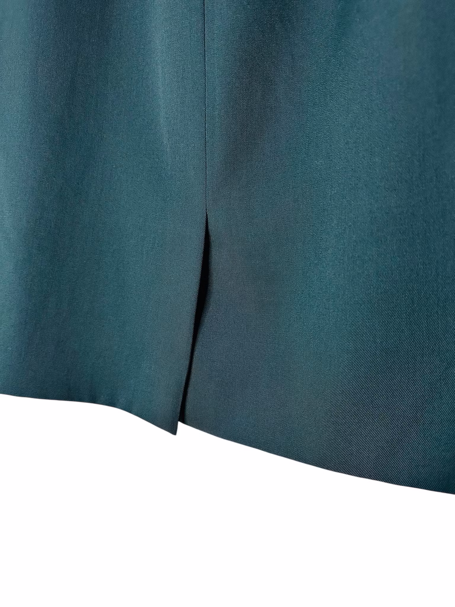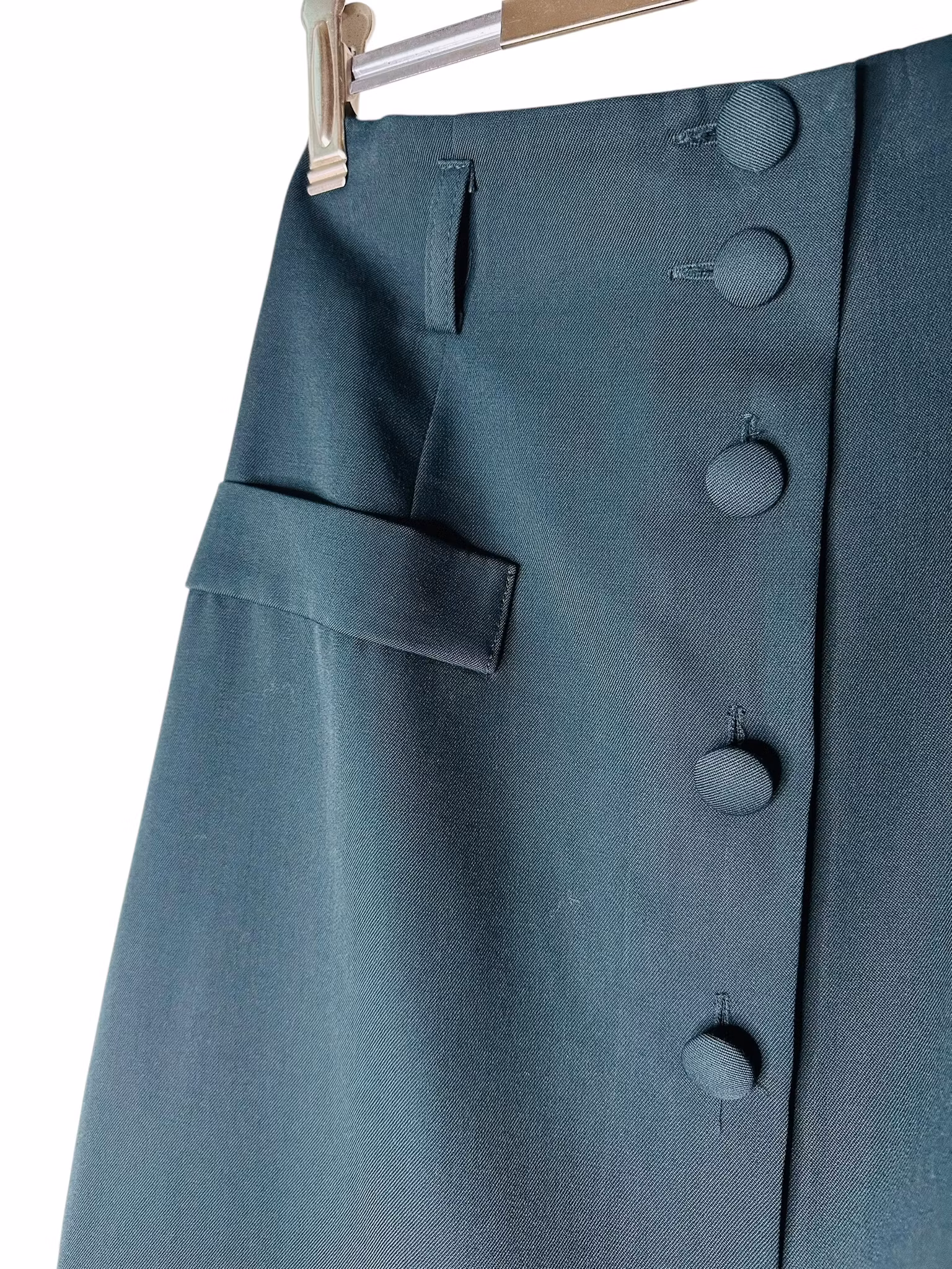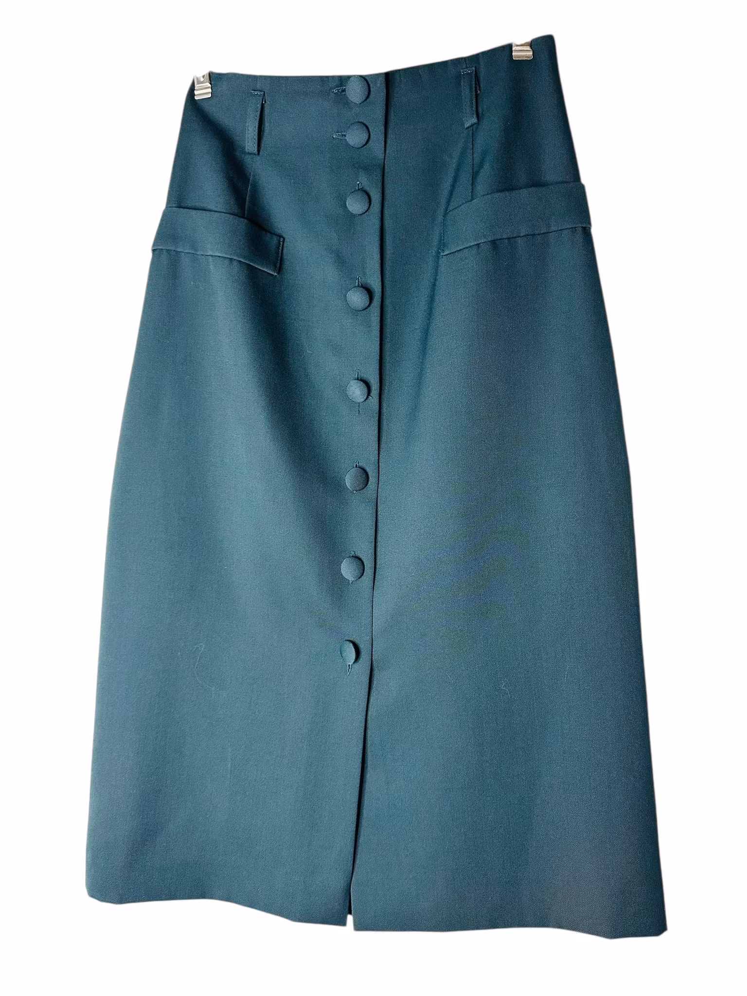 Beskrivning: Grön pennkjol med hög midja och klädda knappar hela vägen ner framtill. Hällor och fejkfickor. Upplevs som liten i storlek.