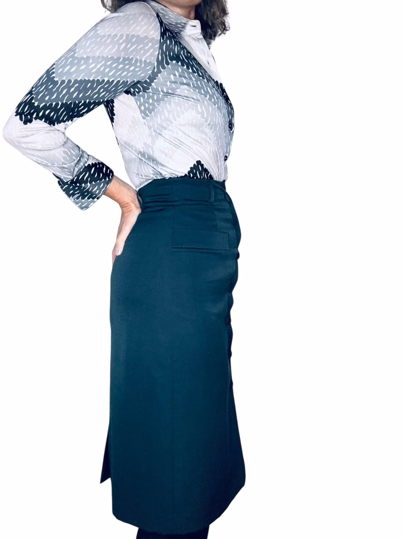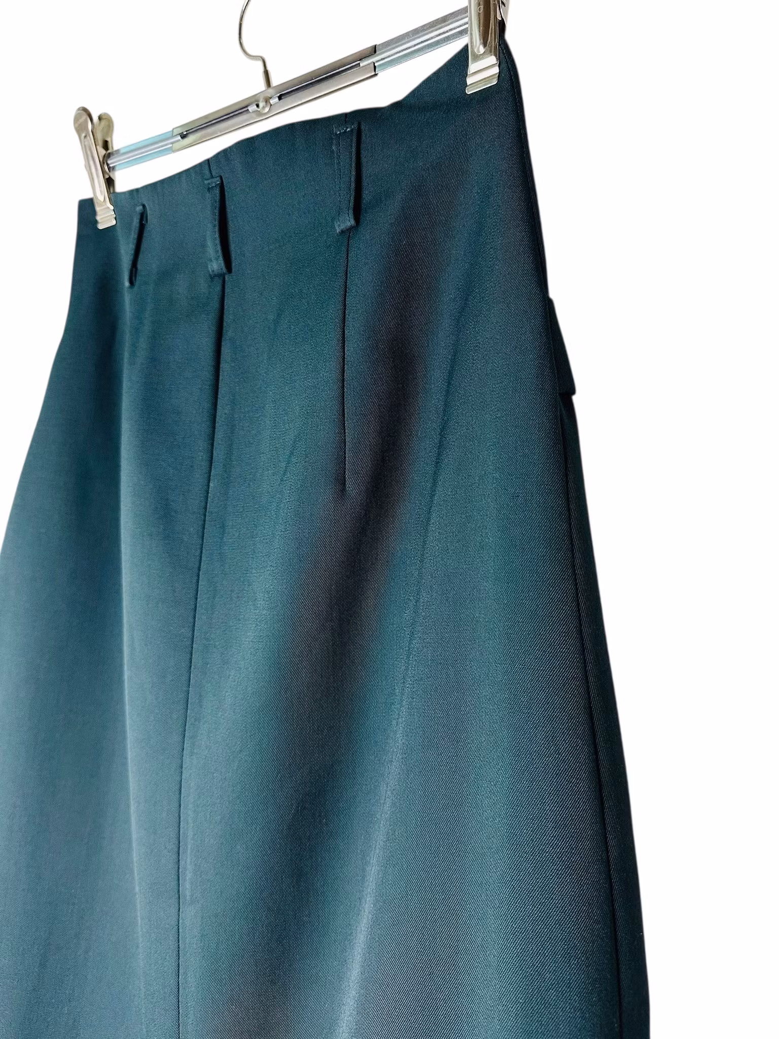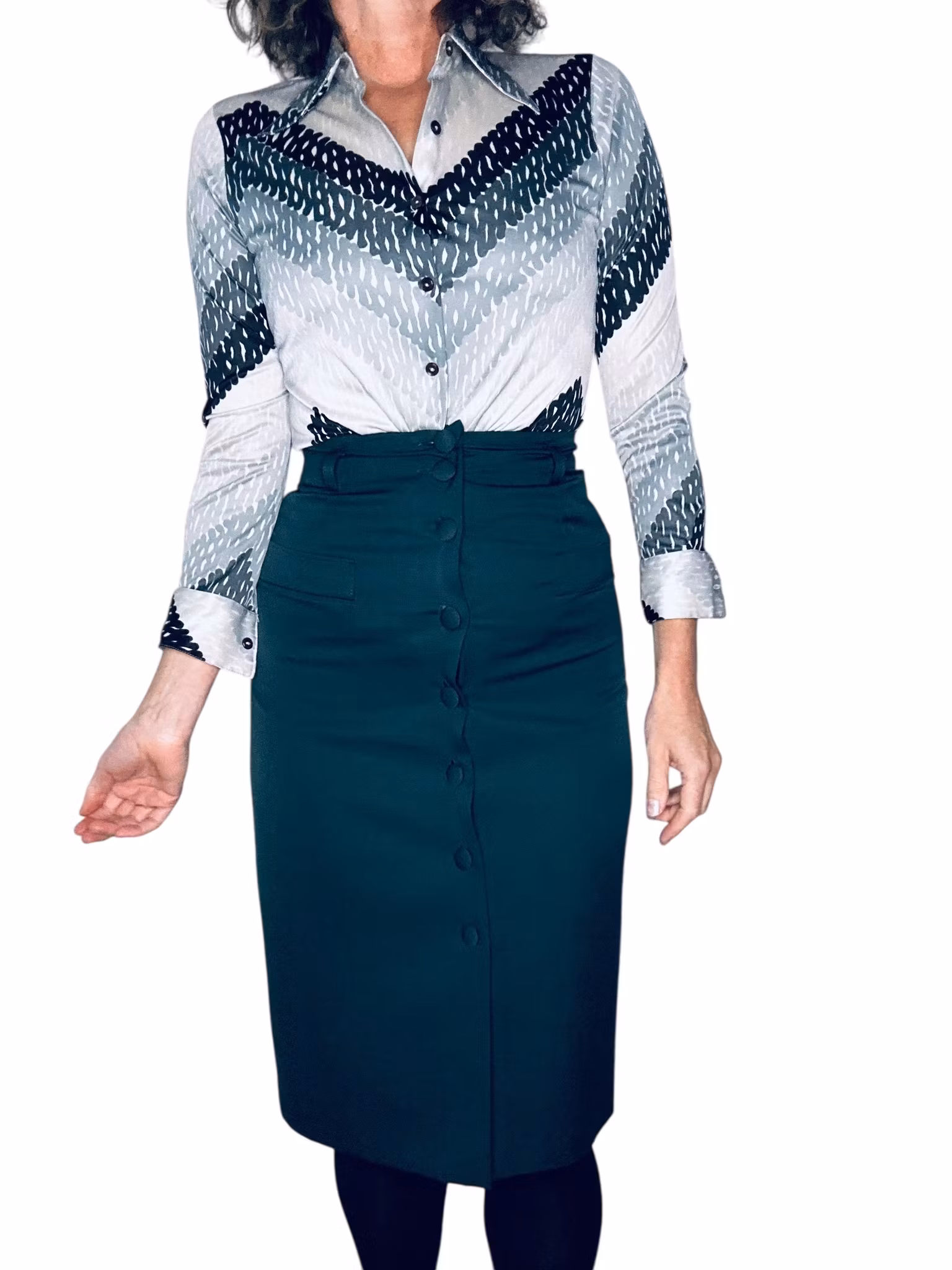 Beskrivning: Grön pennkjol med hög midja och klädda knappar hela vägen ner framtill. Hällor och fejkfickor. Upplevs som liten i storlek.