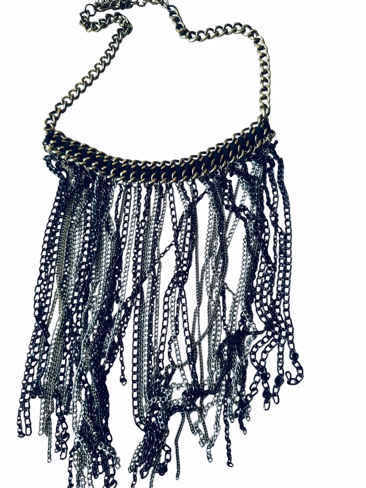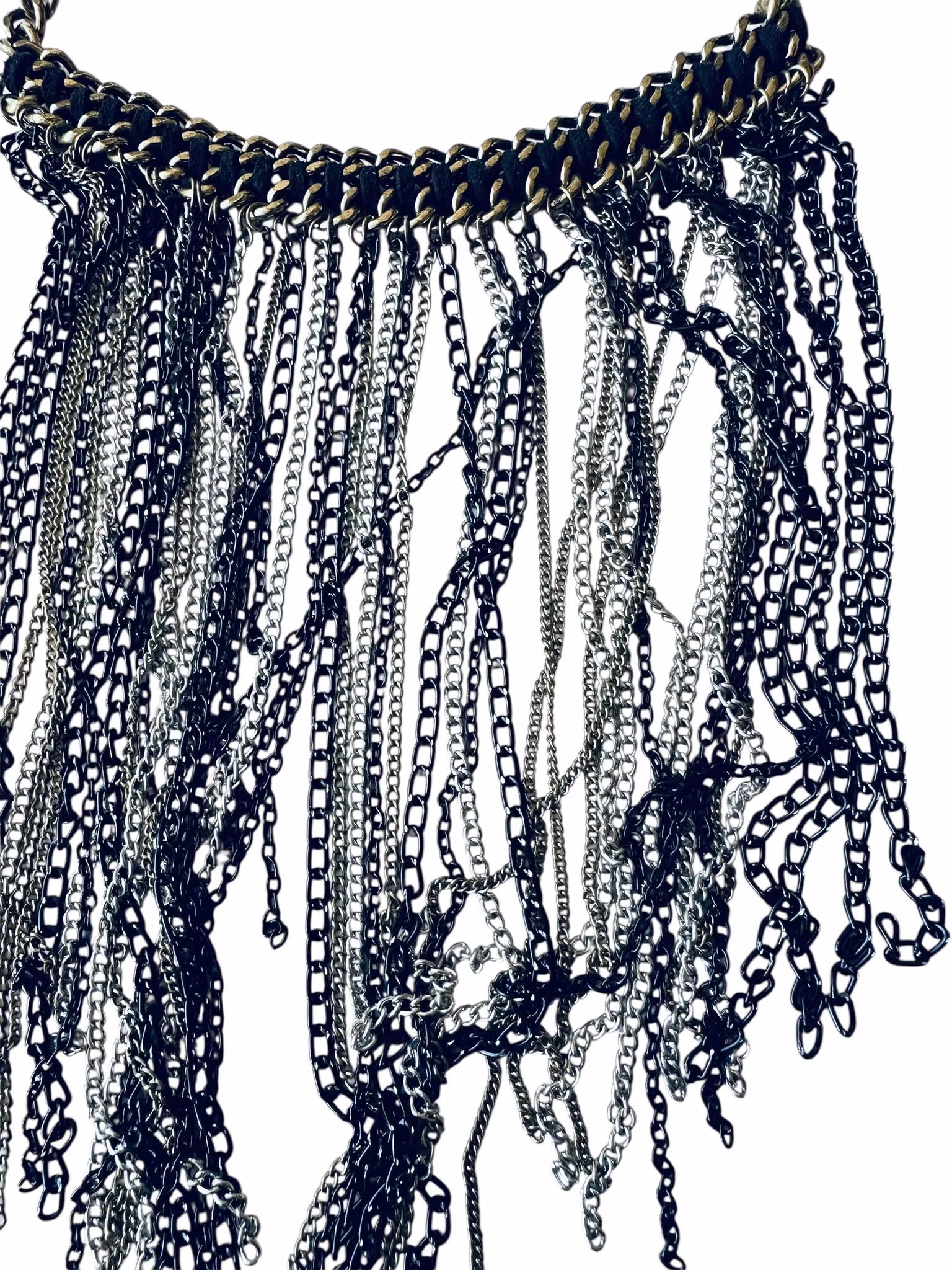 Beskrivning: Statementhalsband i silverfärgad metall. Rejäl kedja med lädersnöre som flätats in framtill och med tunna kedjor i silver och svart hängande ned.