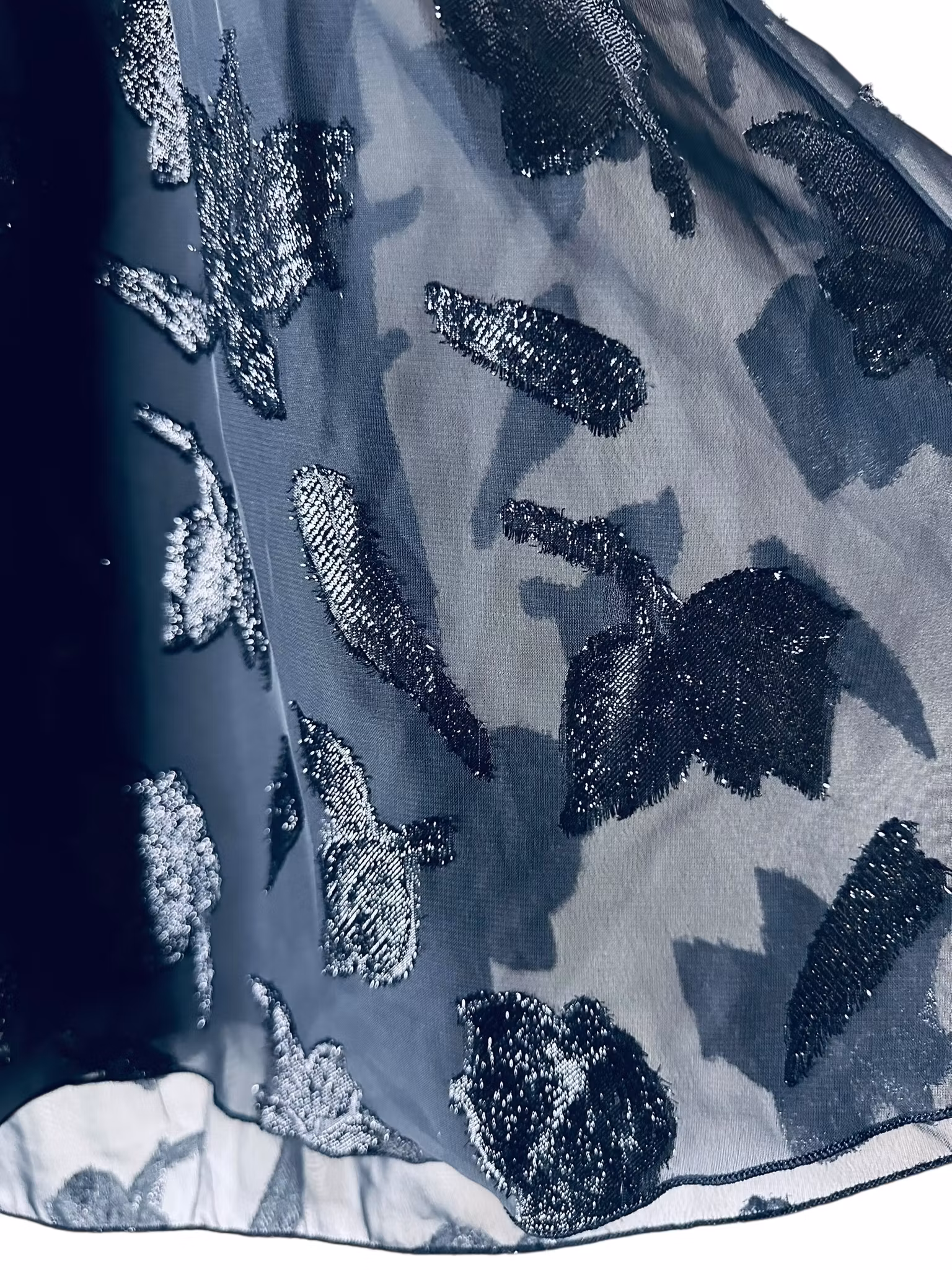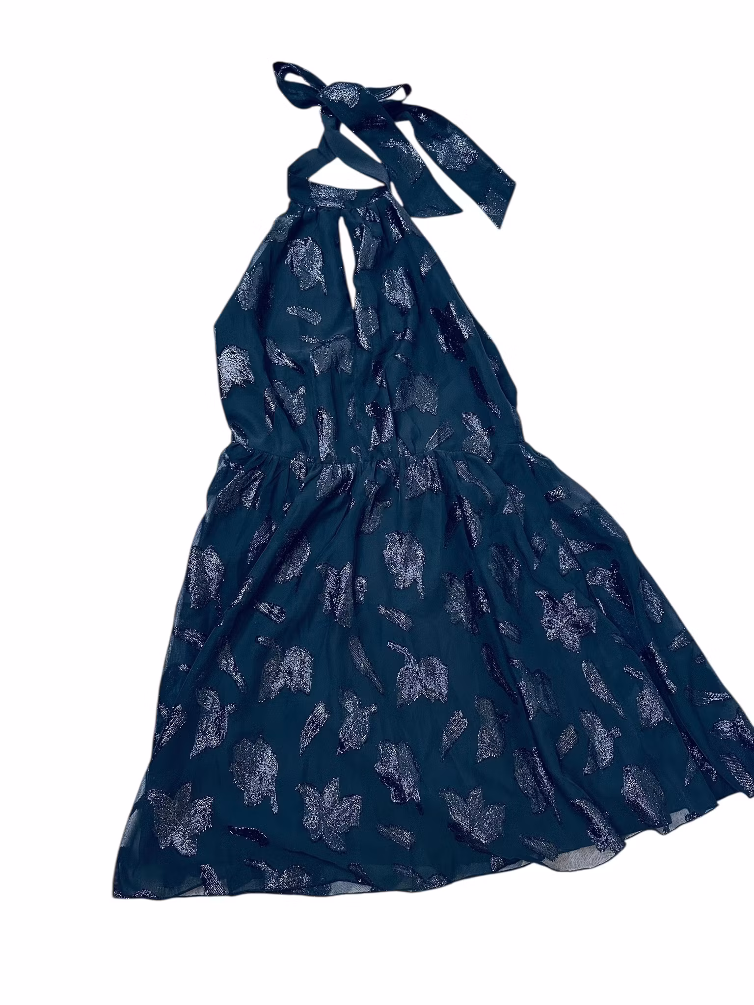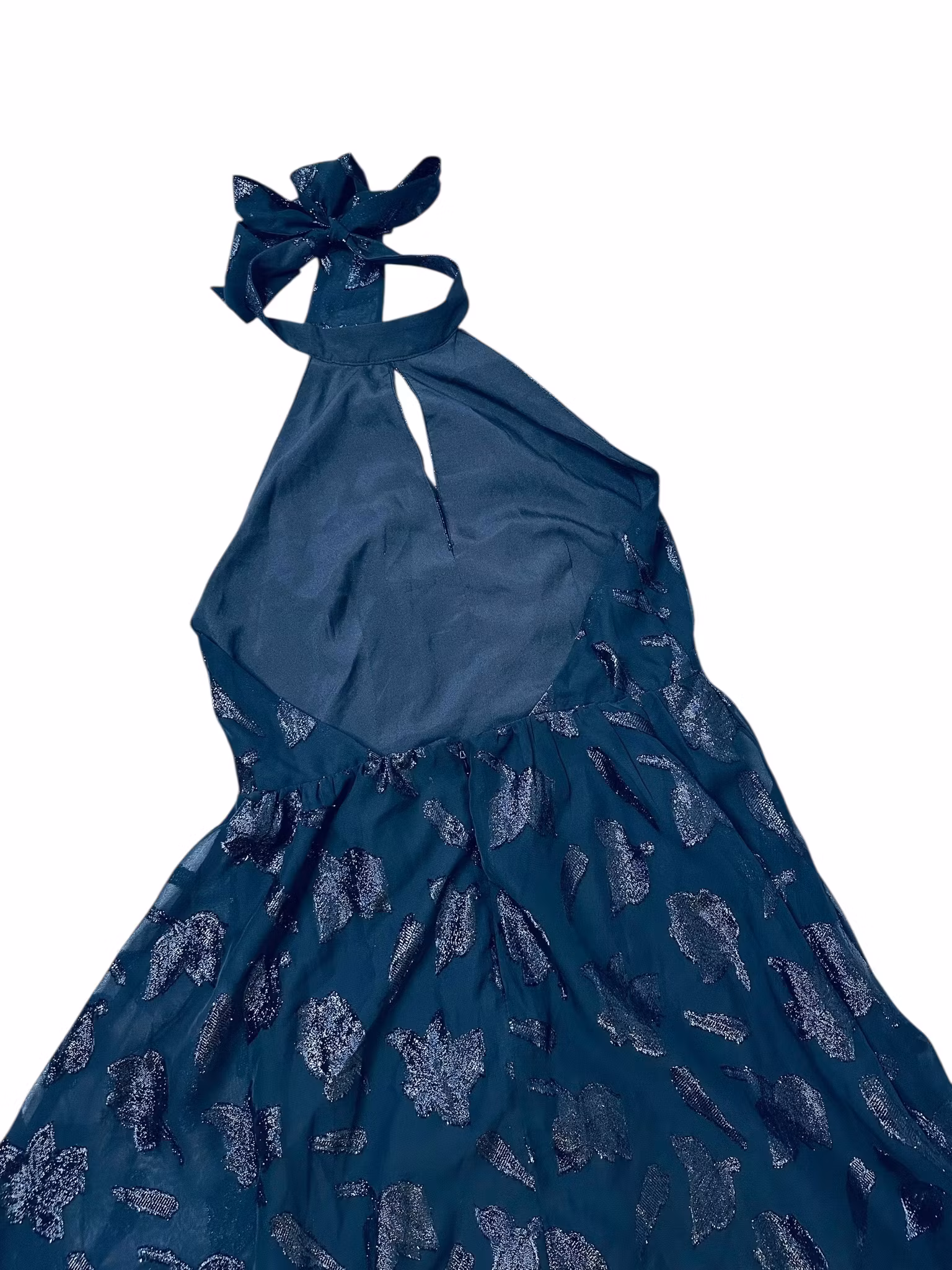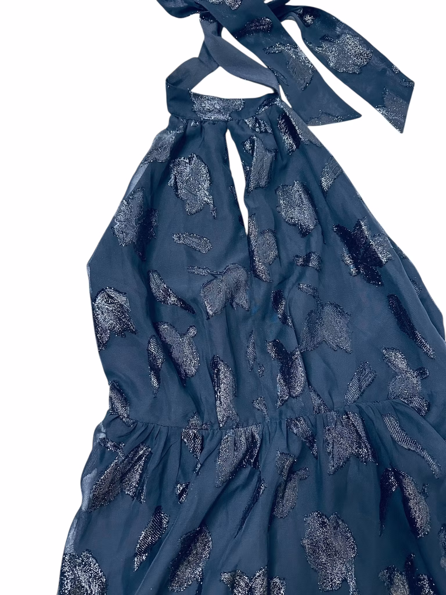 Beskrivning: Ljuvlig liten partyblåsa i fin modell. Halterneck som knyts i nacken men också säkras upp med hyskor. Nyckelhålsöppning på framsidan, Markerad midja och vid kjoldel. Tyget är dubbelt där det övre är transparent med glansiga blommor. Djup ringning baktill. Stängs med dragkedja i ryggen. Från HM.