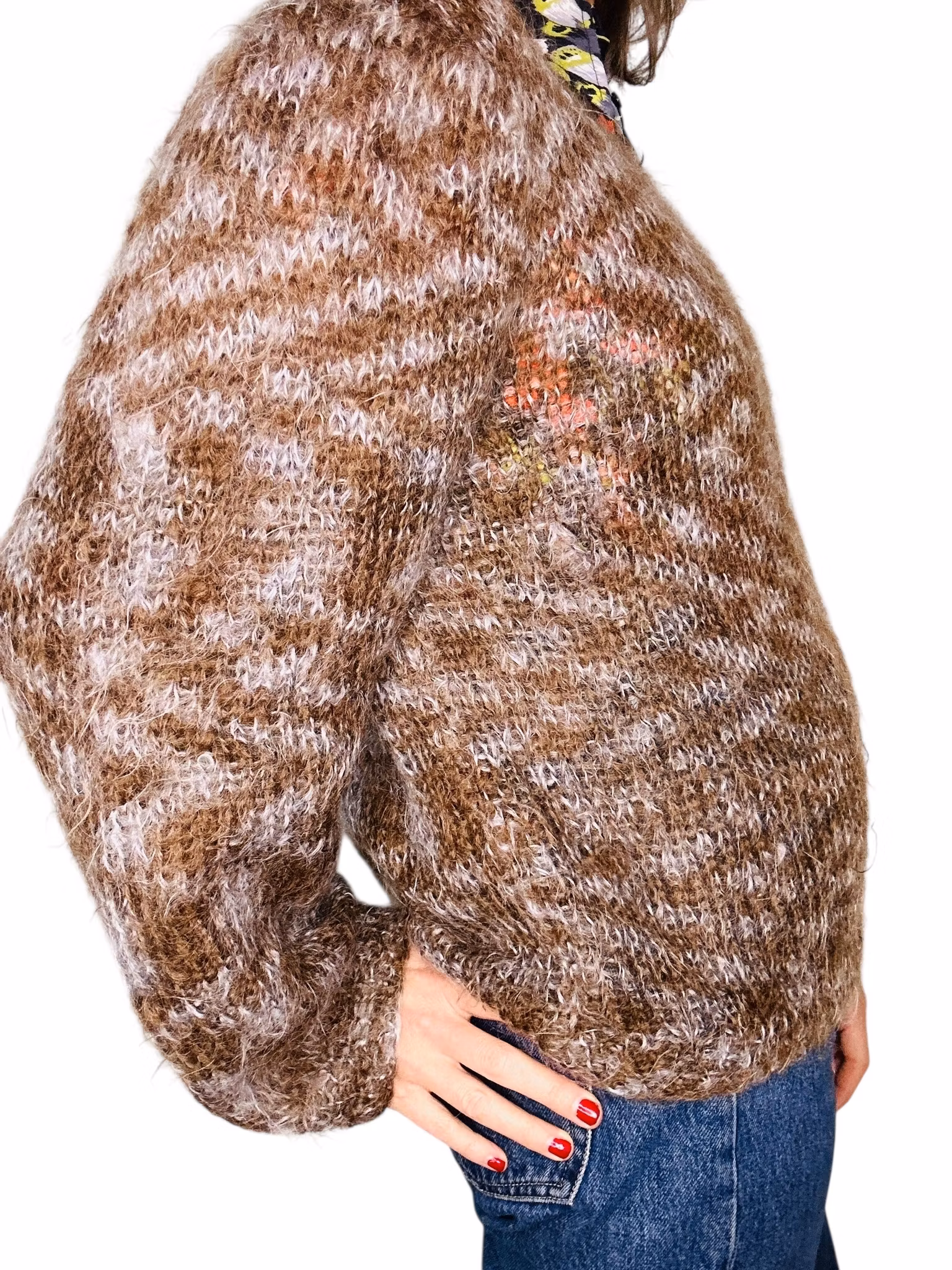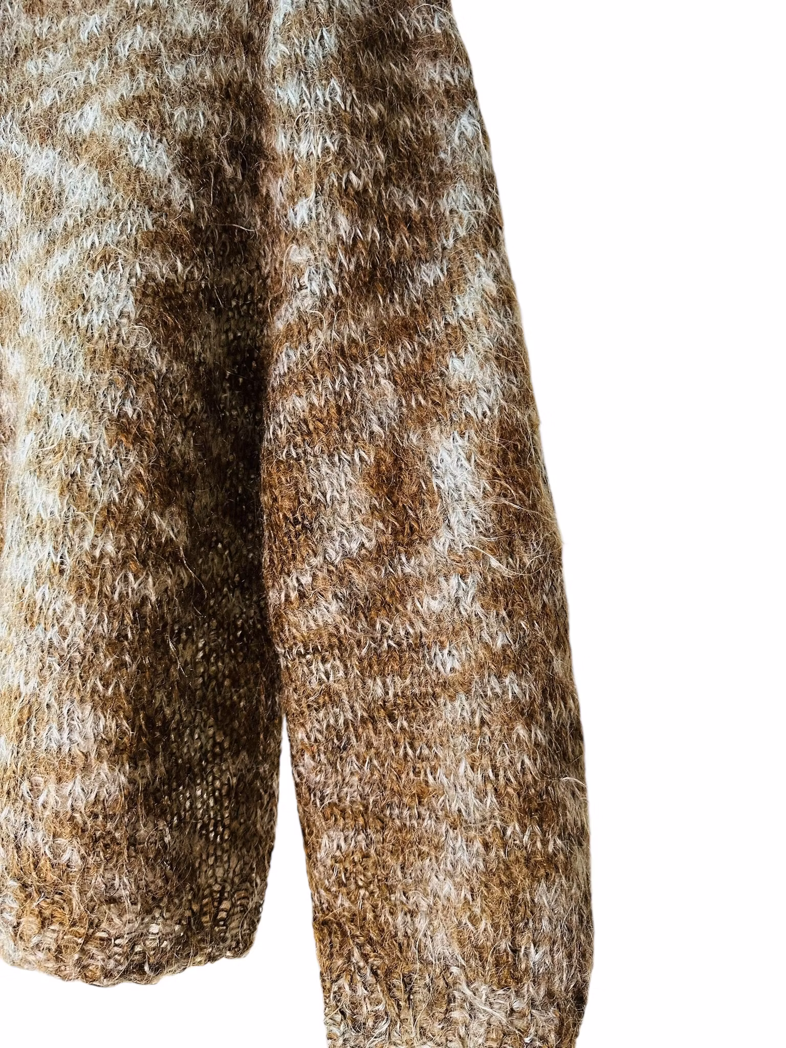 Beskrivning: Handstickad tröja i härlig modell med luftiga ärmar i fluffigt garn. Det är hårigt och mjukt och uppskattas vara någon typ av mohairblandning. Färgerna går i brunt och grått med ett zickzackmönster. Rund hals.