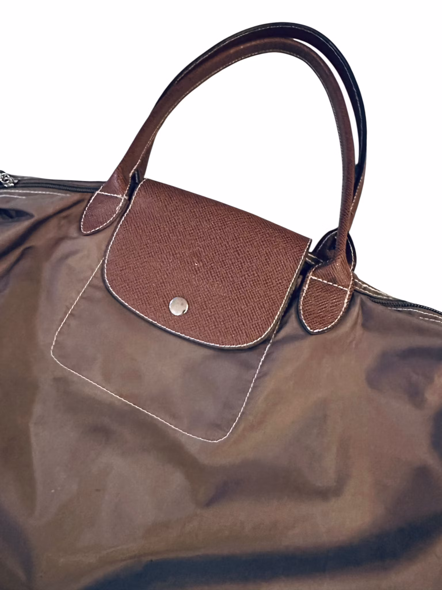 Beskrivning: Perfekt väska för den som inte vill investera i en dyr Longchamp. Kanske en skolväska? Här är en som är tydligt inspirerad av lyxmärket - med handtagen och det lilla locket i skinn, här i fuskskinn. Små knappar som kan göra den större och mindre. I en plastad canvas. Ofodrad. Finns några svaga fläckar, se bilder.